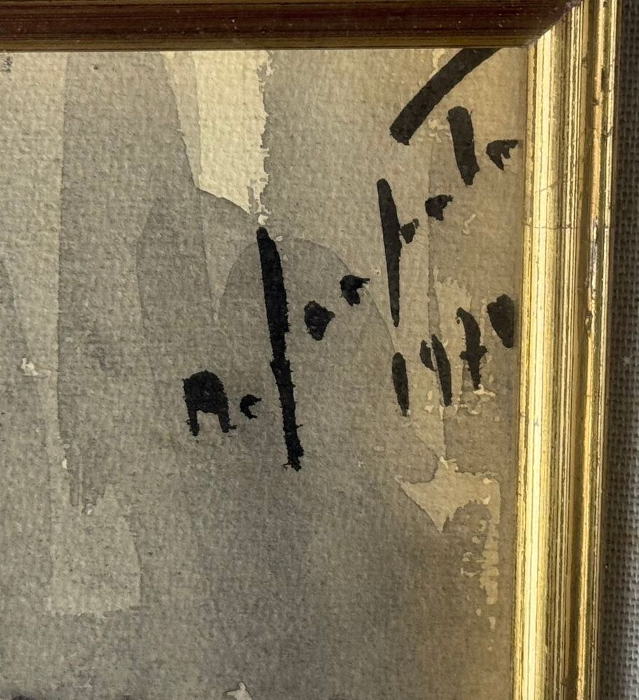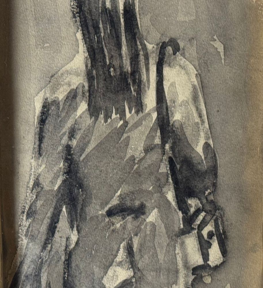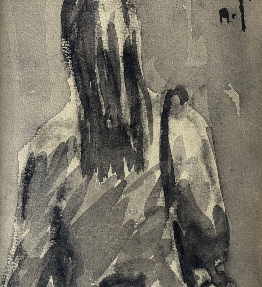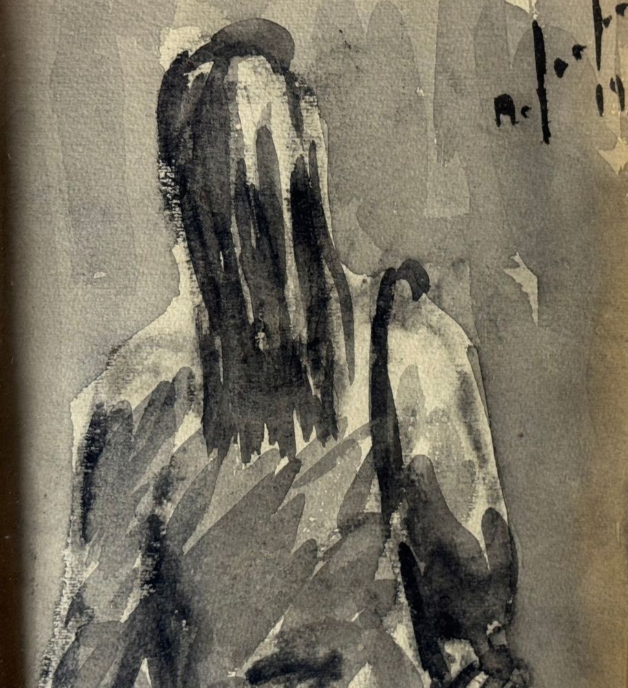 Watercolor painting on paper, 20th century period, Italian school, depicting a Portrait of a Woman from Behind. Dimensions including frame: 35x64 cm. Dimensions without frame: 18x48 cm. Signed in the upper right corner by an unidentified artist. The work is in good condition.