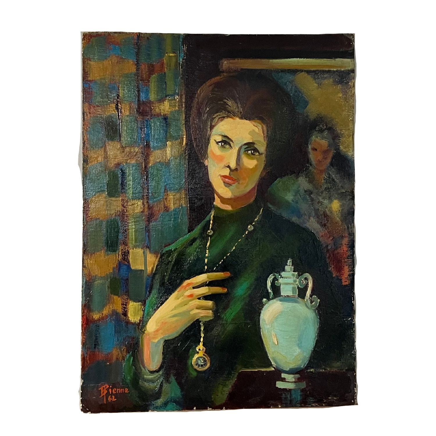 Oil painting on canvas attached to panel, from the year 1962 depicting Portrait of a Woman in a Green Dress.