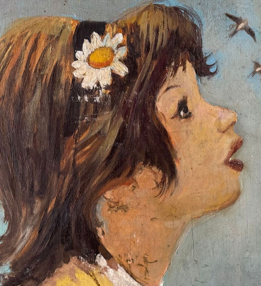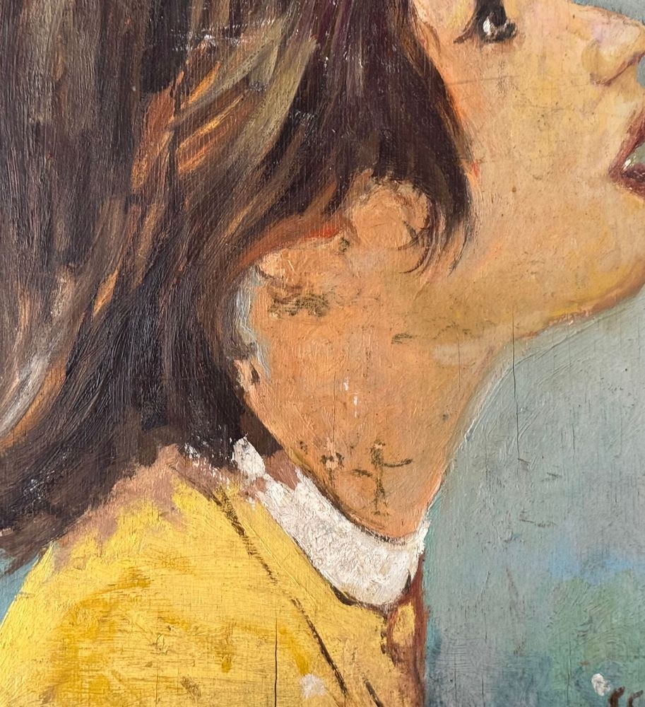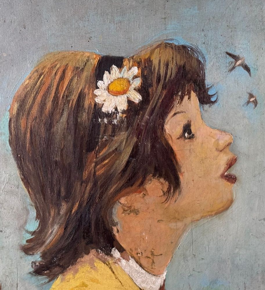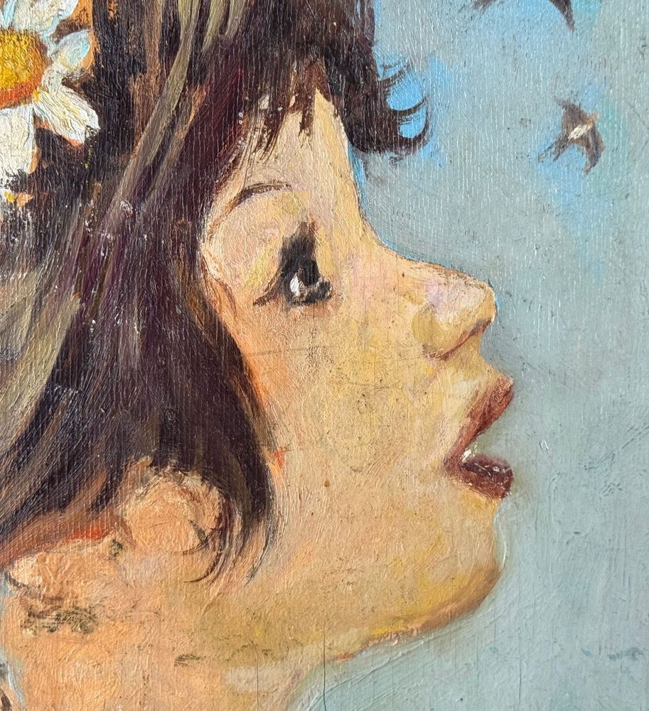 Oil on panel painting, 20th century, Italian school, depicting the profile of a young girl. Dimensions: 38 x 48 cm. Signed lower right by an unidentified artist. The artwork is in good condition, with slight signs of age as shown in the attached photos.