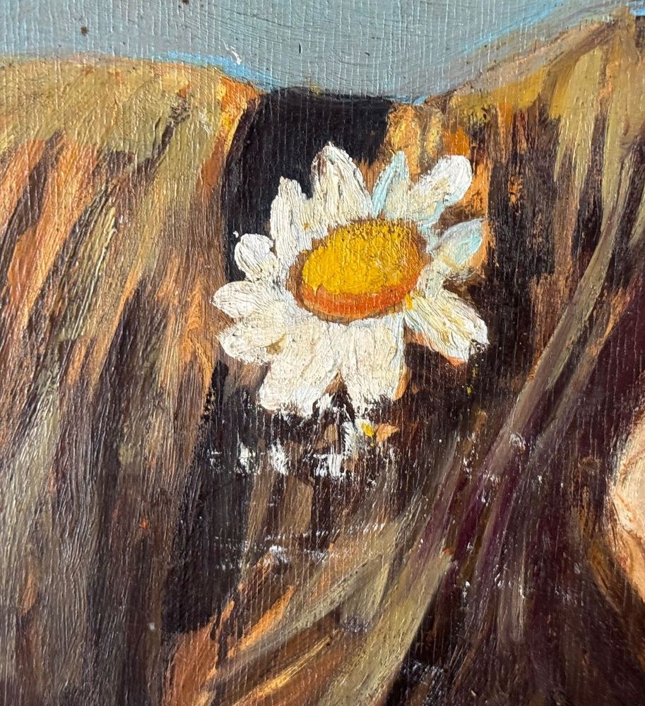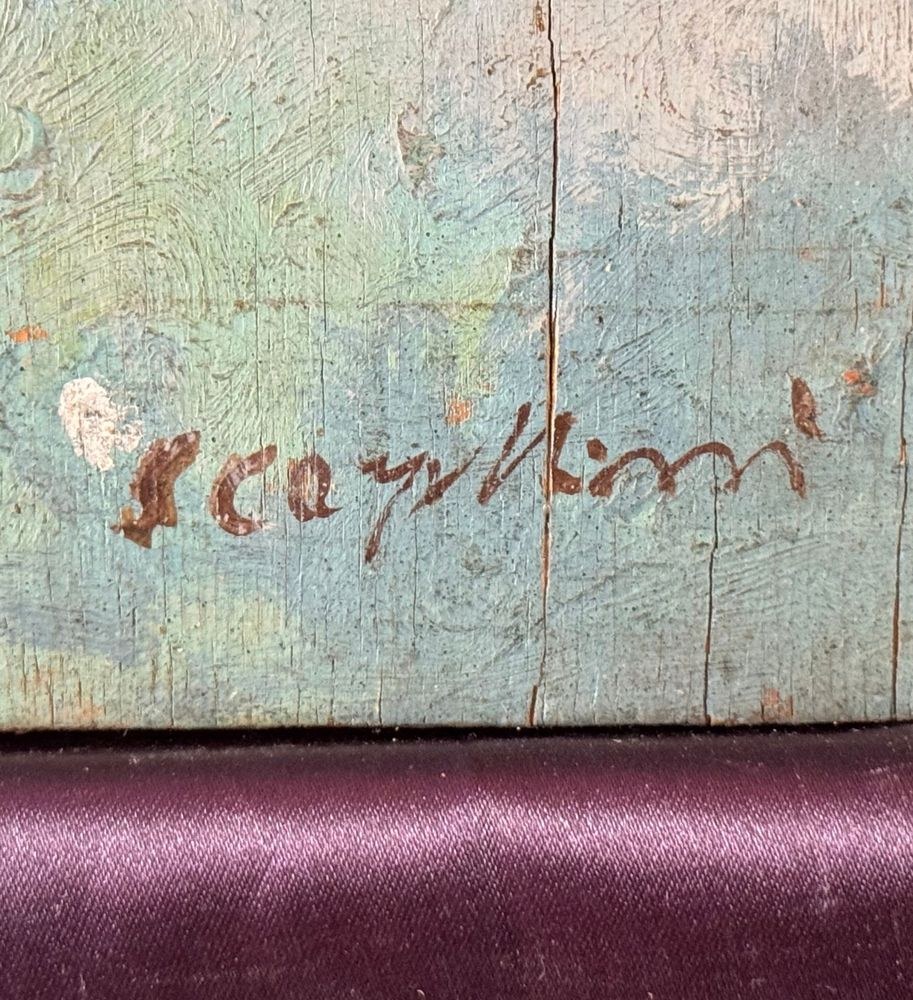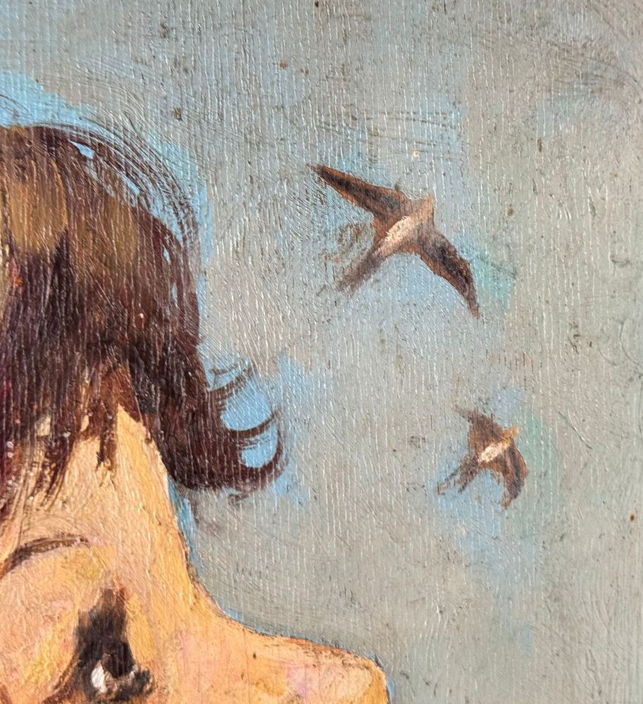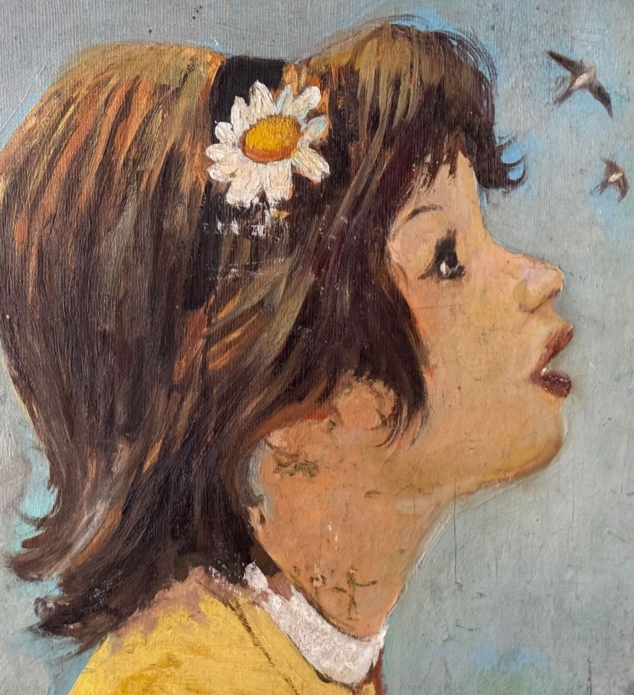 Oil on panel painting, 20th century, Italian school, depicting the profile of a young girl. Dimensions: 38 x 48 cm. Signed lower right by an unidentified artist. The artwork is in good condition, with slight signs of age as shown in the attached photos.