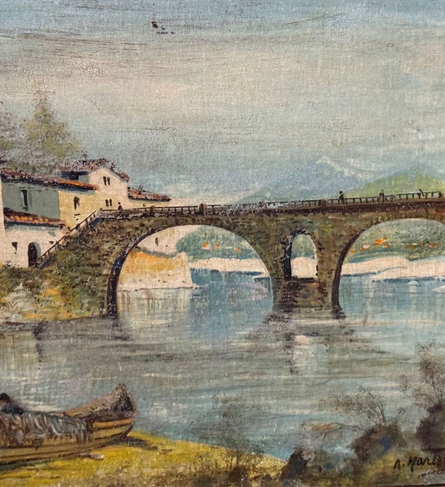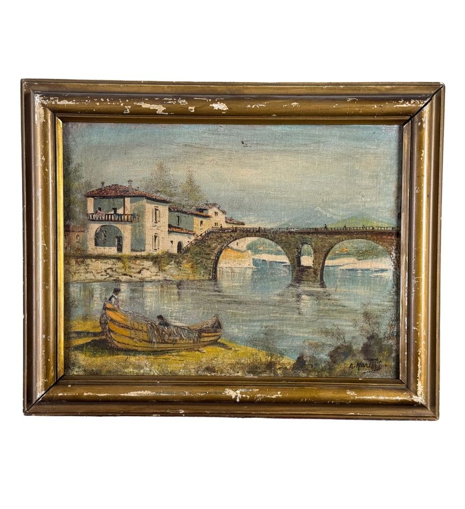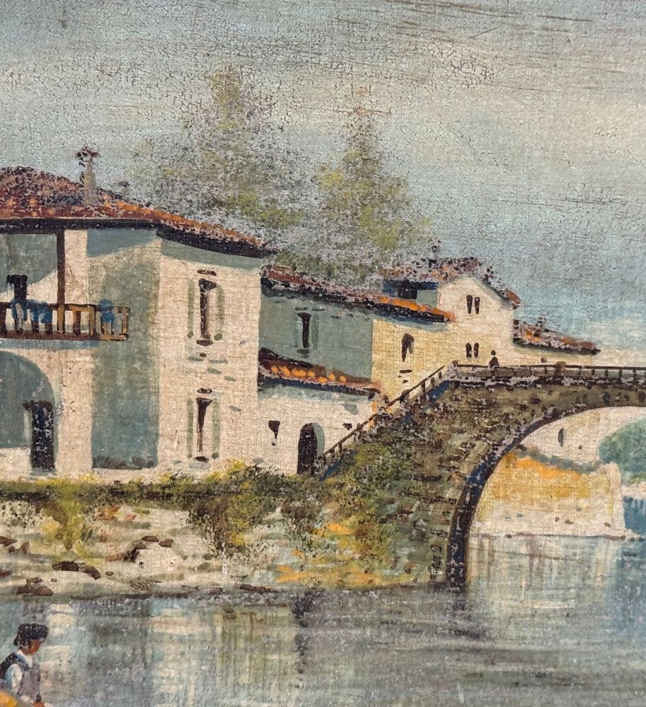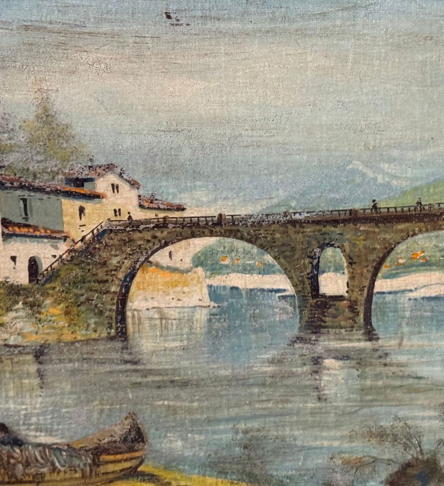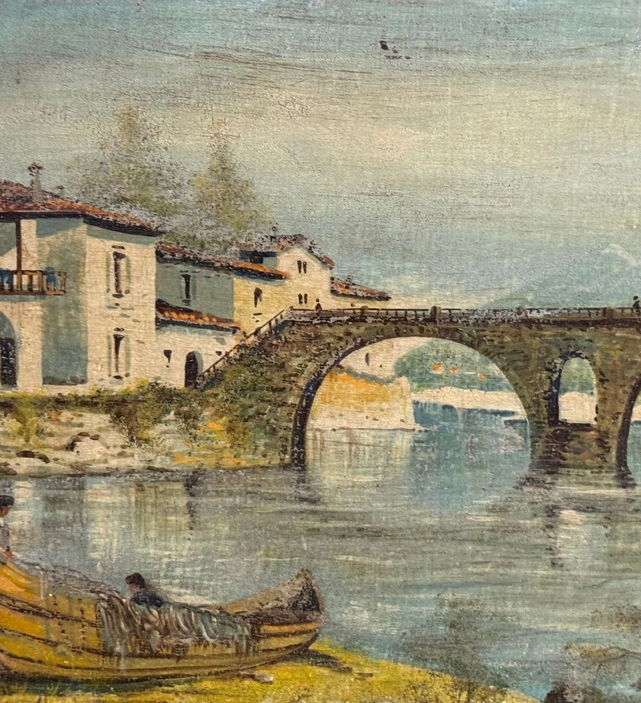 Oil painting on canvas, 19th century, Italian school depicting a river with a bridge. Dimensions including frame: 48x39 cm. Inner frame dimensions: 40x30 cm. Signed at the bottom right by an unidentified artist. Artwork in good condition.