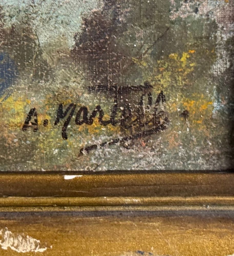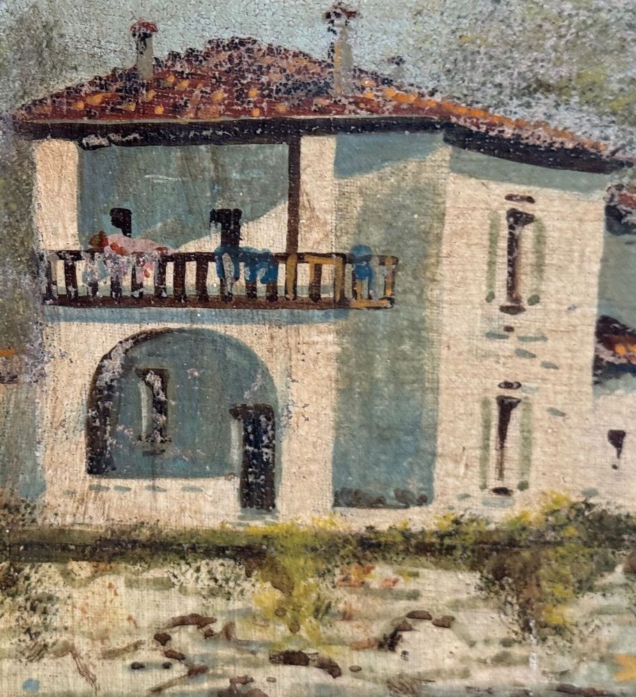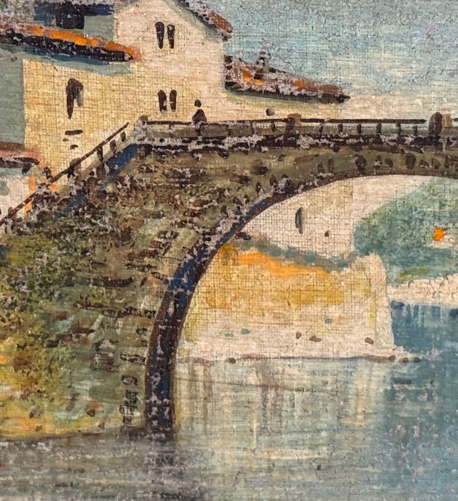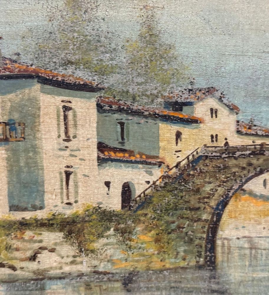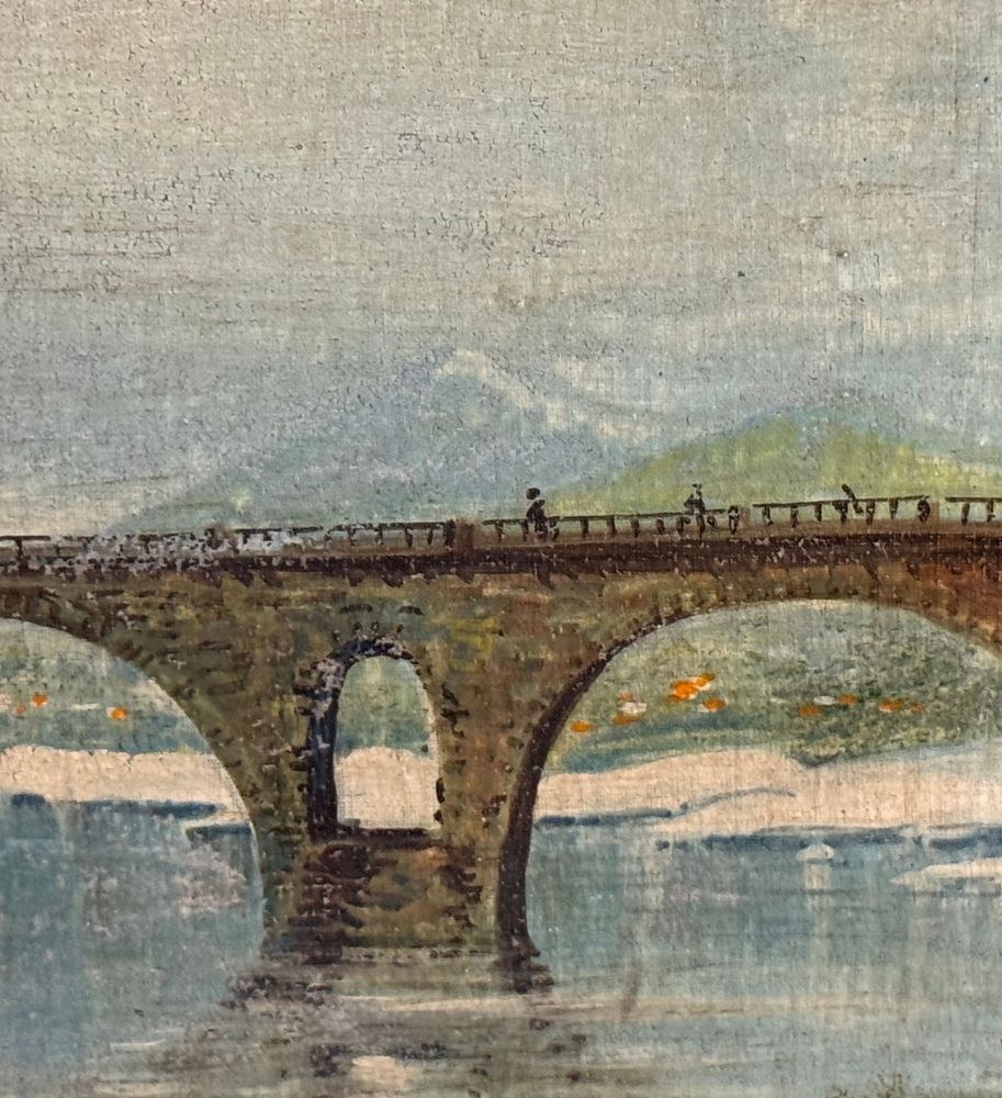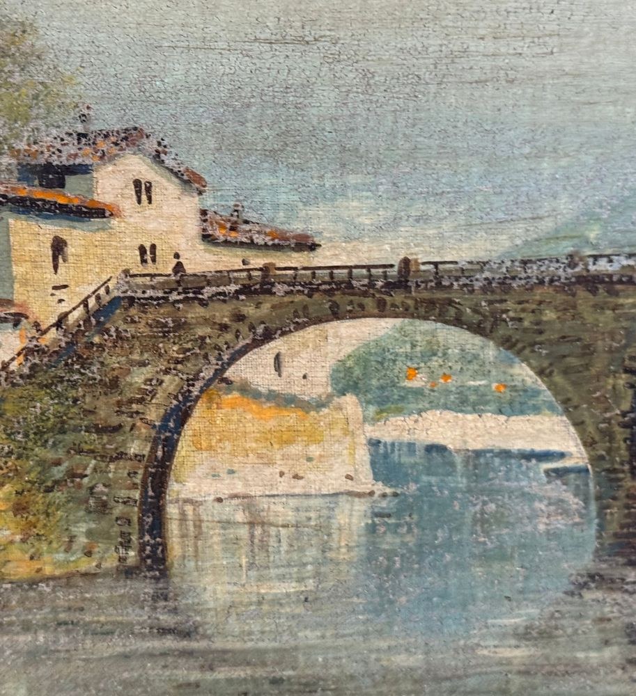 Oil painting on canvas, 19th century, Italian school depicting a river with a bridge. Dimensions including frame: 48x39 cm. Inner frame dimensions: 40x30 cm. Signed at the bottom right by an unidentified artist. Artwork in good condition.