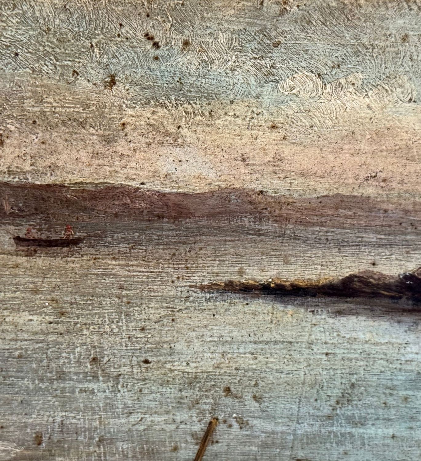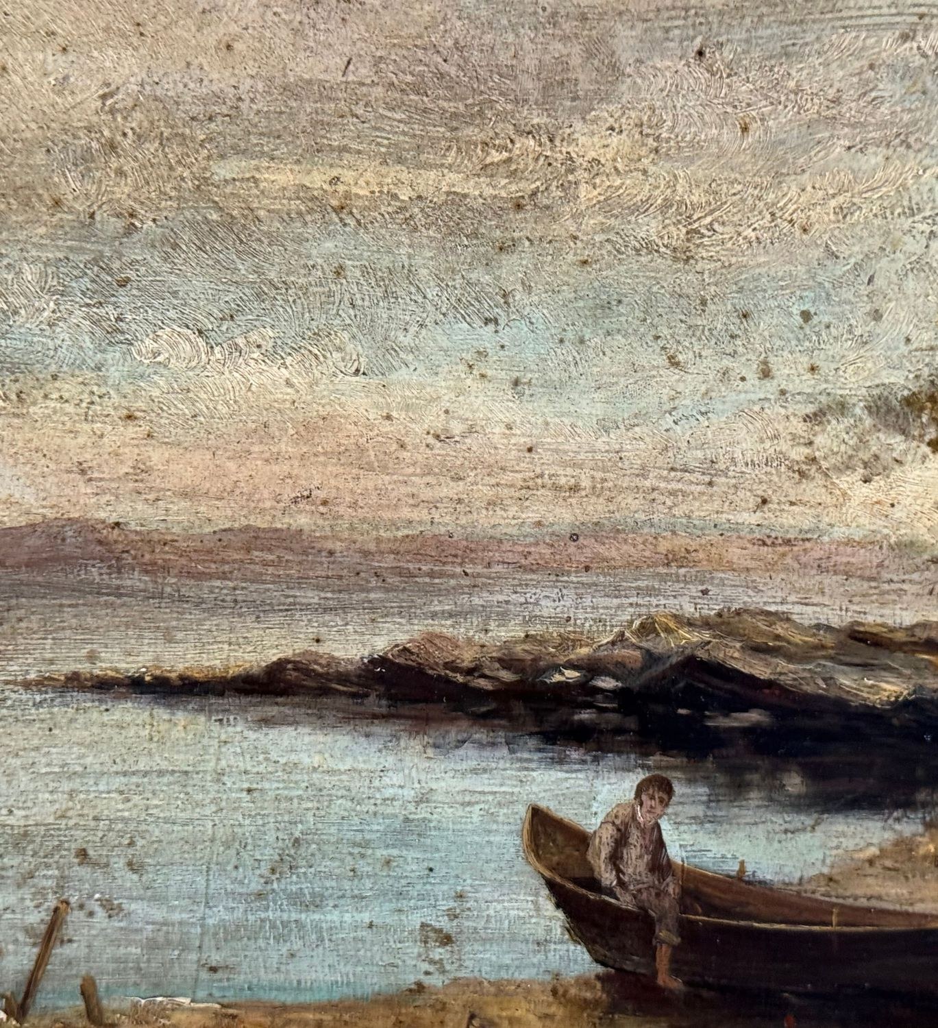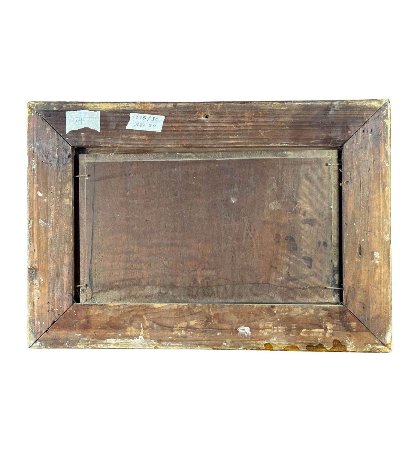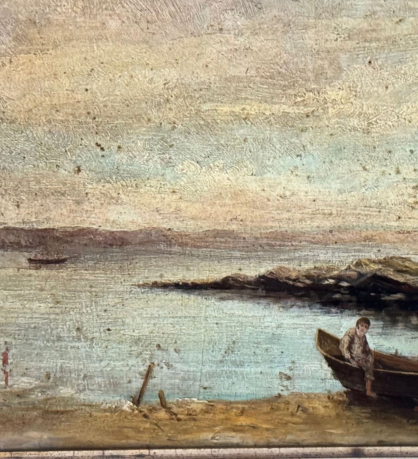 Oil on panel painting, 18th/19th century, Italian school, depicting a seascape. Dimensions including frame: 53 x 36 cm. Inner frame dimensions: 39 x 23 cm. Signed lower right by an unidentified artist. The artwork is in good condition, with slight signs of age as shown in the attached photos.