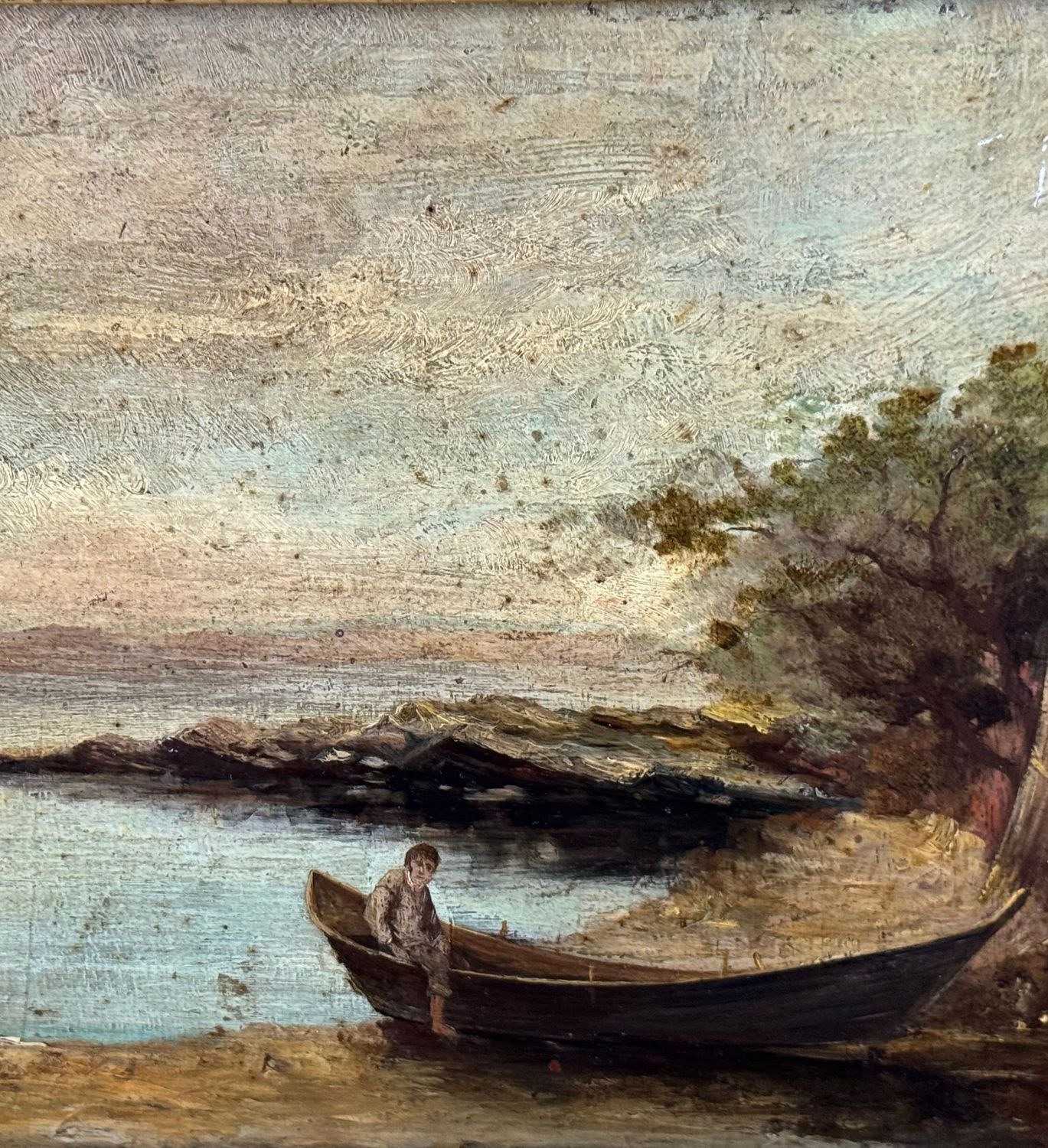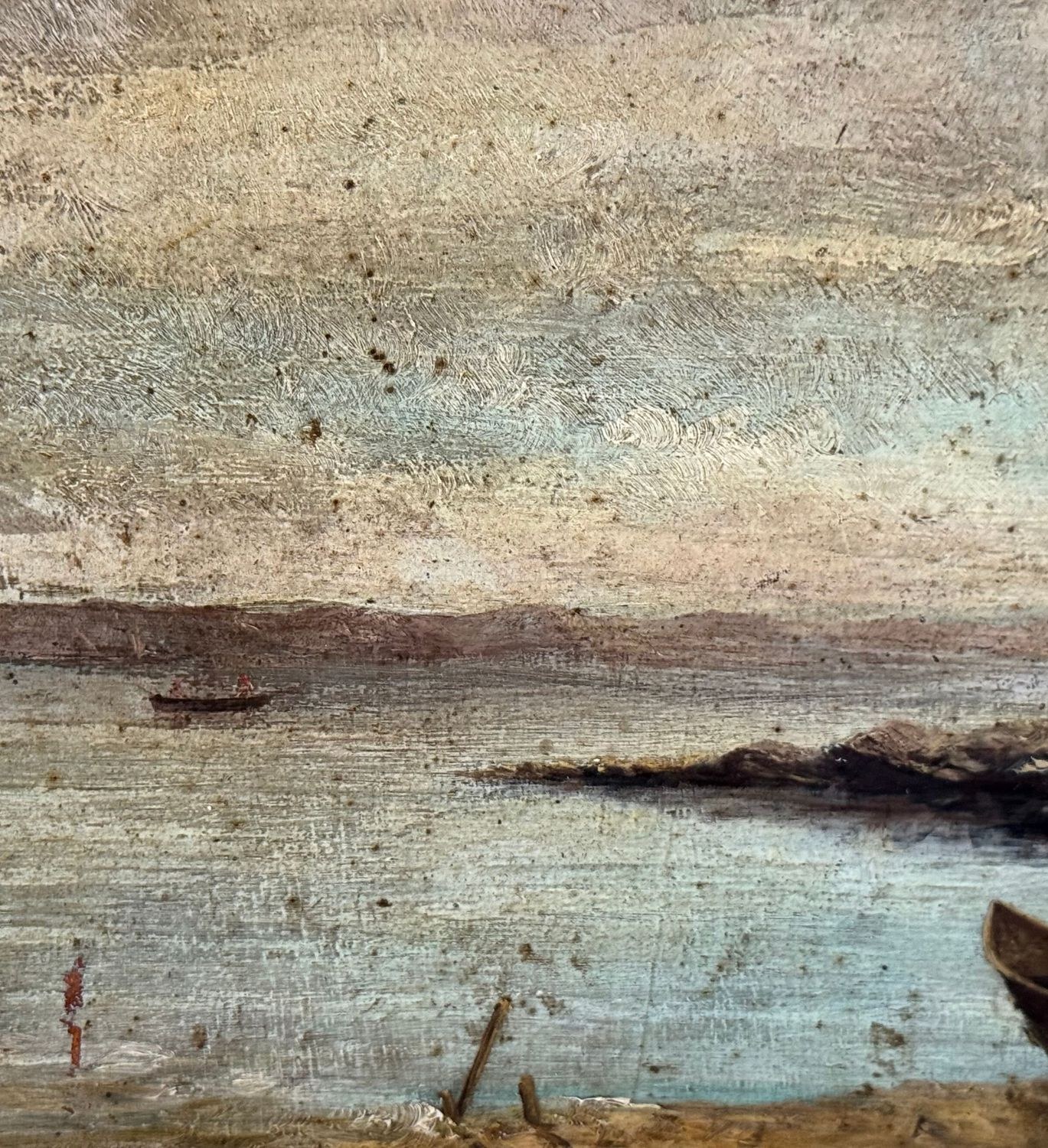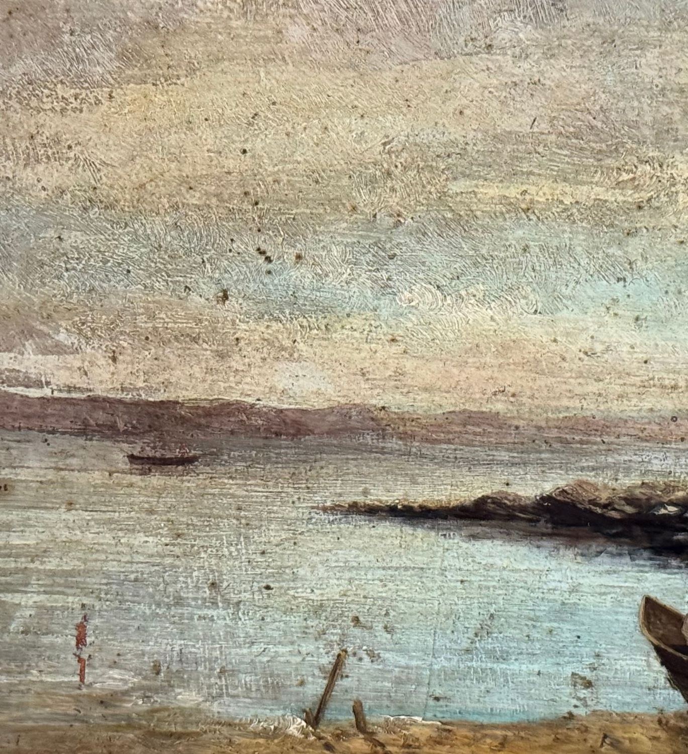 Oil on panel painting, 18th/19th century, Italian school, depicting a seascape. Dimensions including frame: 53 x 36 cm. Inner frame dimensions: 39 x 23 cm. Signed lower right by an unidentified artist. The artwork is in good condition, with slight signs of age as shown in the attached photos.