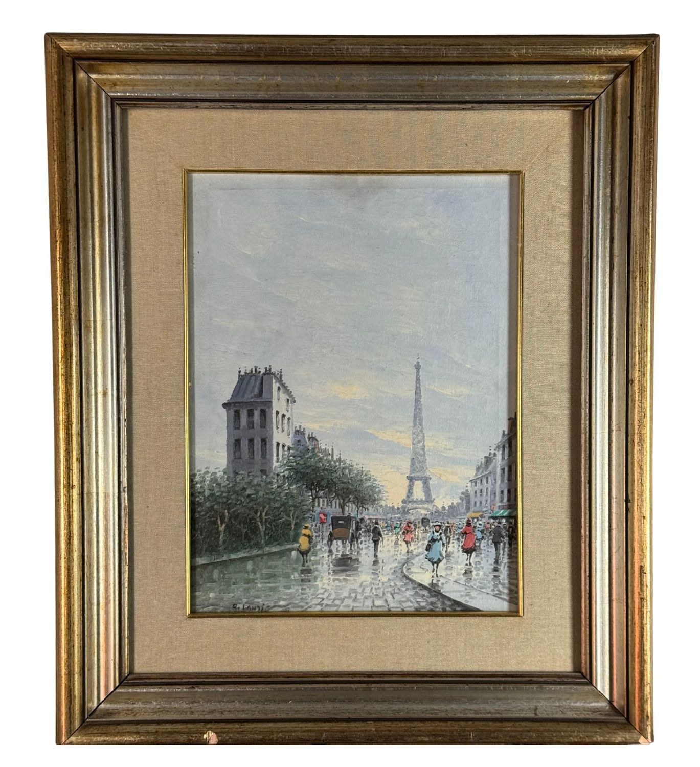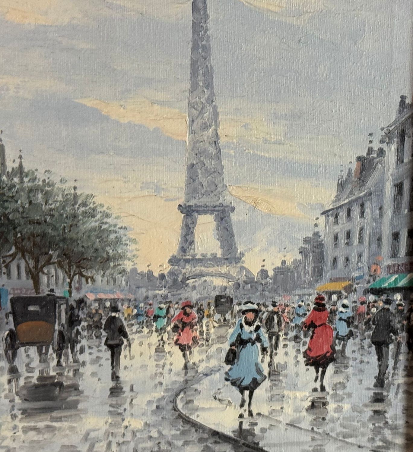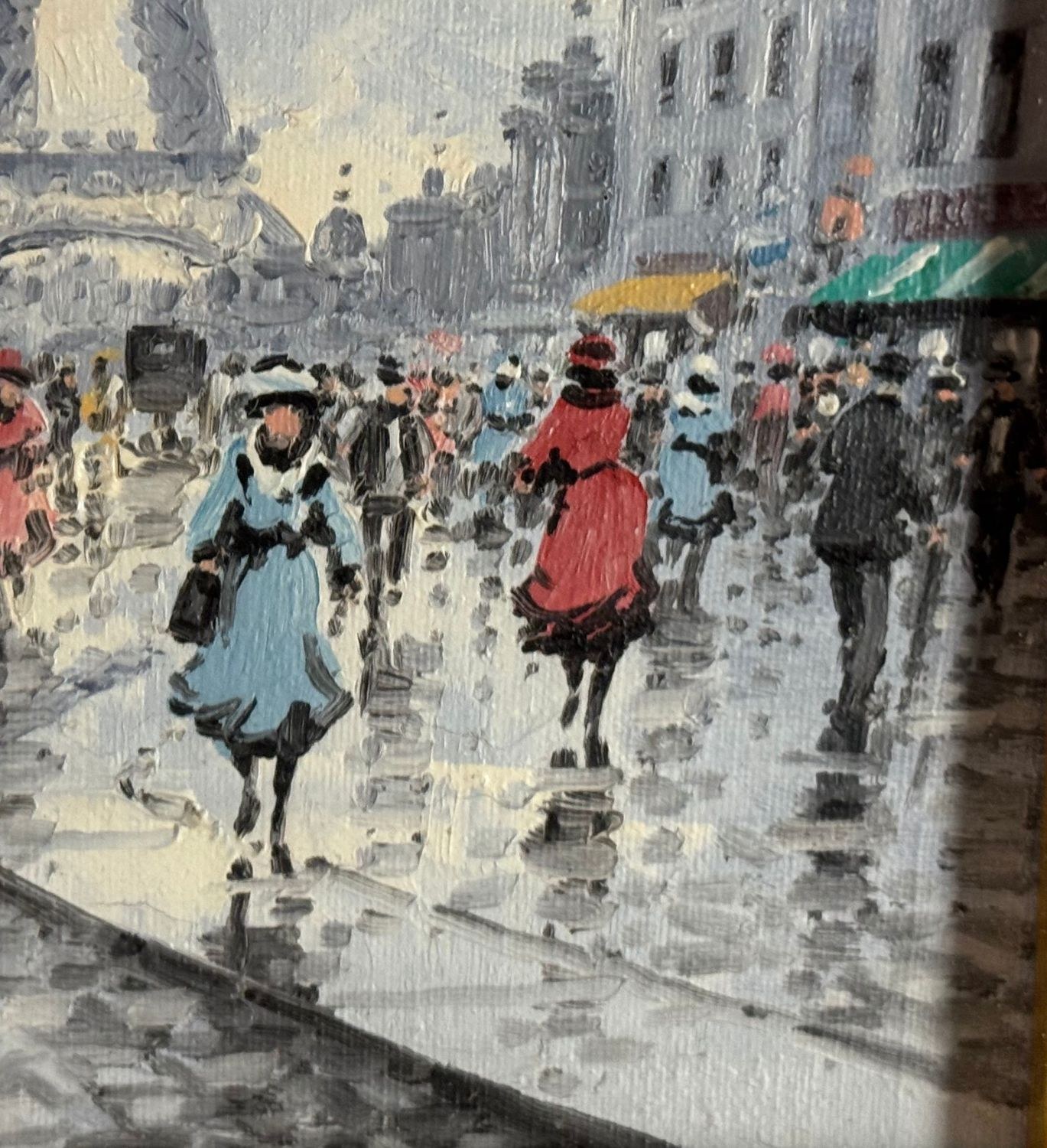 Oil painting on canvas, 20th-century period, Italian school, depicting Street in Paris. Dimensions including frame: 53x62 cm. Dimensions inside the frame: 30.5x40.5 cm. Signed at the lower left by an unidentified artist. Artwork in good condition.