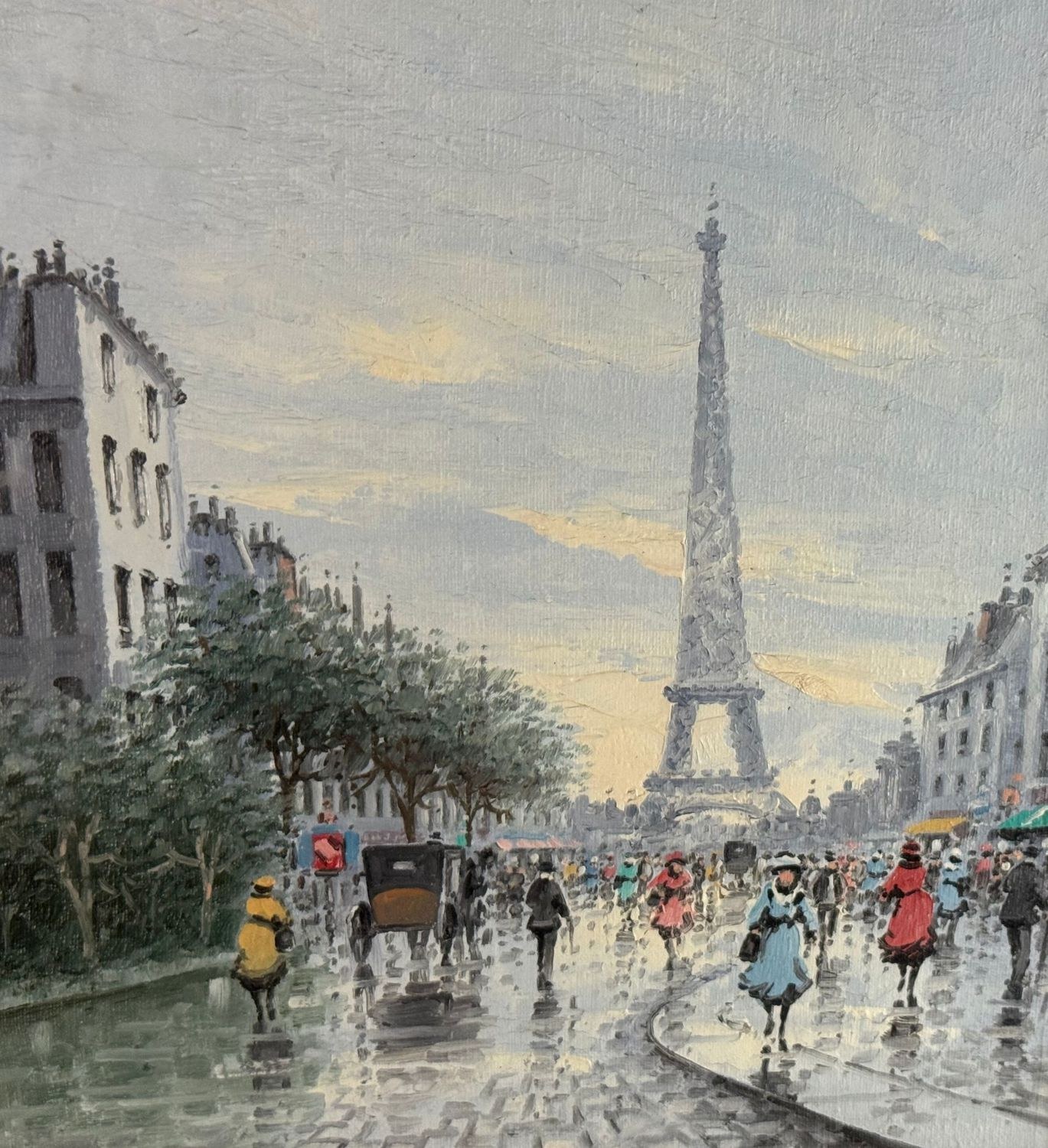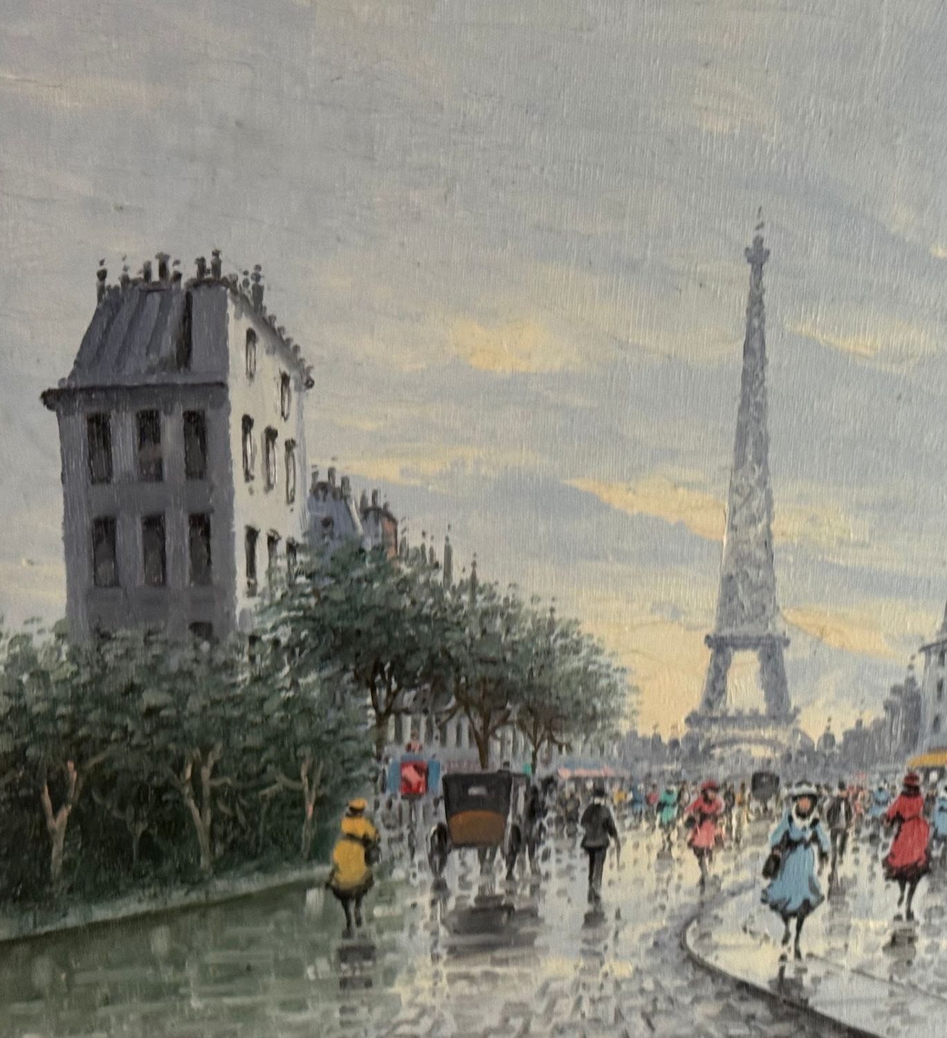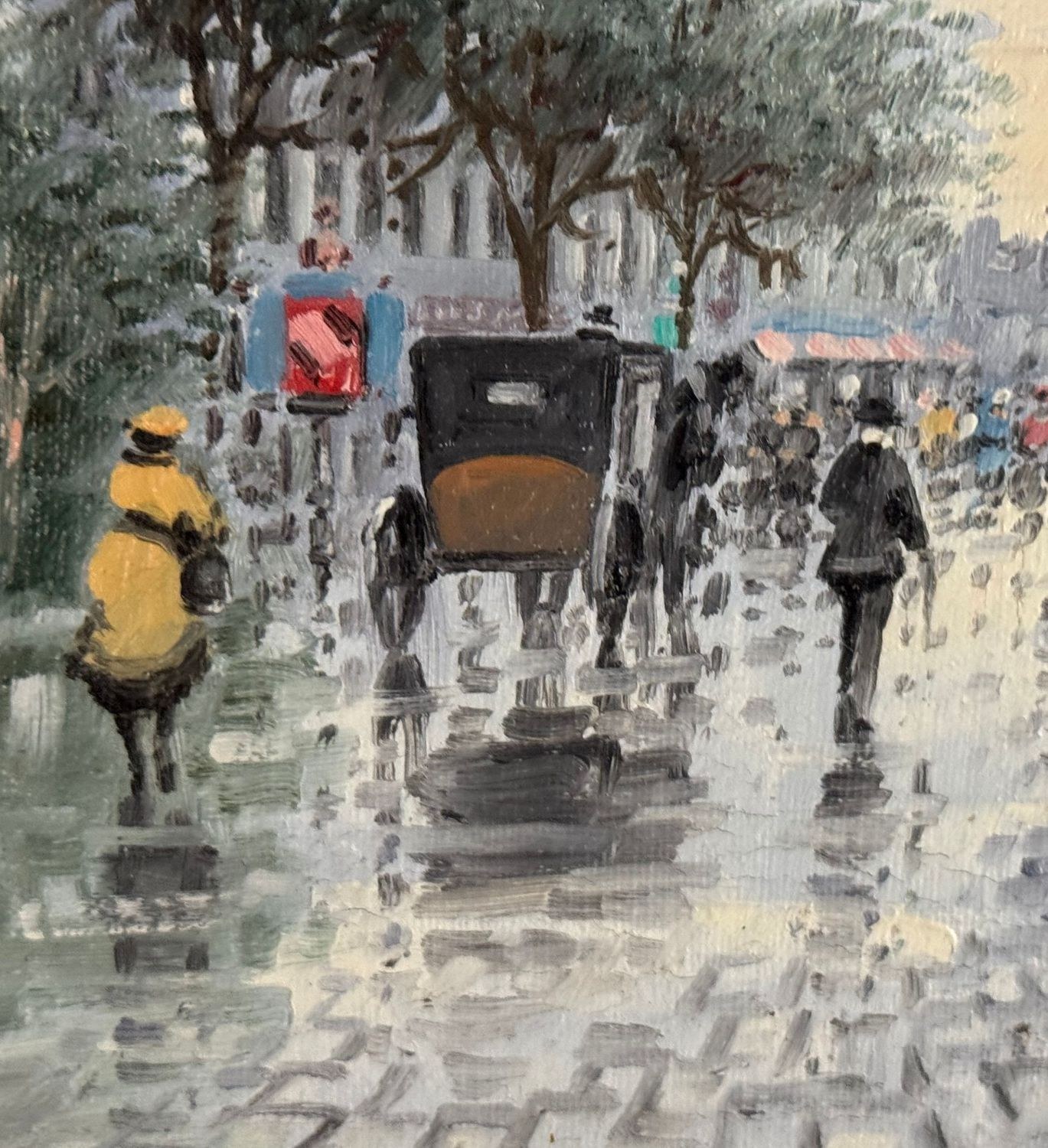 Oil painting on canvas, 20th-century period, Italian school, depicting Street in Paris. Dimensions including frame: 53x62 cm. Dimensions inside the frame: 30.5x40.5 cm. Signed at the lower left by an unidentified artist. Artwork in good condition.