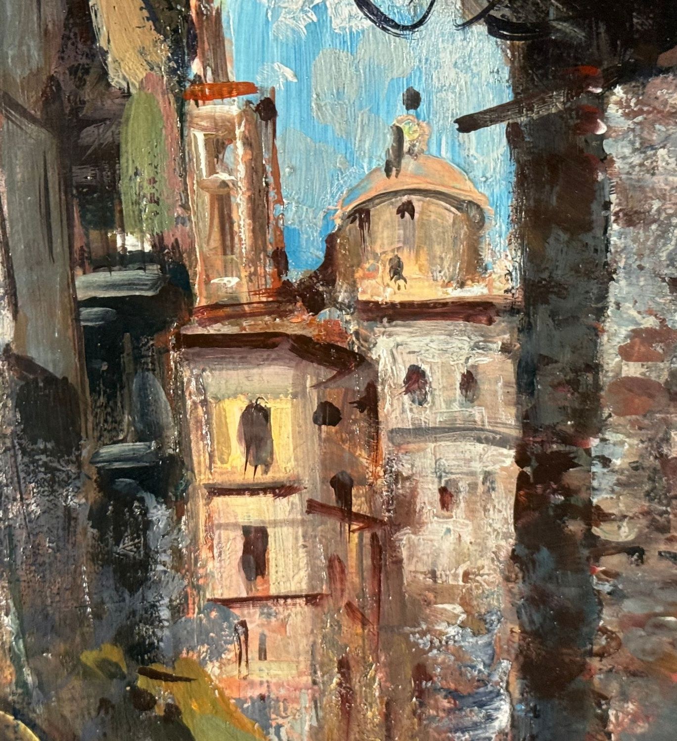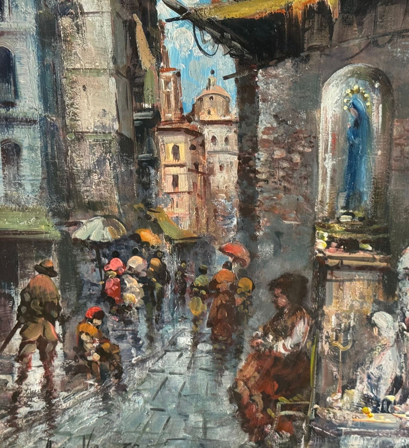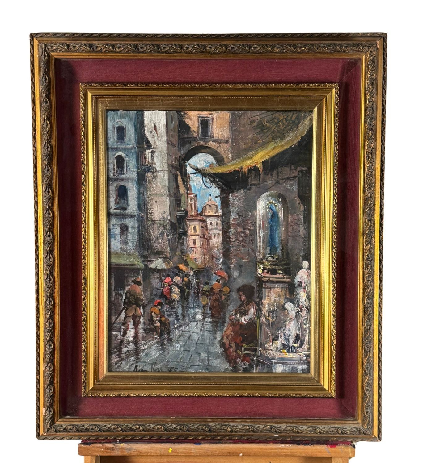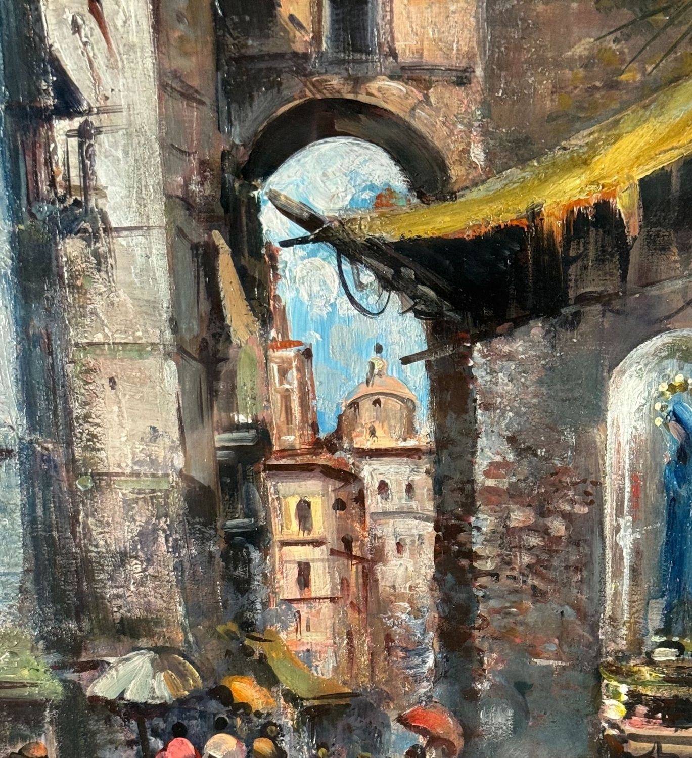 Oil on canvas painting, 20th century, Italian school, depicting a Street in San Gregorio Armeno. Dimensions including frame: 61 × 71 cm. Dimensions inside the frame: 38 × 48 cm. Signed and dated (1975) lower left by an unidentified artist. Authenticity label on the reverse. Work in good condition.