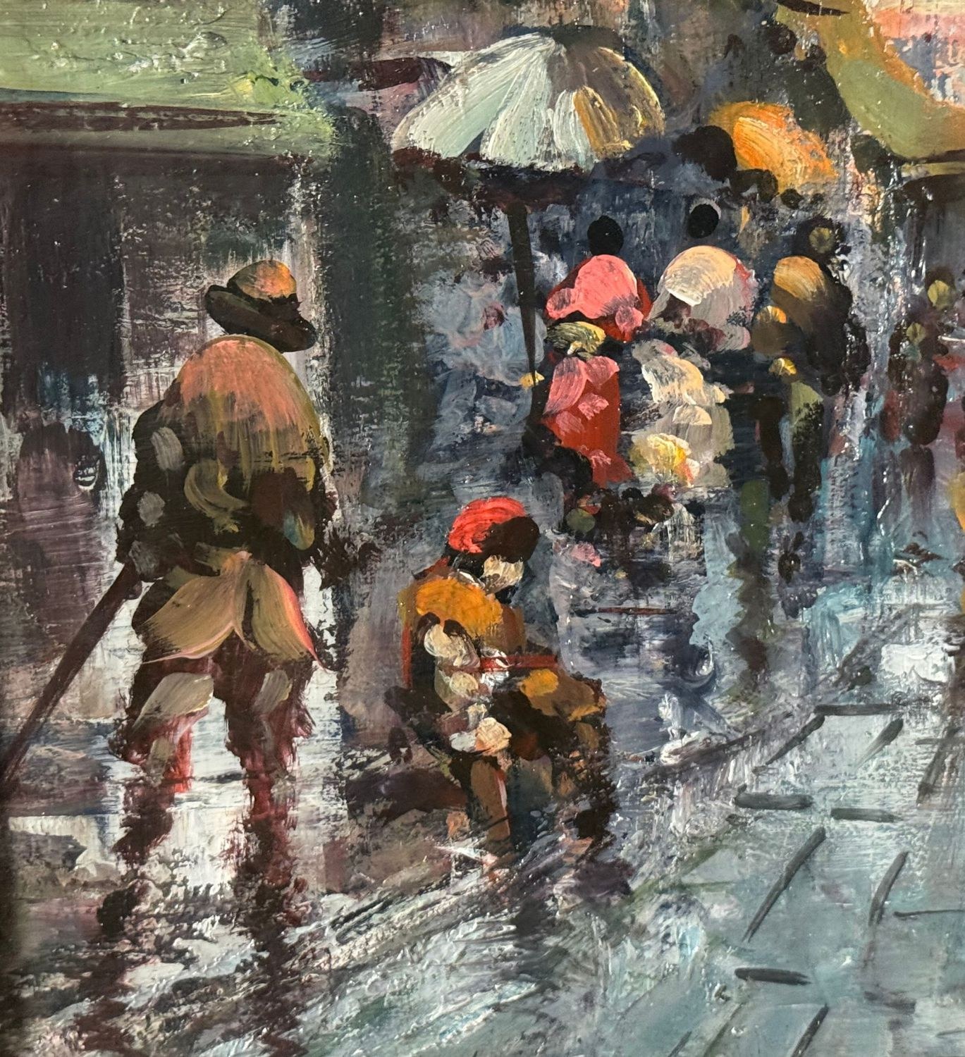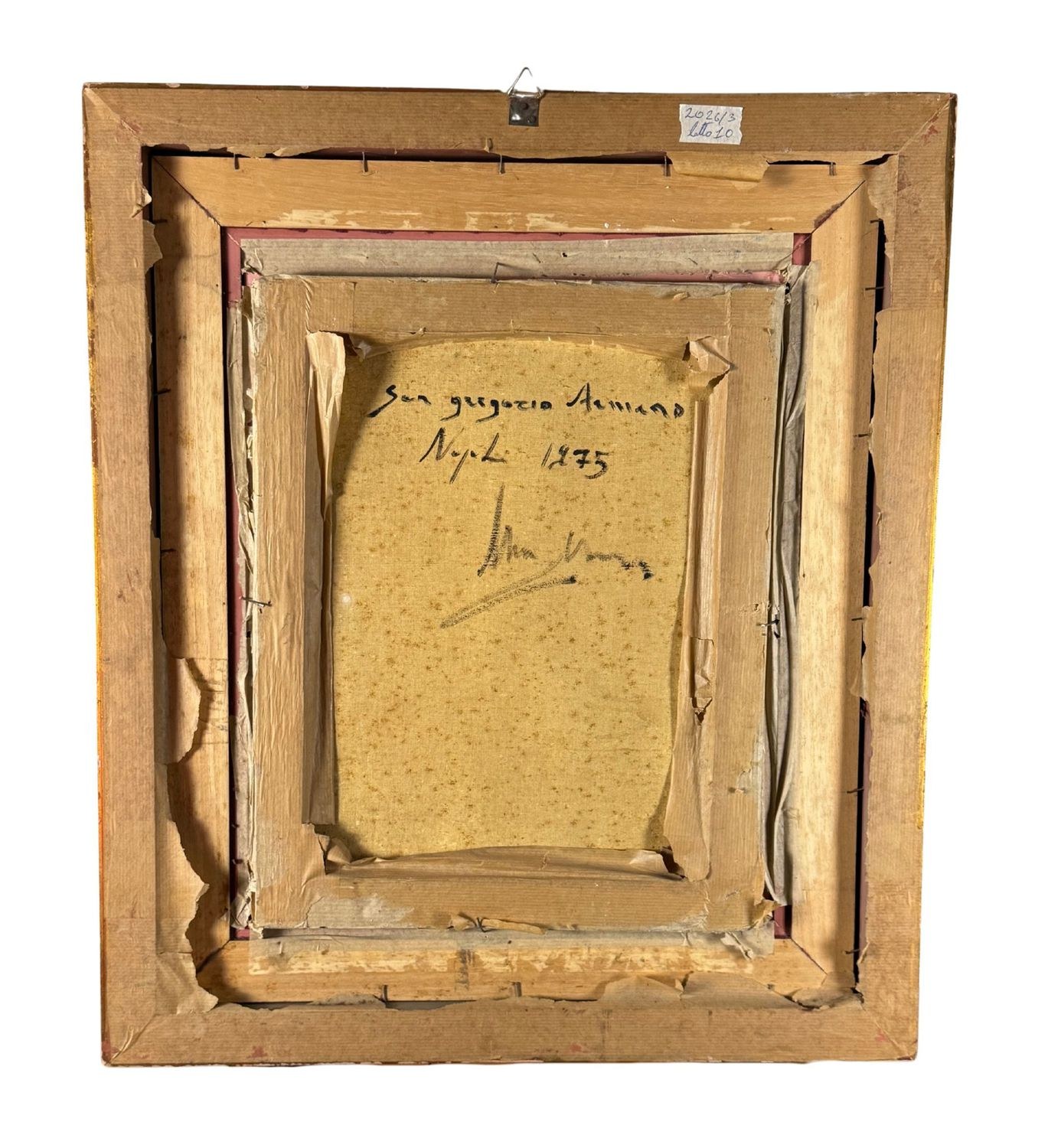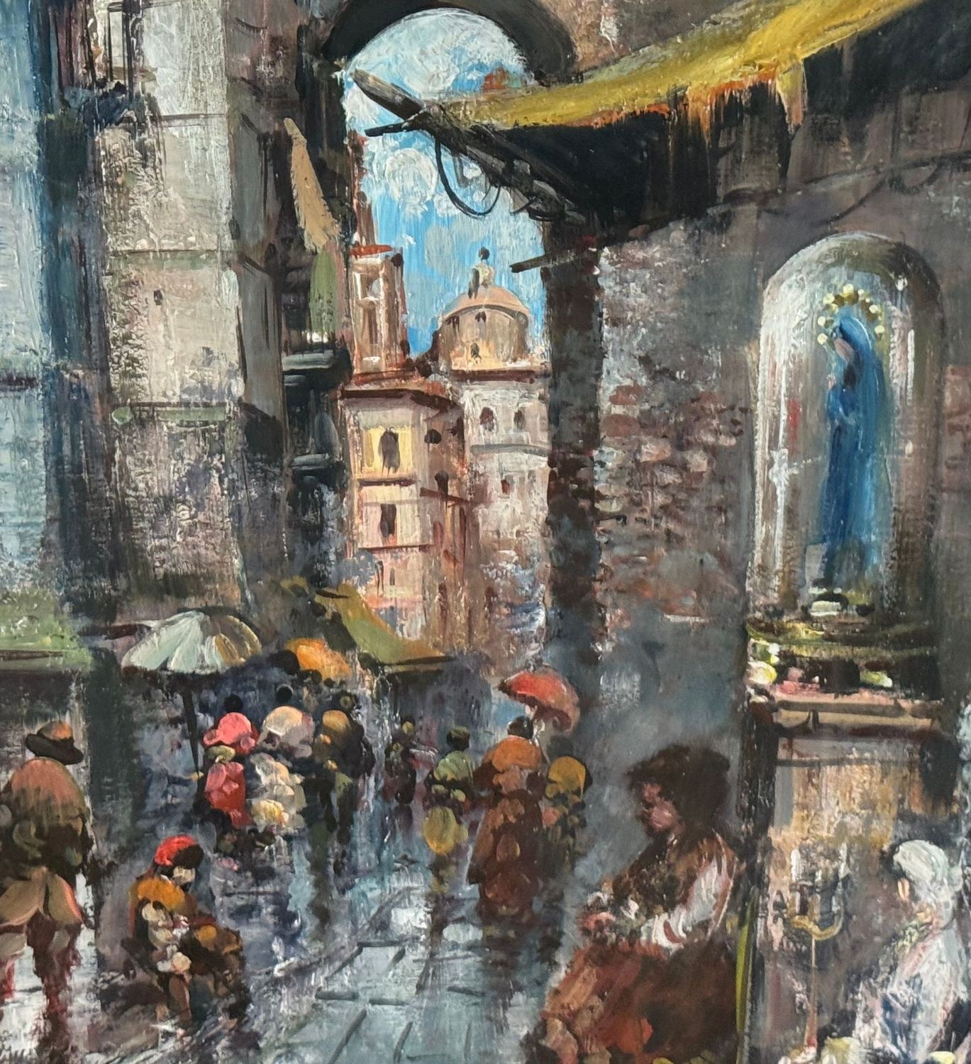 Oil on canvas painting, 20th century, Italian school, depicting a Street in San Gregorio Armeno. Dimensions including frame: 61 × 71 cm. Dimensions inside the frame: 38 × 48 cm. Signed and dated (1975) lower left by an unidentified artist. Authenticity label on the reverse. Work in good condition.