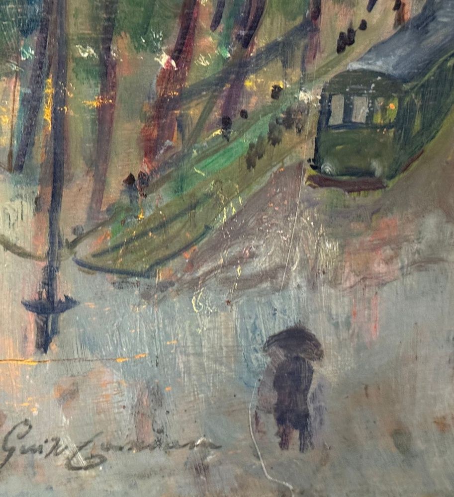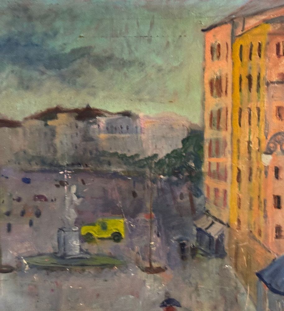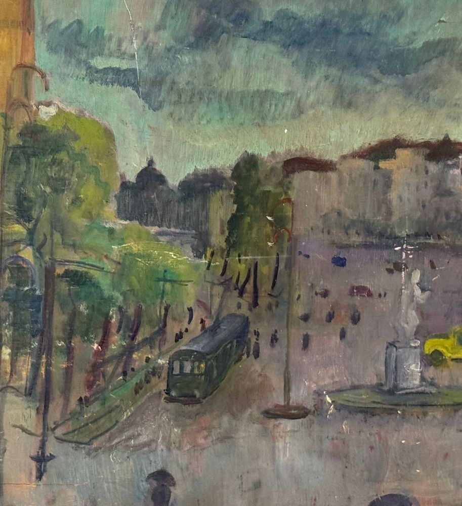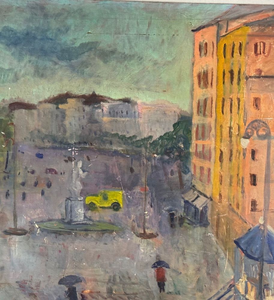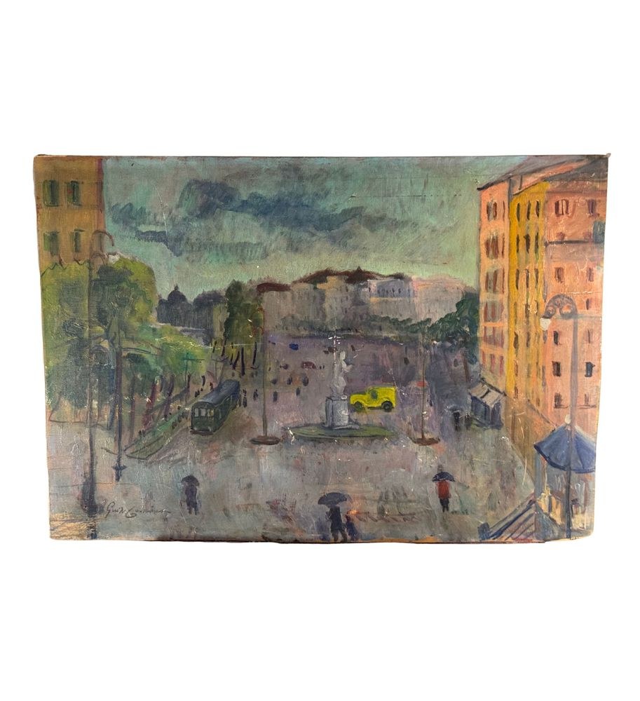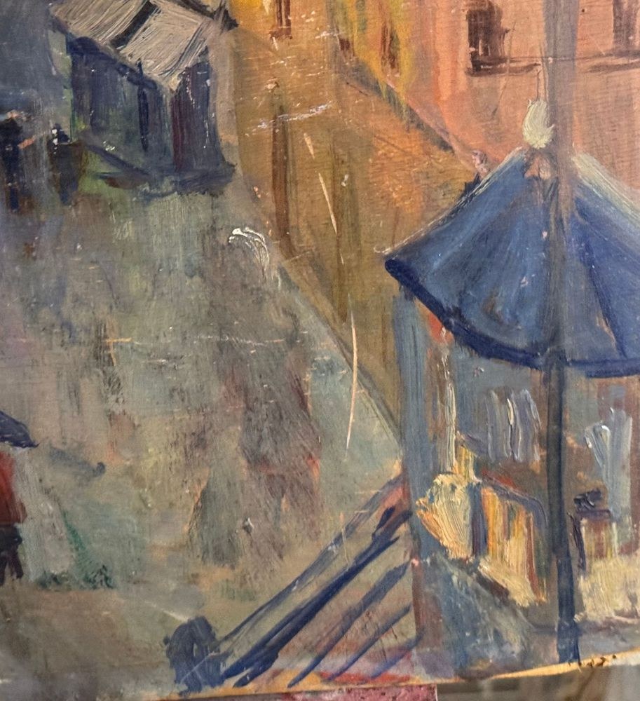 Acrylic painting on panel, 20th century period, Italian school depicting Street with figures. Dimensions: 65x45 cm. Signed at the bottom left by an unidentified artist. Work in good condition with slight signs of wear as shown in the attached photos.