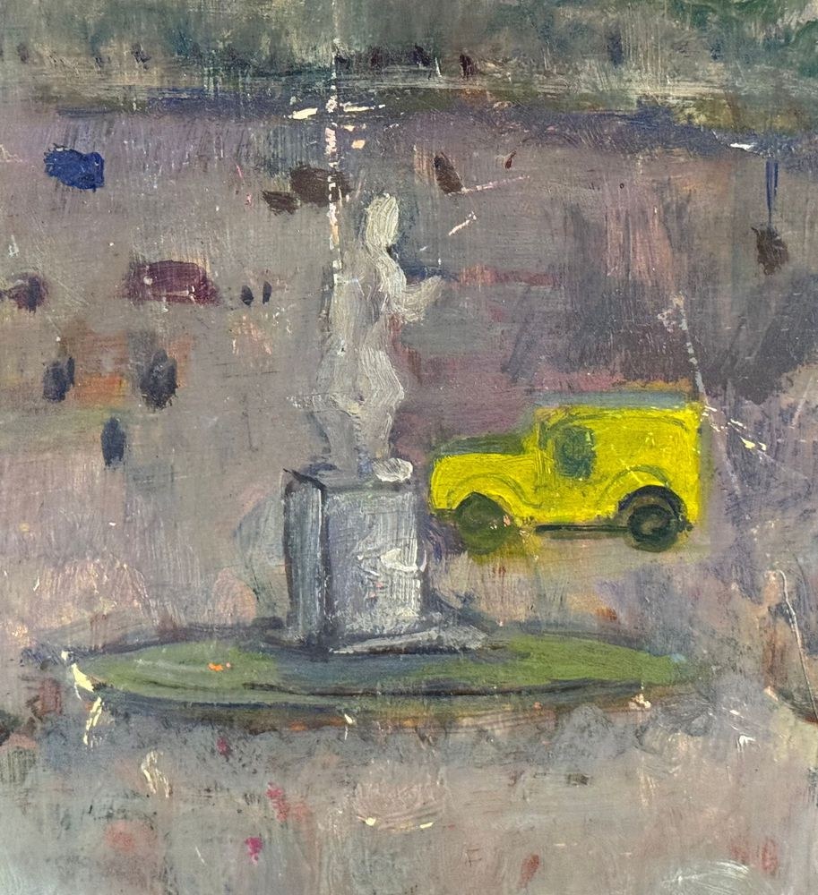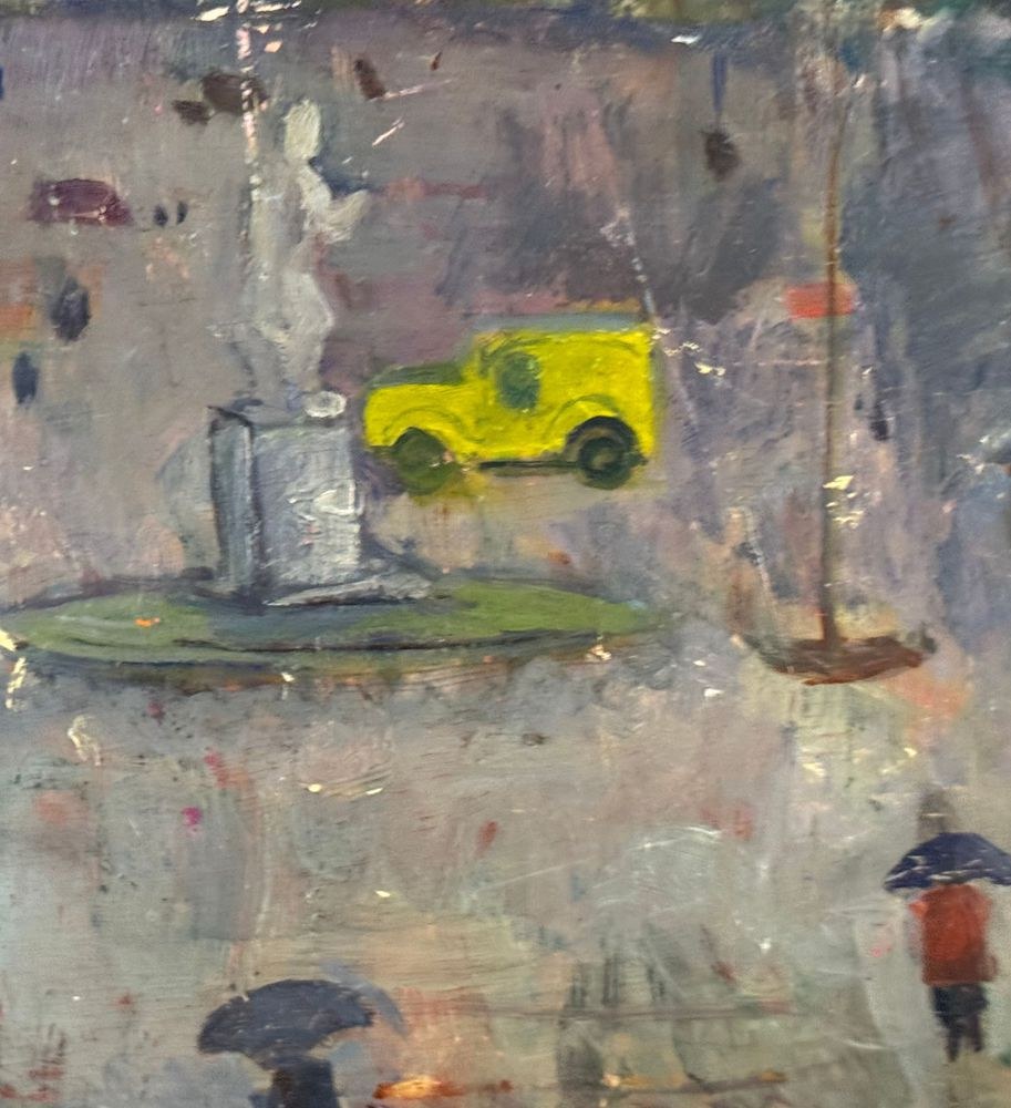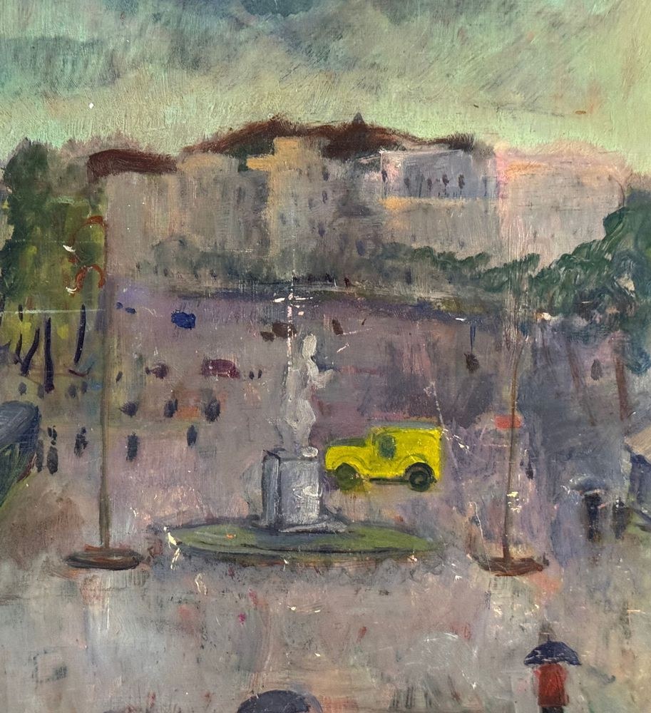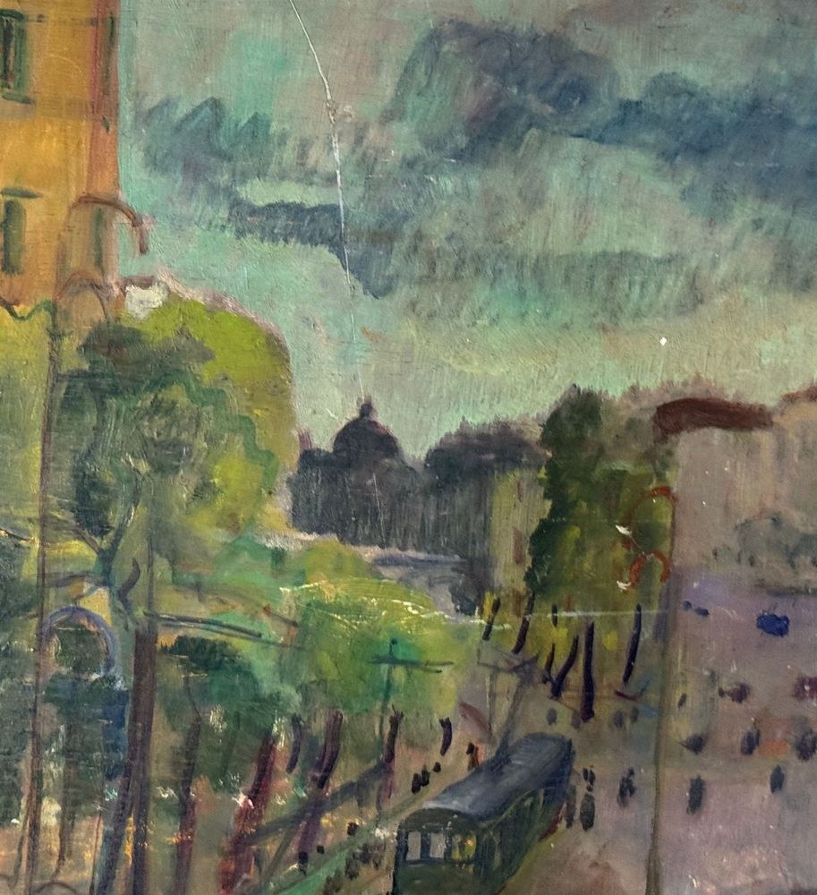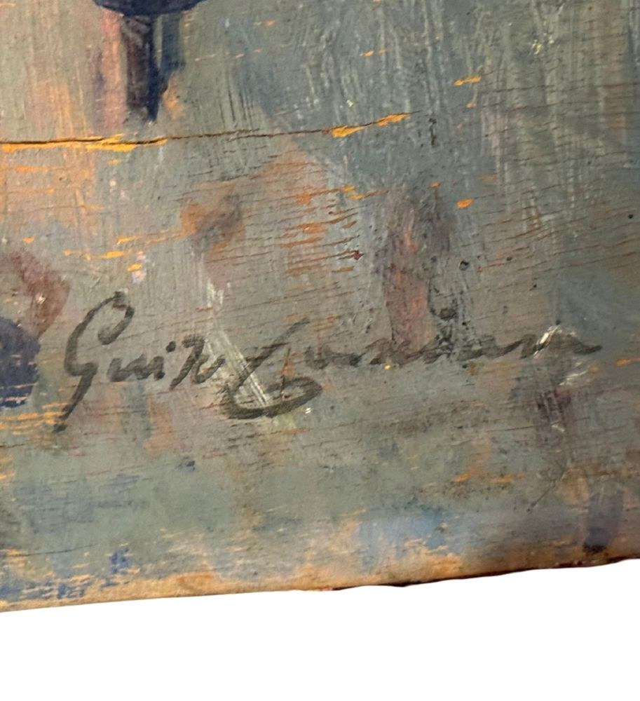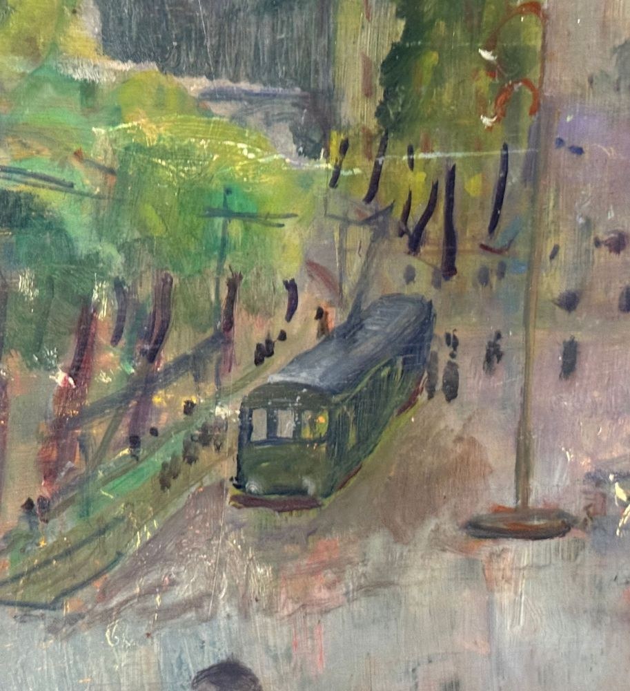 Acrylic painting on panel, 20th century period, Italian school depicting Street with figures. Dimensions: 65x45 cm. Signed at the bottom left by an unidentified artist. Work in good condition with slight signs of wear as shown in the attached photos.