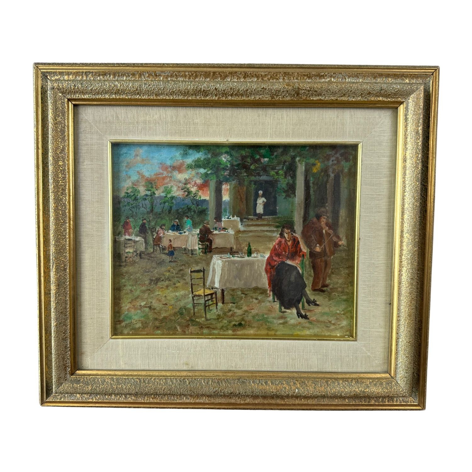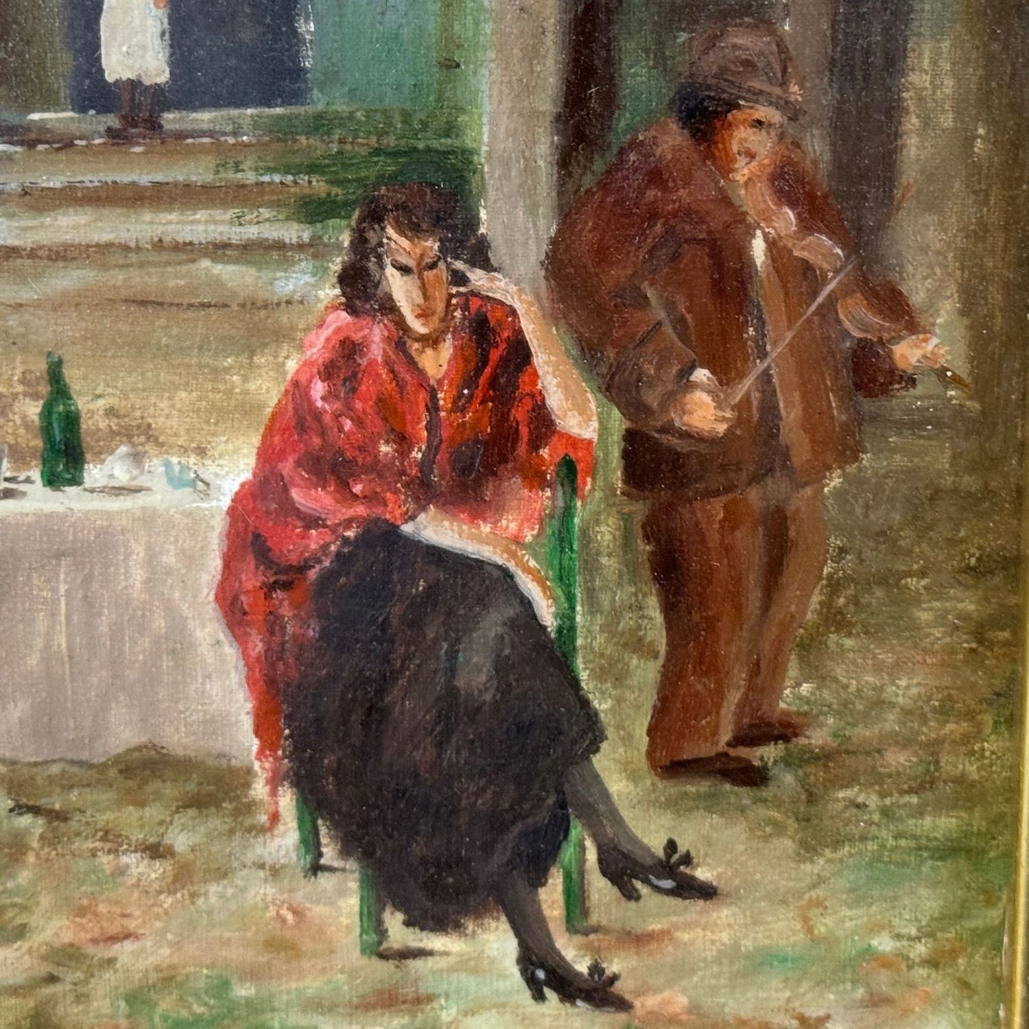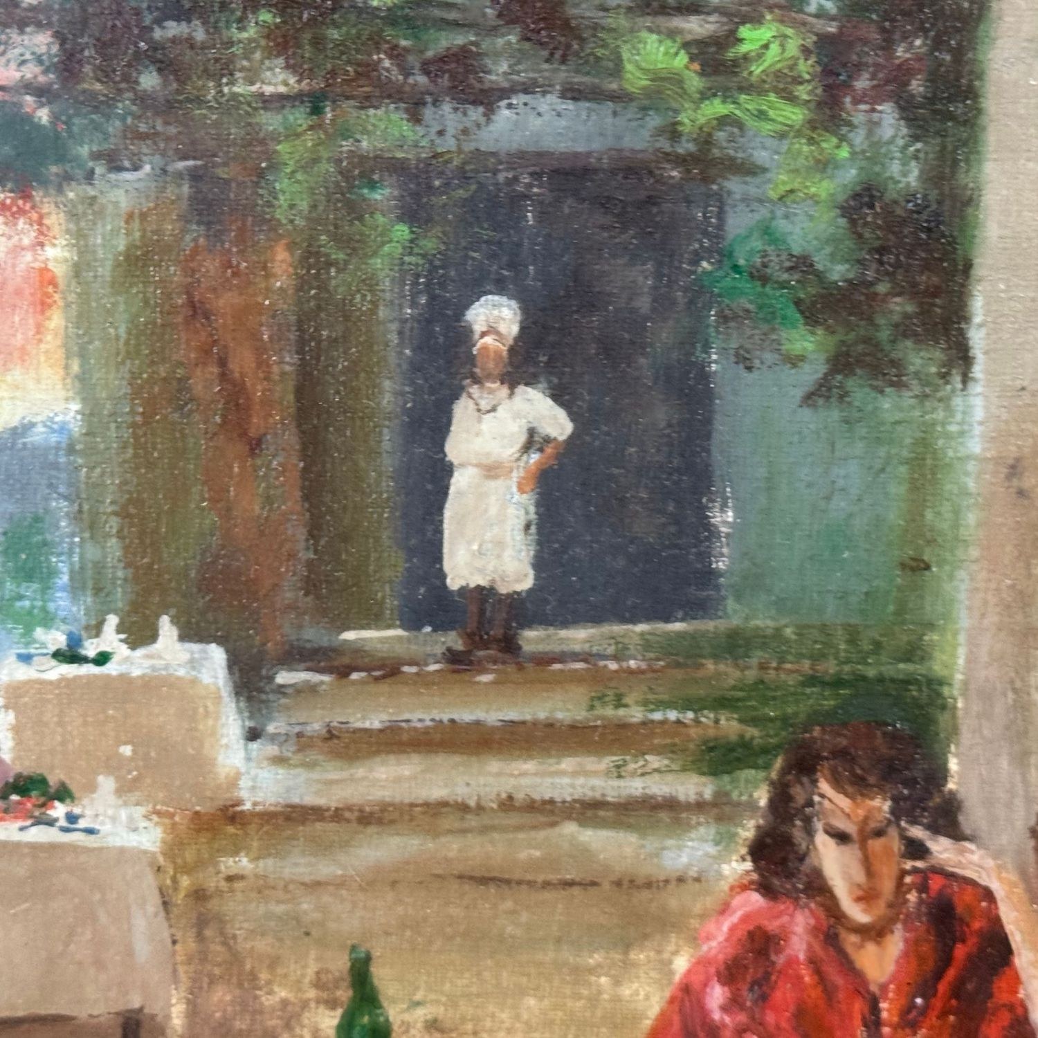 Oil painting on canvas, early 20th century, Italian school, depicting a Tavern with Figures. Inner frame dimensions: 30x25 cm. Dimensions including frame: 47x41 cm. Bears traces of an illegible signature in the lower left corner. The artwork is of excellent artistic quality.