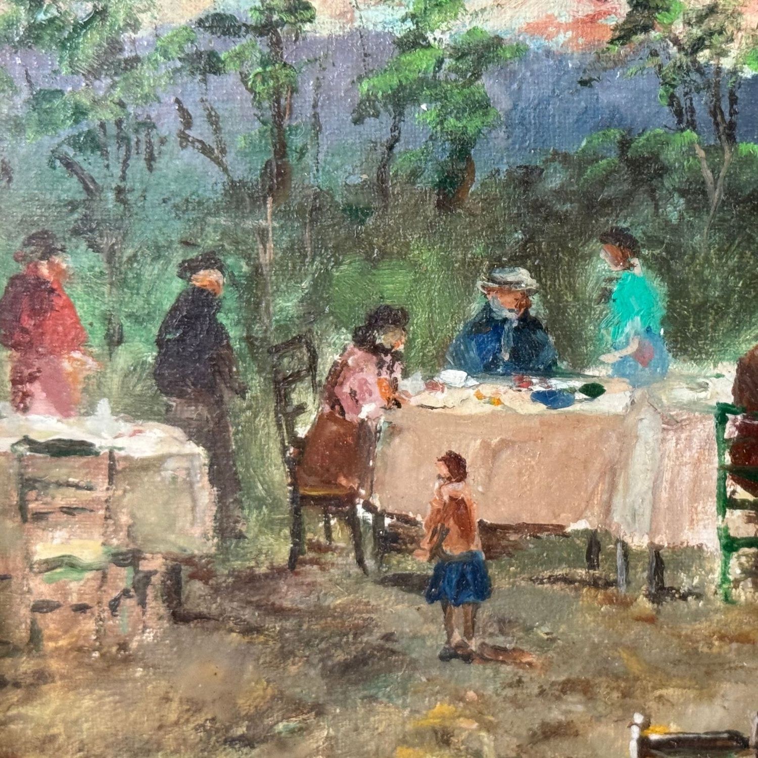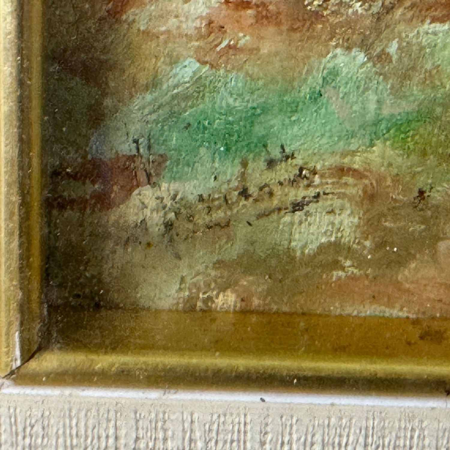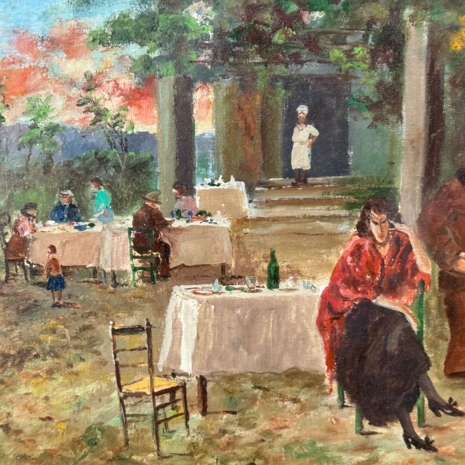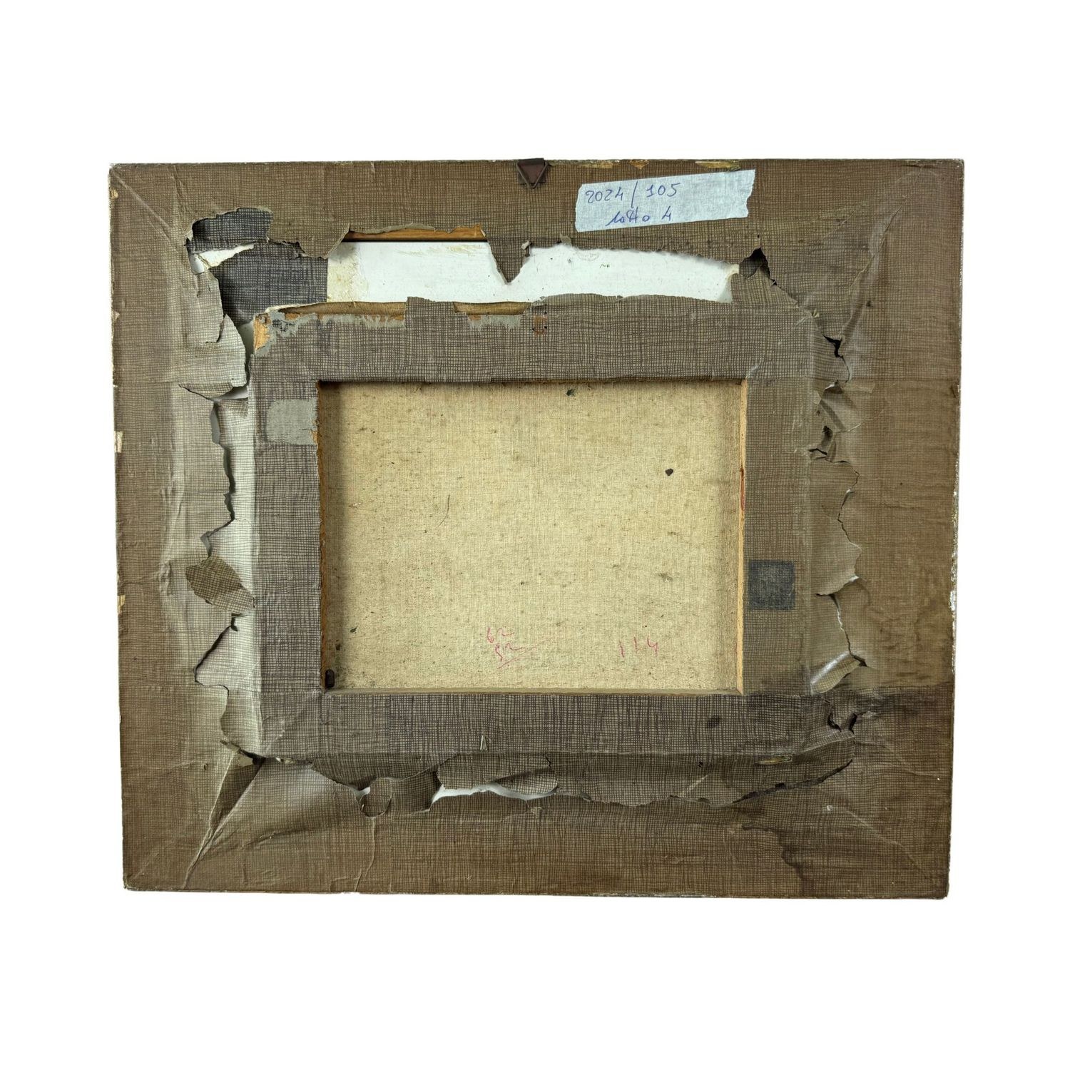 Oil painting on canvas, early 20th century, Italian school, depicting a Tavern with Figures. Inner frame dimensions: 30x25 cm. Dimensions including frame: 47x41 cm. Bears traces of an illegible signature in the lower left corner. The artwork is of excellent artistic quality.