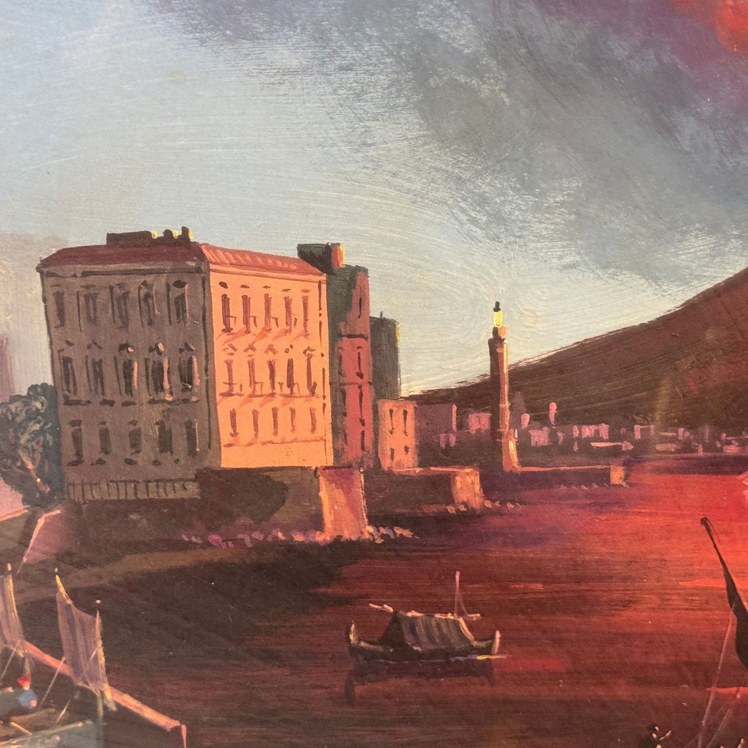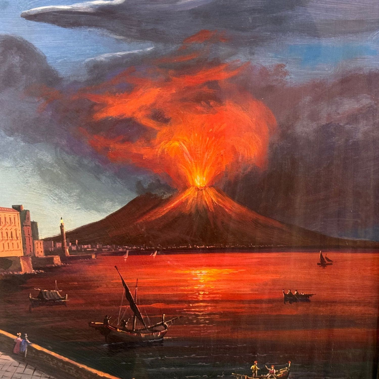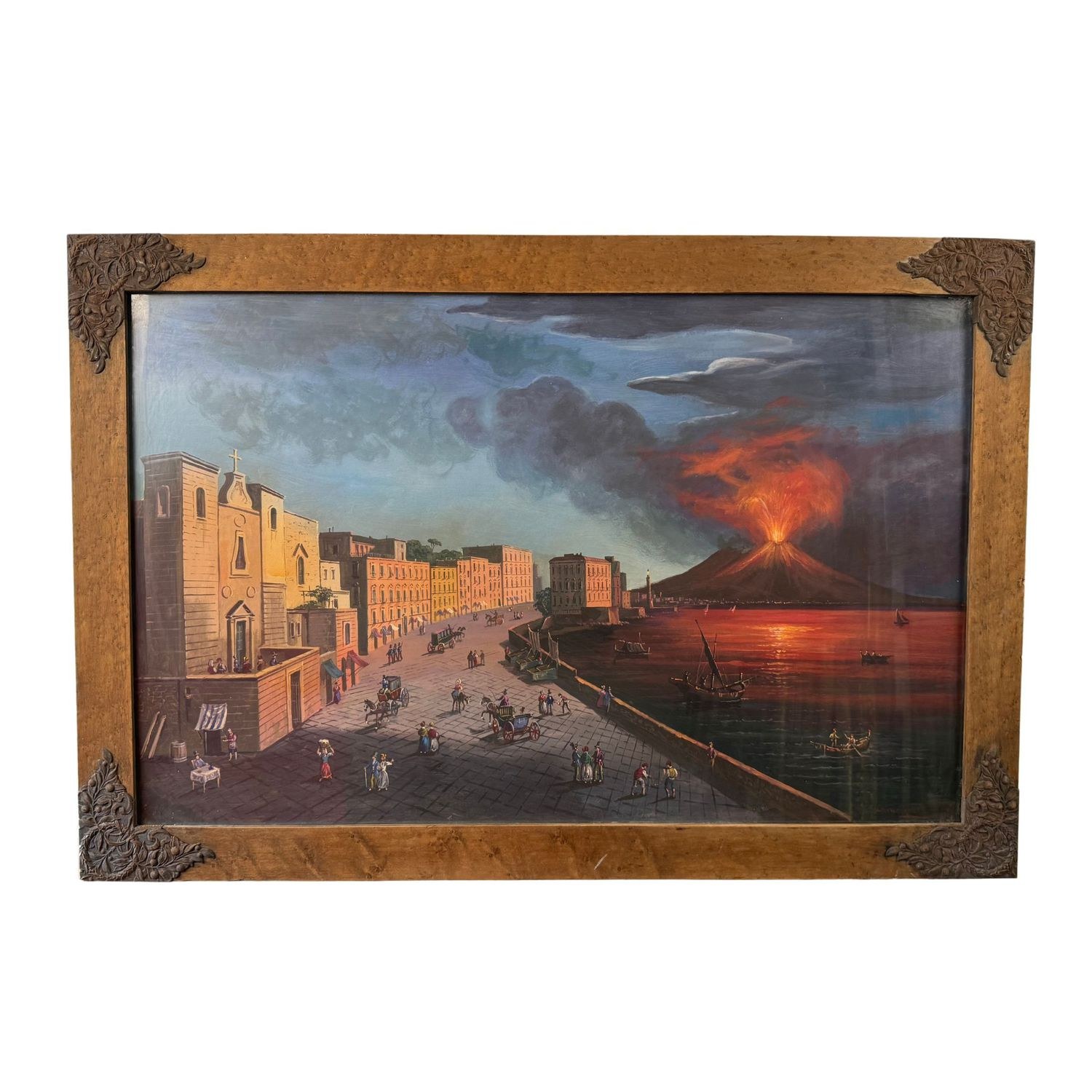 Gouache painting (tempera on cardboard), early 20th century, Italian school, depicting the eruption of Mount Vesuvius as seen from Santa Lucia.