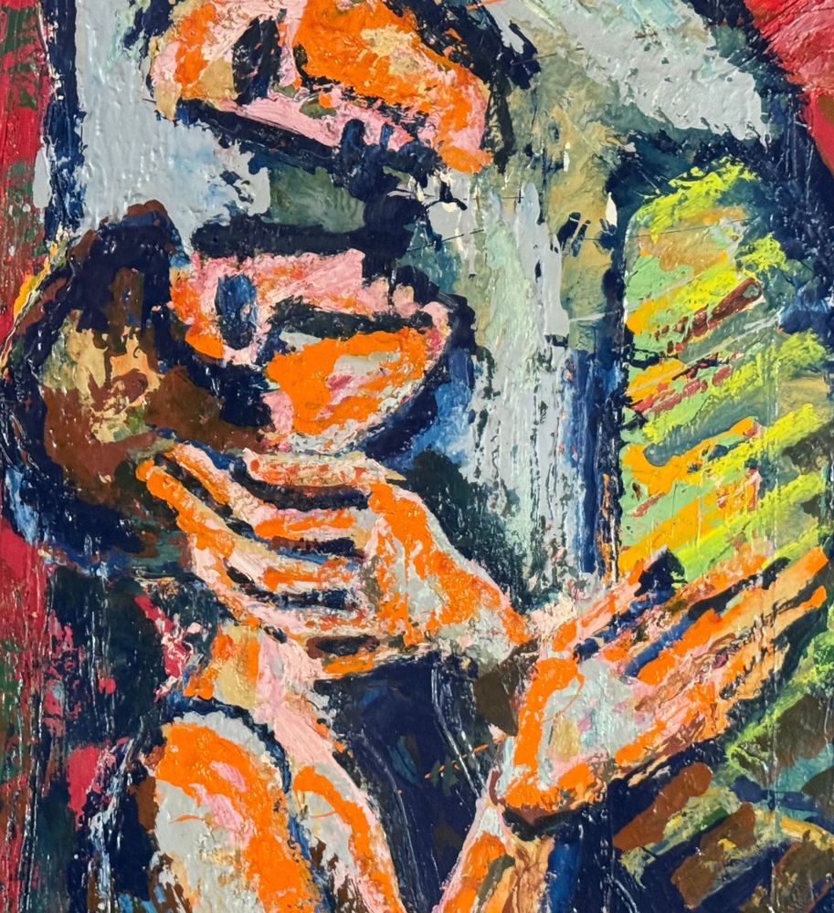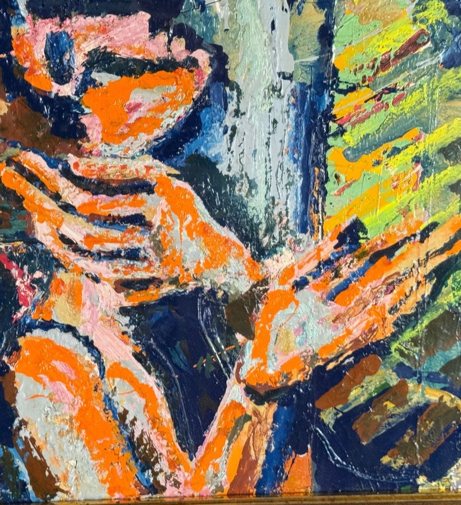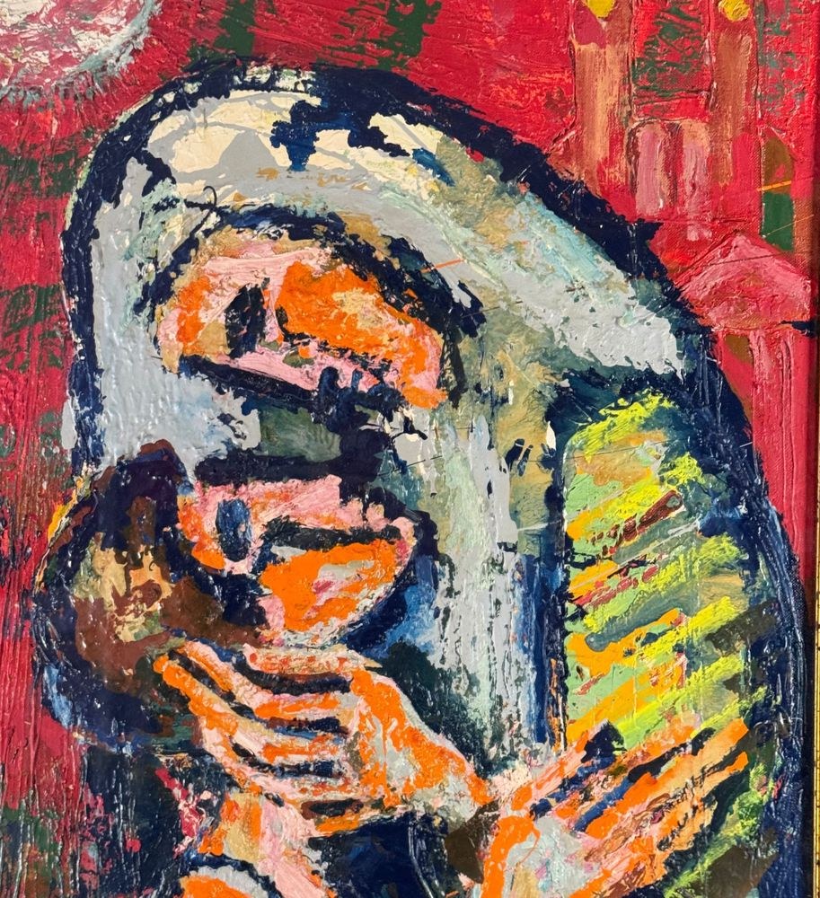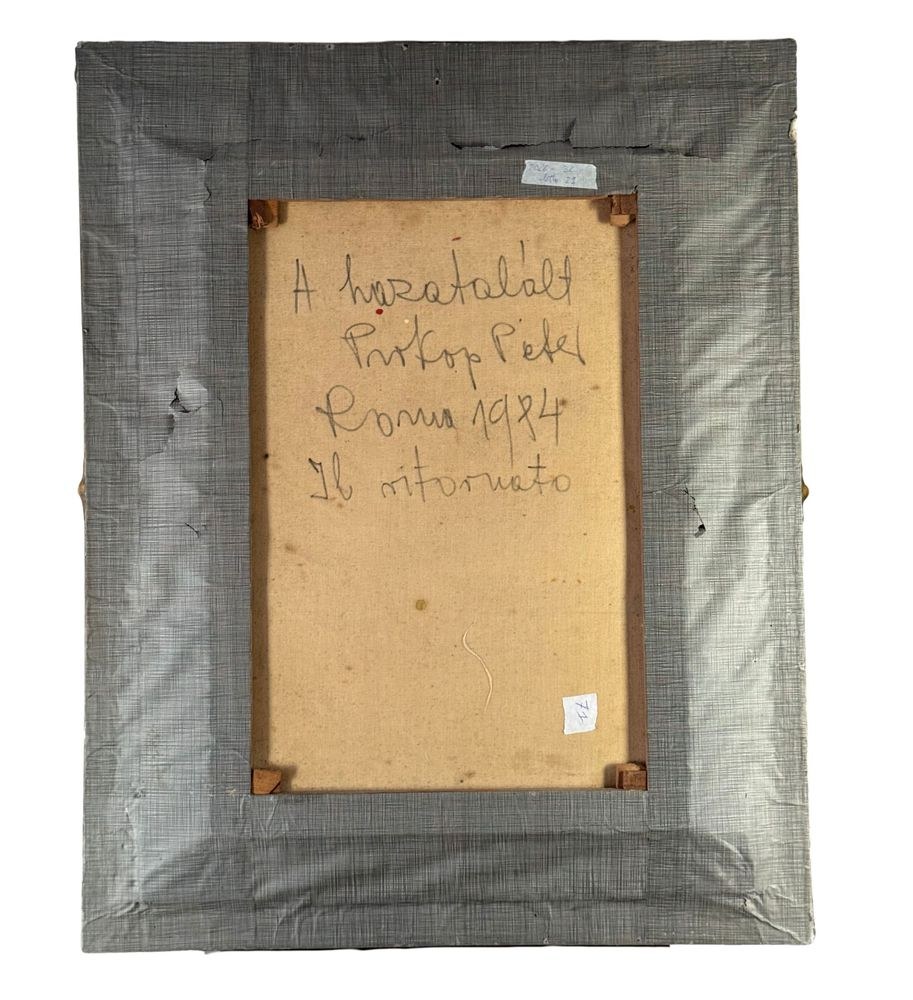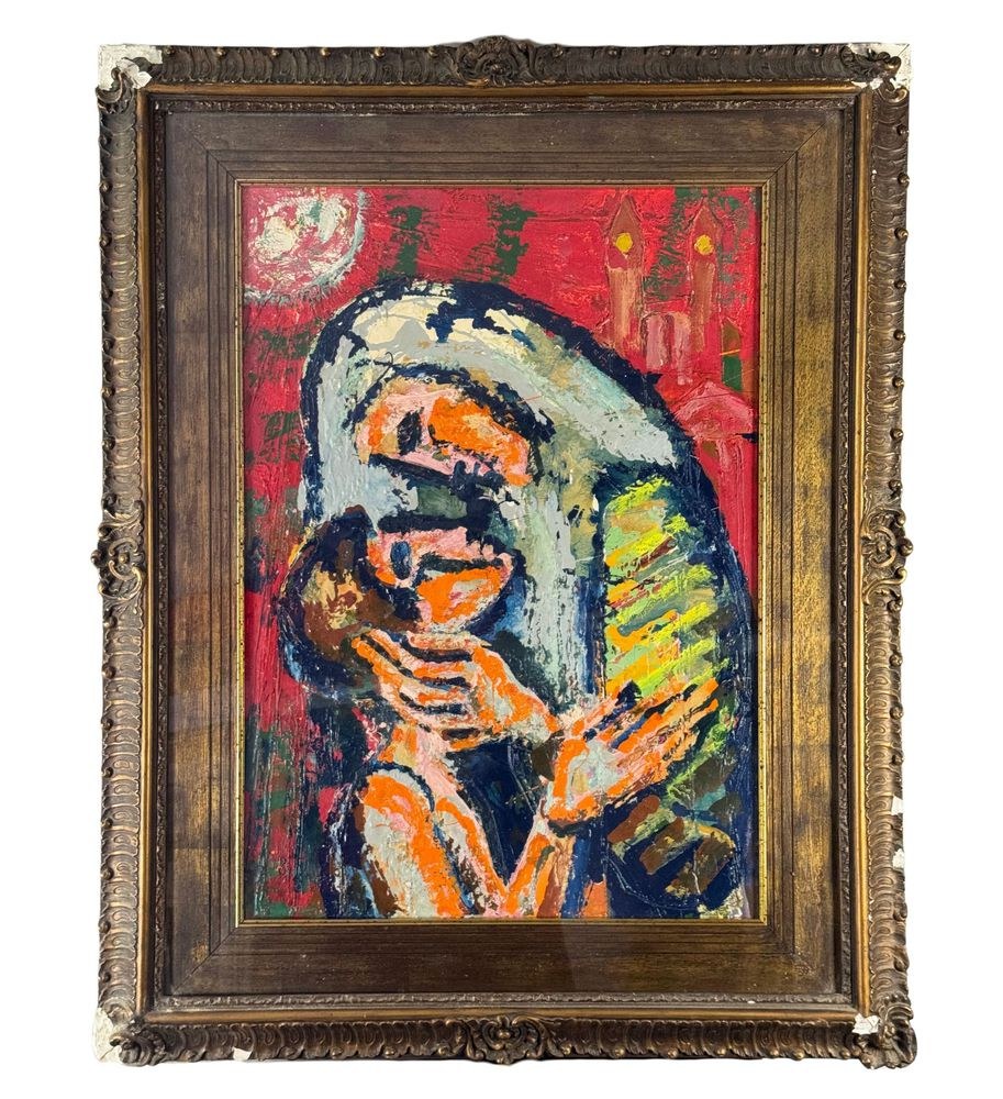 Oil painting on canvas, 20th century period, Italian school depicting Two figures. Dimensions including frame: 97x78 cm. Internal frame dimensions: 70x50 cm. Signed on the back by an unidentified artist. Work in good condition. Frame needs restoration.