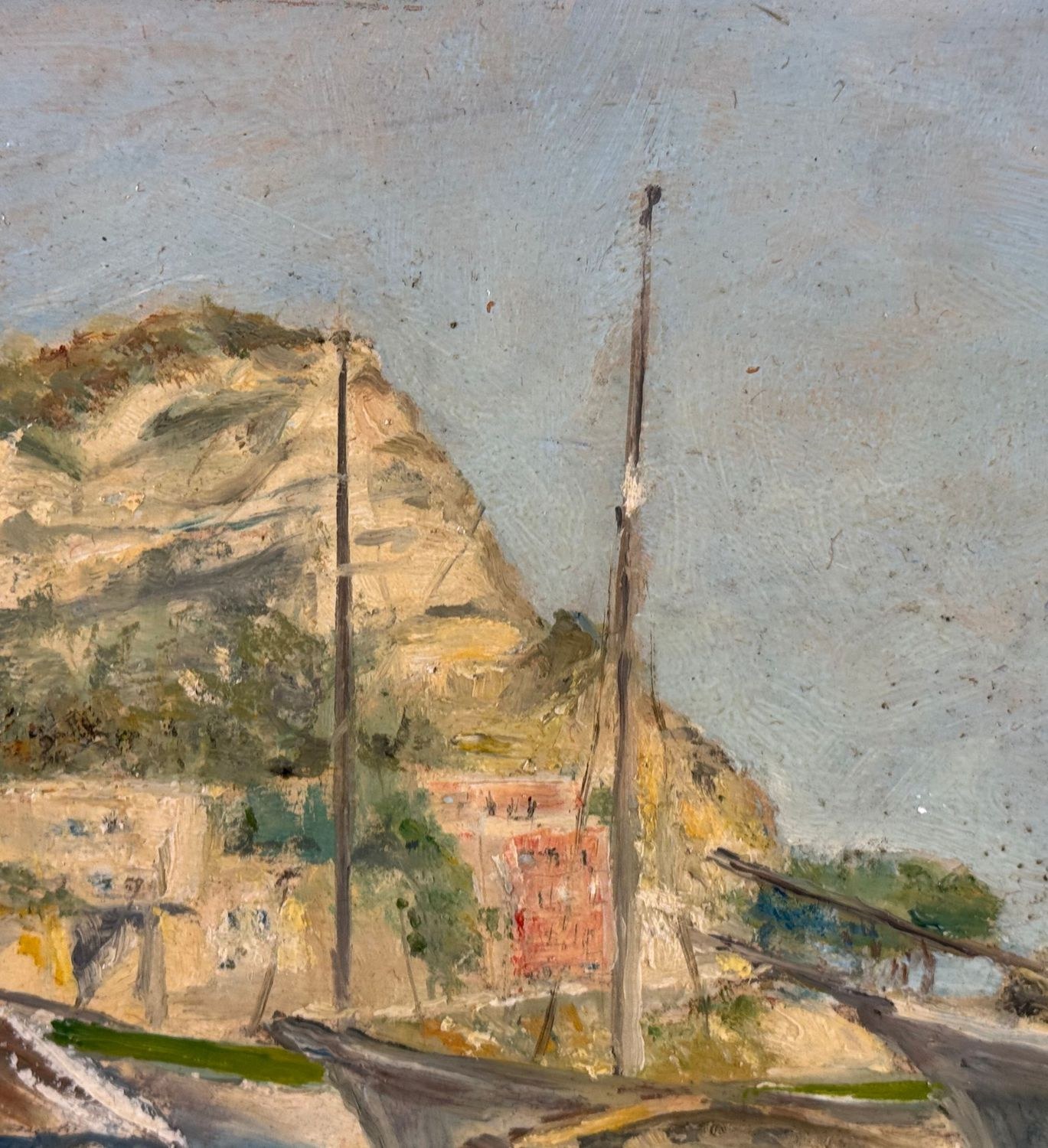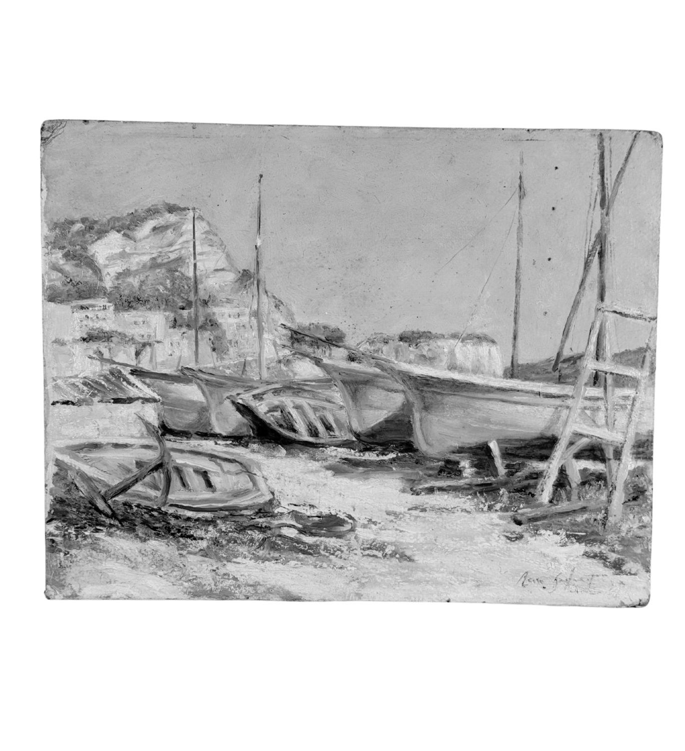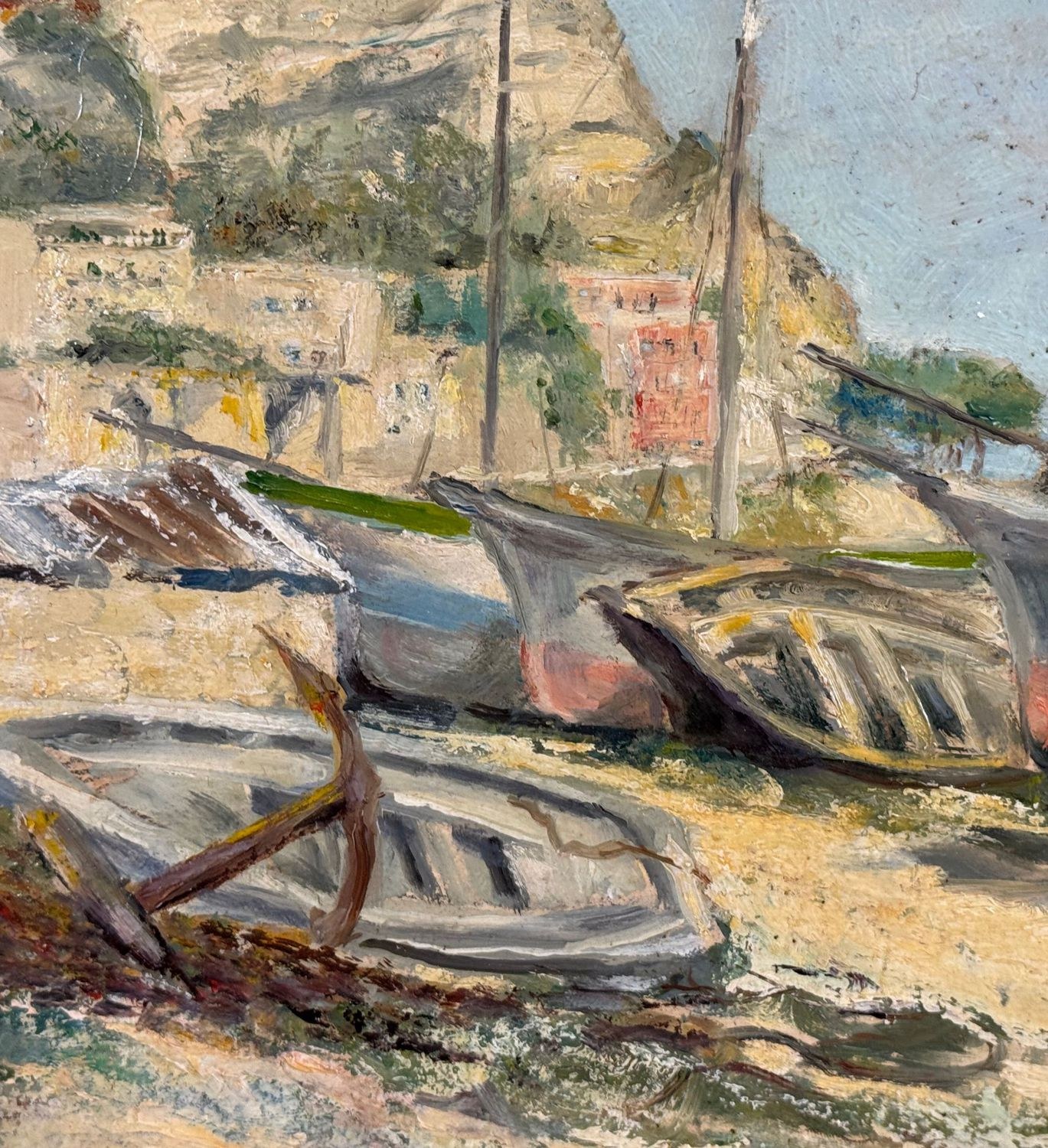 Oil painting on cardboard, 20th century Italian school, depicting a view of a seaside with boats on the shore. Dimensions: 38x30 cm. Signed at the bottom right by an unidentified artist. The artwork is in good condition with slight signs of age, as shown in the attached photos.