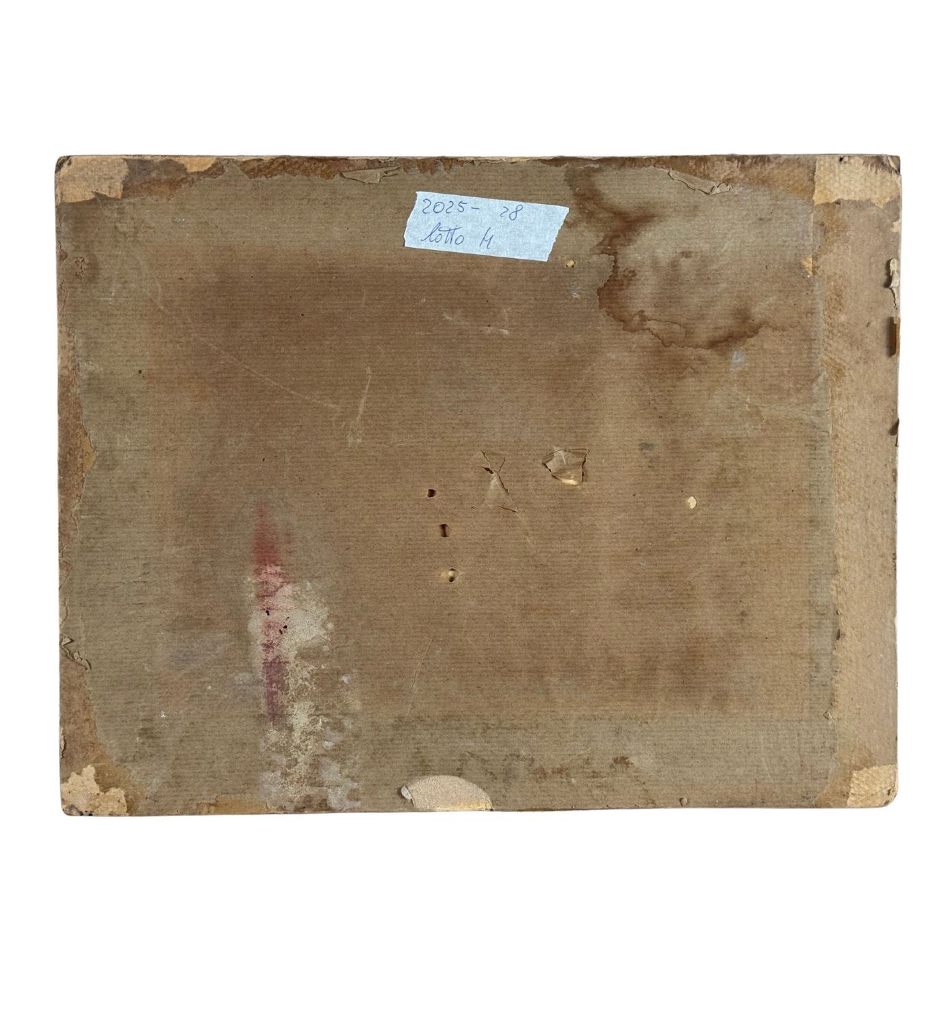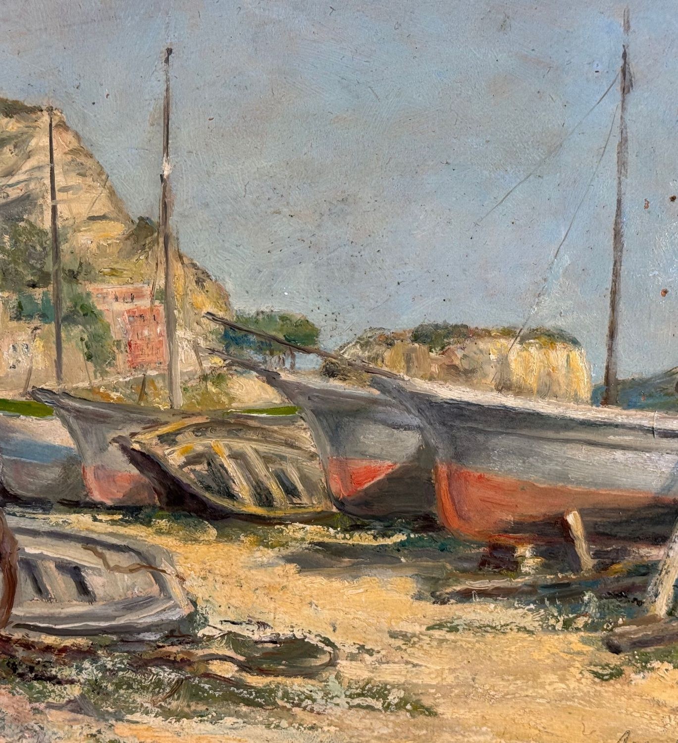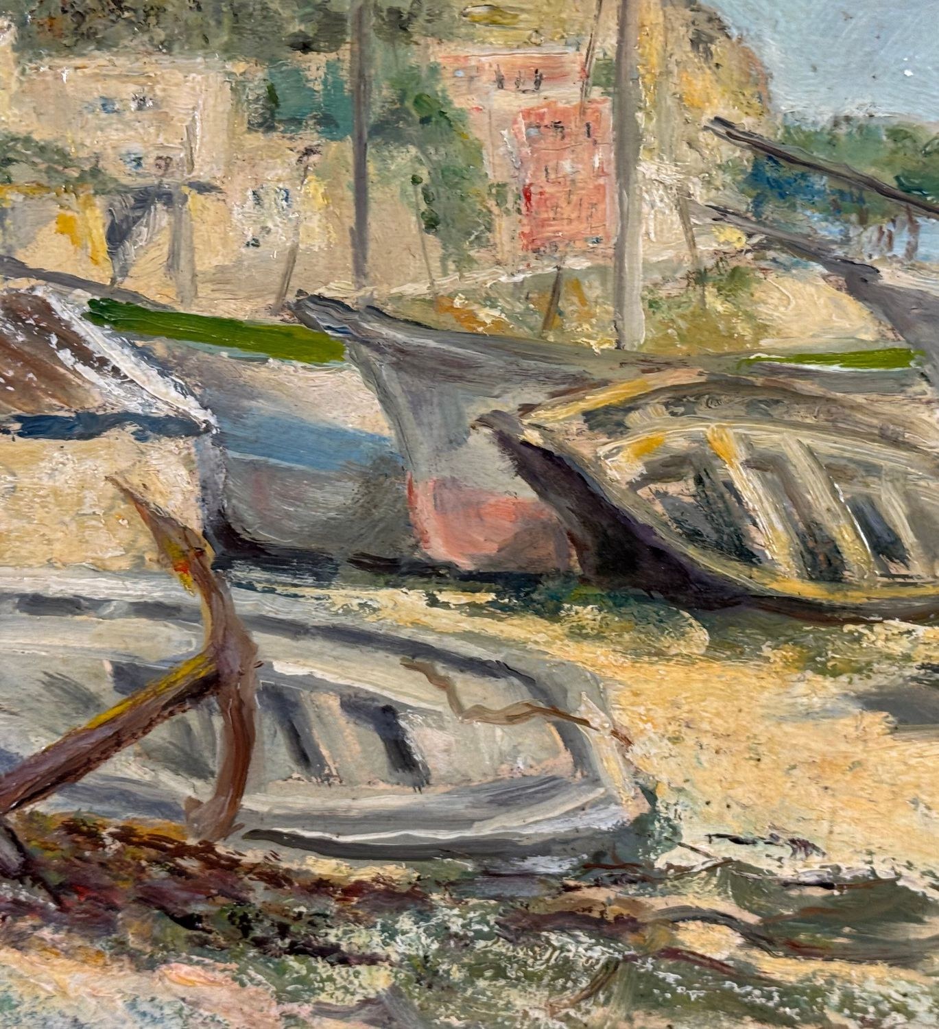 Oil painting on cardboard, 20th century Italian school, depicting a view of a seaside with boats on the shore. Dimensions: 38x30 cm. Signed at the bottom right by an unidentified artist. The artwork is in good condition with slight signs of age, as shown in the attached photos.