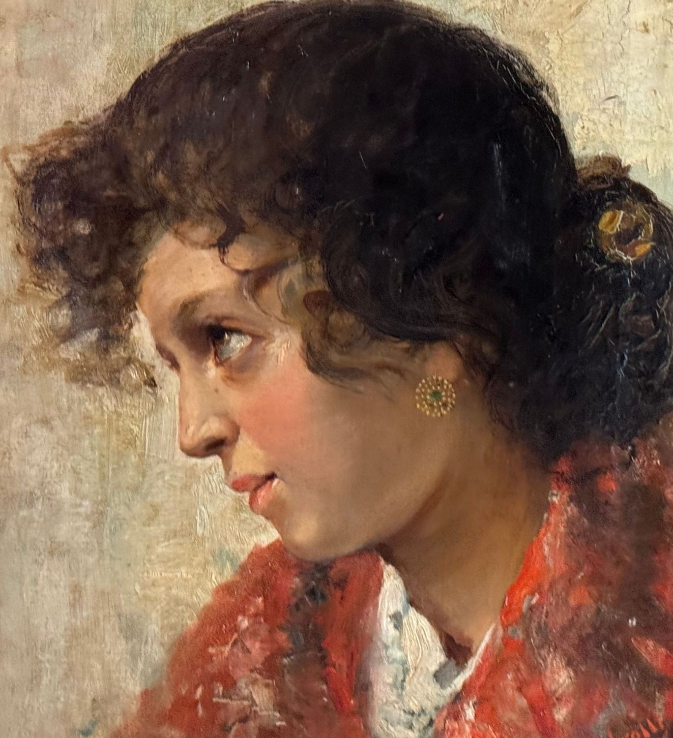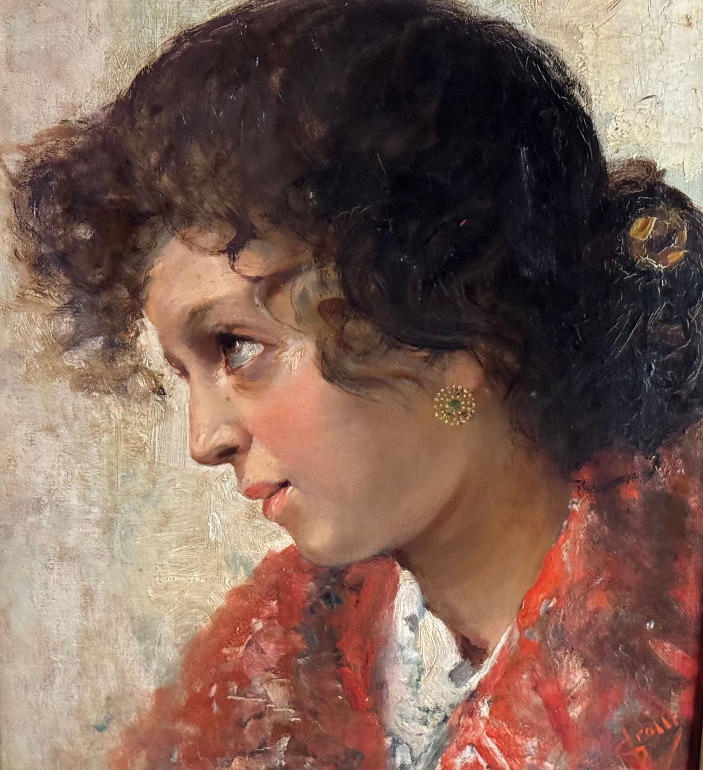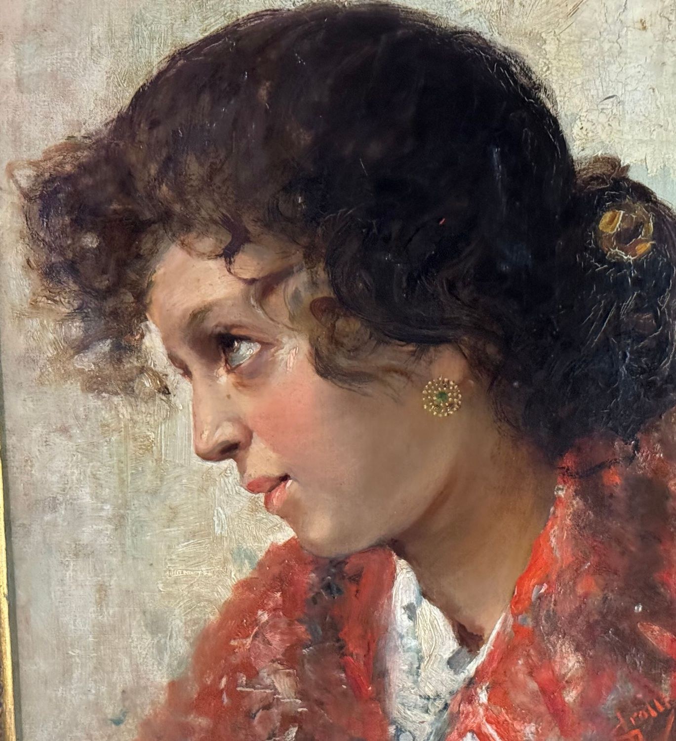 Oil on canvas painting, late 19th / early 20th century, Italian school, depicting a portrait of a young woman. Dimensions including frame: 74 × 59 cm. Inner frame dimensions: 36 × 51 cm. Signed lower right Vincenzo Irolli. The artwork is in good condition.