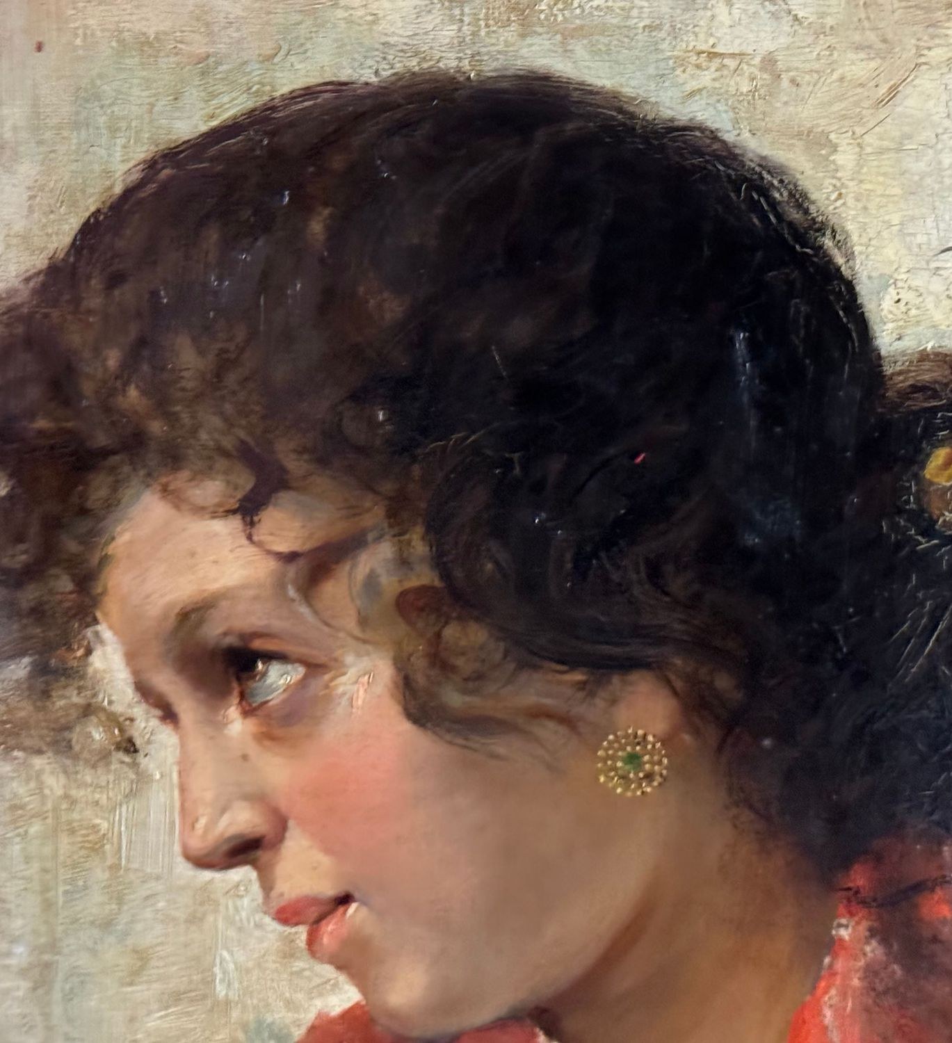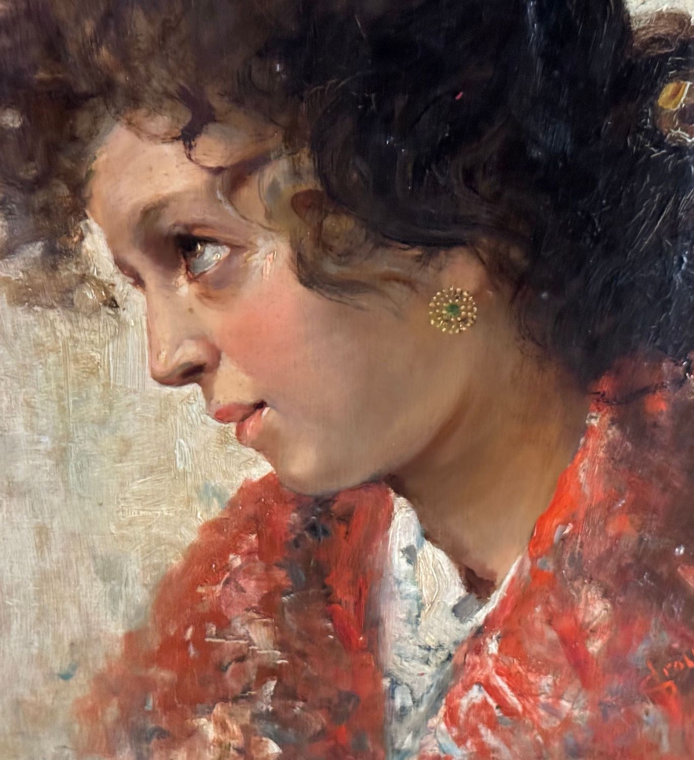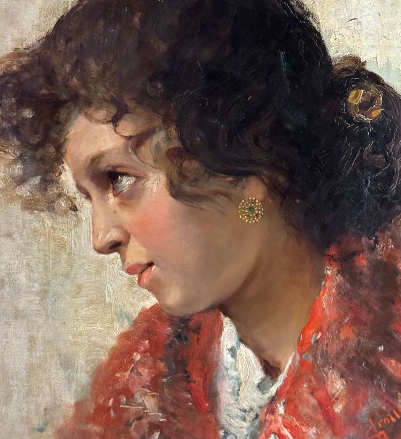 Oil on canvas painting, late 19th / early 20th century, Italian school, depicting a portrait of a young woman. Dimensions including frame: 74 × 59 cm. Inner frame dimensions: 36 × 51 cm. Signed lower right Vincenzo Irolli. The artwork is in good condition.