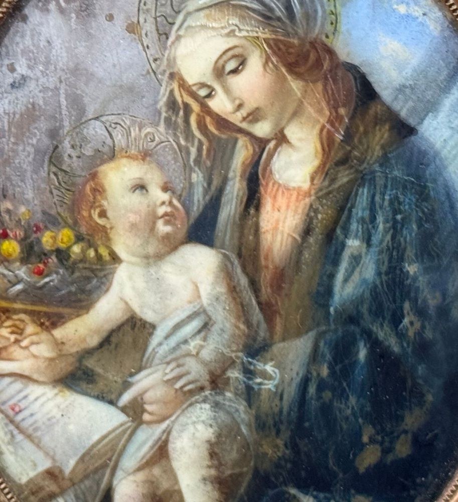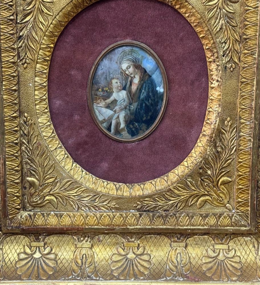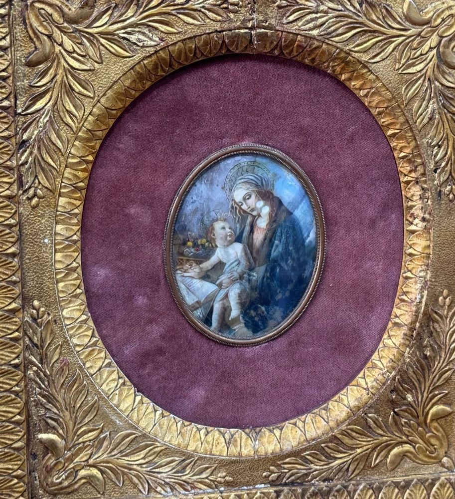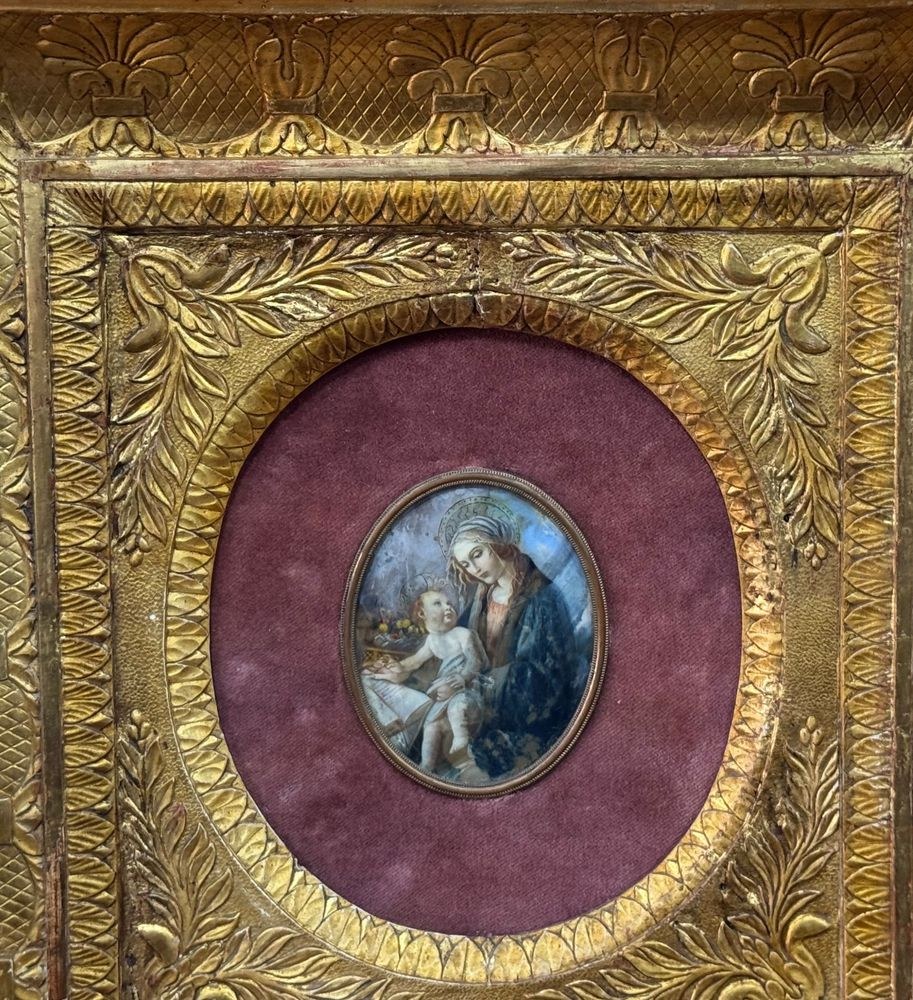 Miniature painting on plaque, 19th century Italian school, depicting the Virgin and Child after Botticelli. Dimensions including frame: 33x35 cm. Inner frame dimensions: 10x7 cm. Artwork in good condition with slight signs of age as shown in the attached photos. Empire period frame.