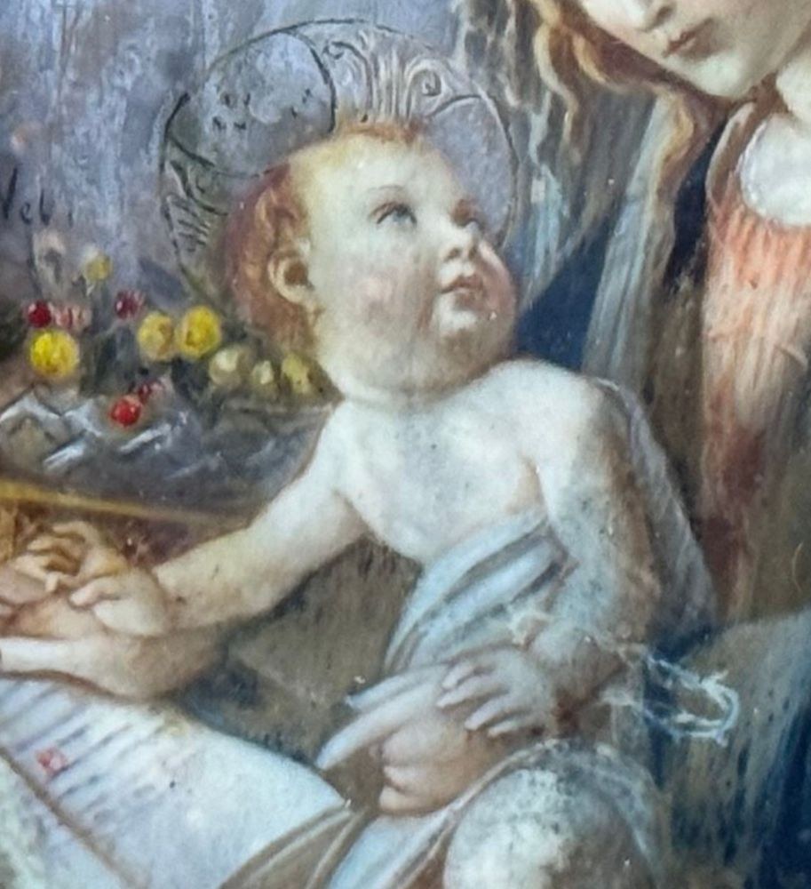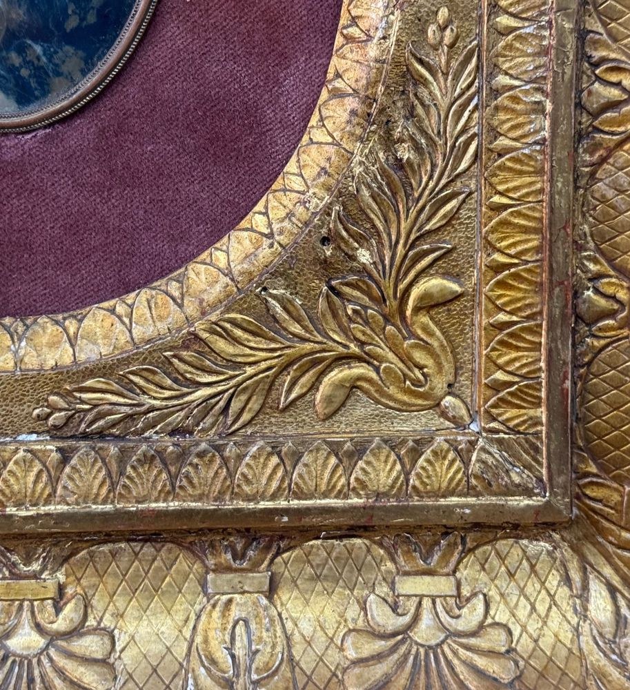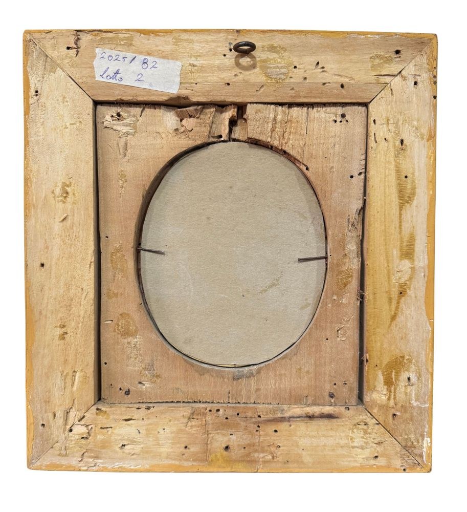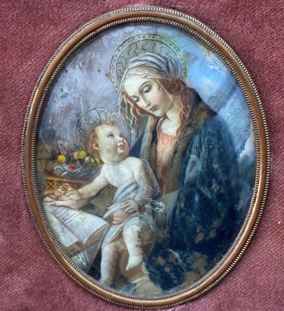Miniature painting on plaque, 19th century Italian school, depicting the Virgin and Child after Botticelli. Dimensions including frame: 33x35 cm. Inner frame dimensions: 10x7 cm. Artwork in good condition with slight signs of age as shown in the attached photos. Empire period frame.