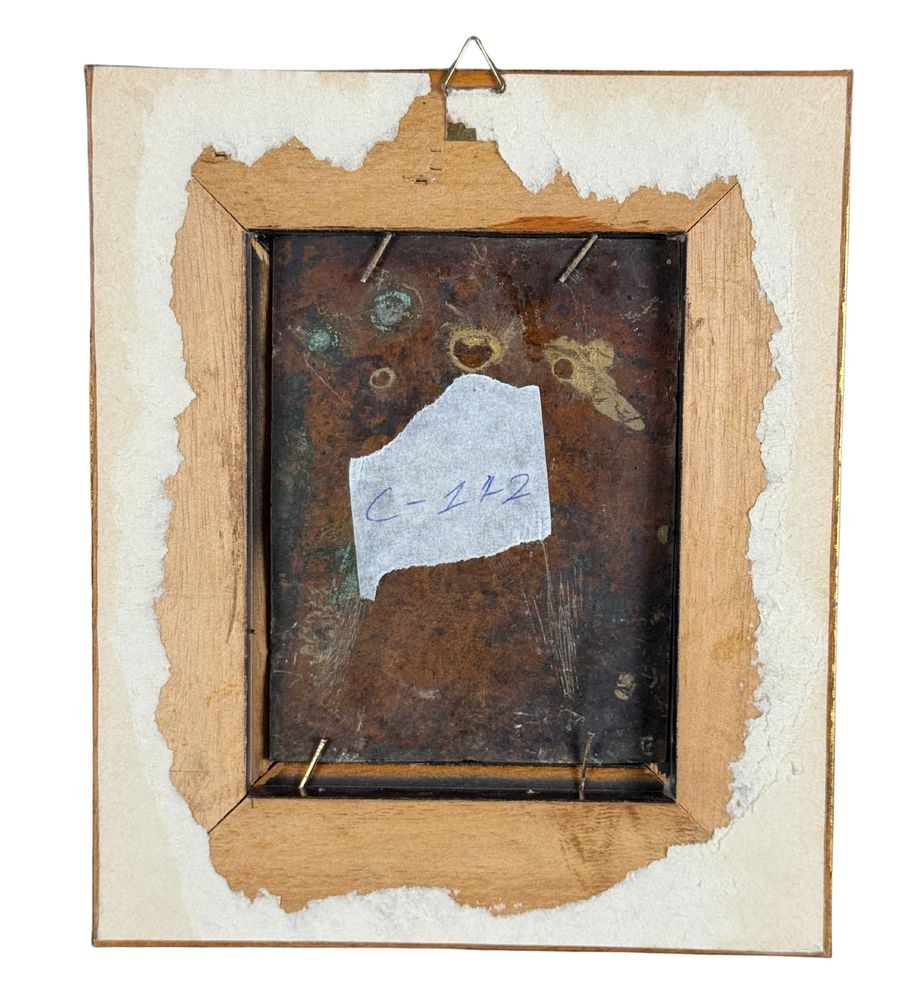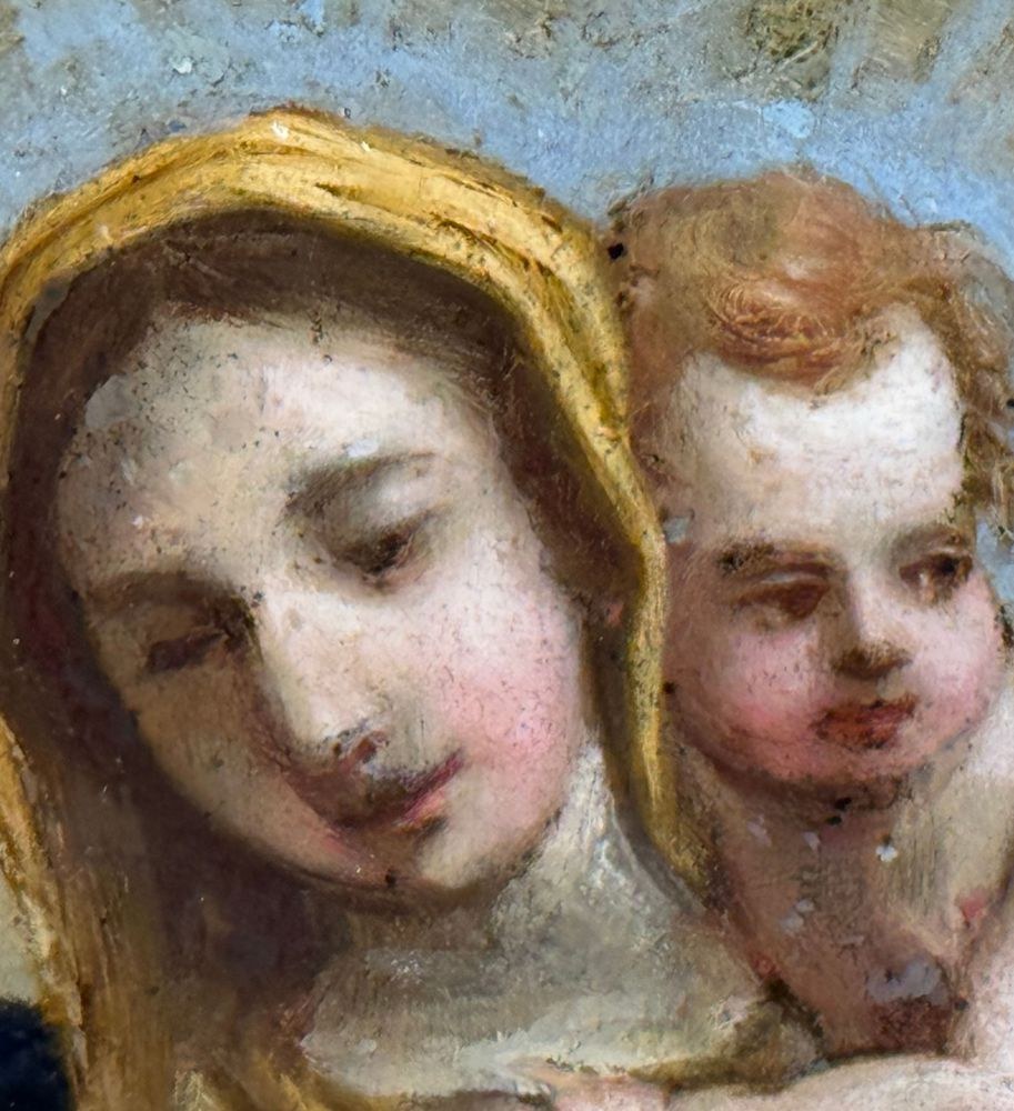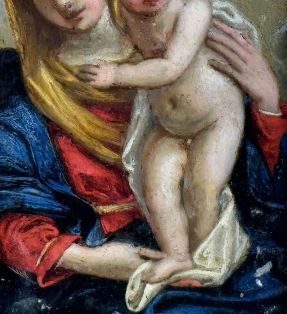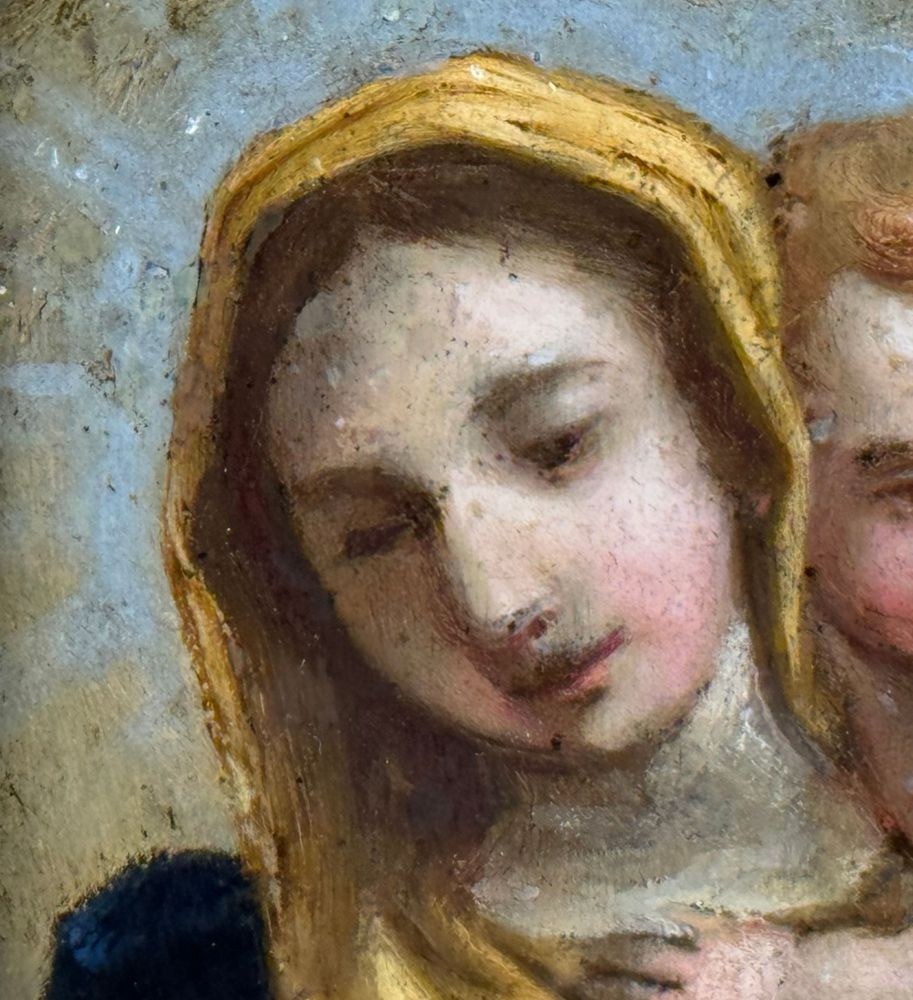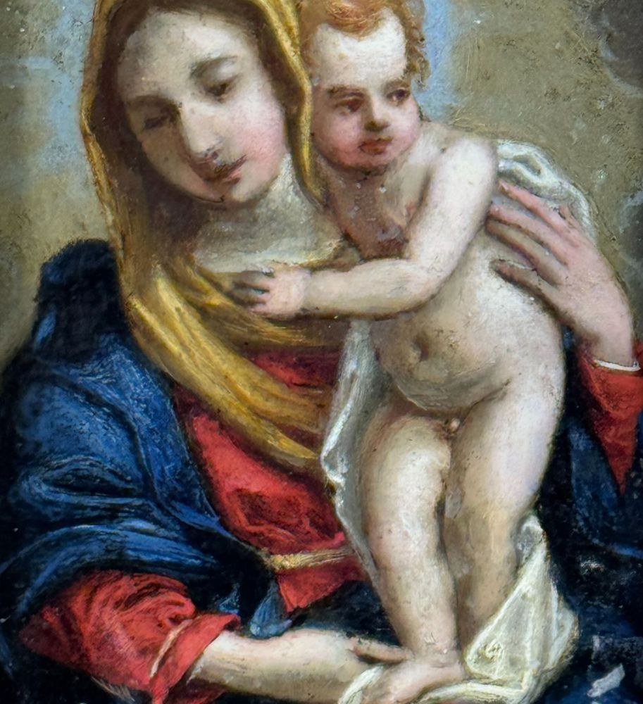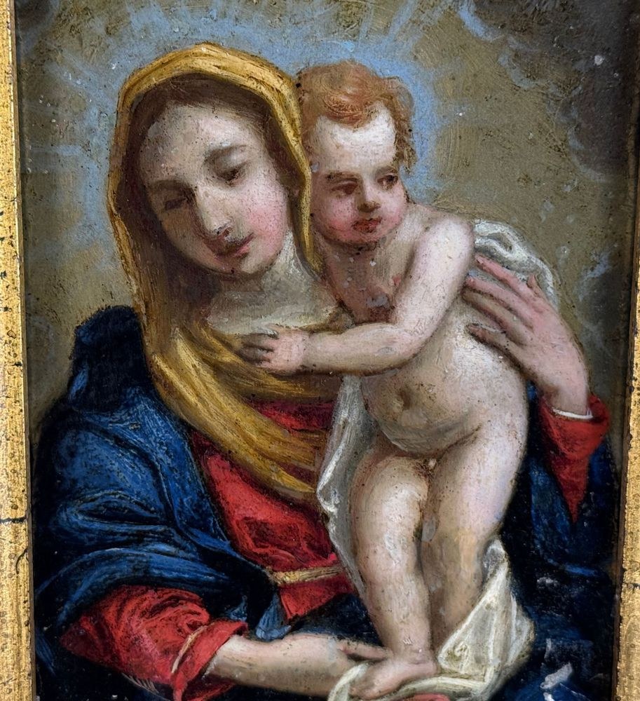 Miniature painting on copper plate, 18th century, Italian school, depicting the Virgin and Child. Dimensions including frame: 17.5x20.5 cm. Inner frame dimensions: 10x13 cm. The artwork is in good condition.