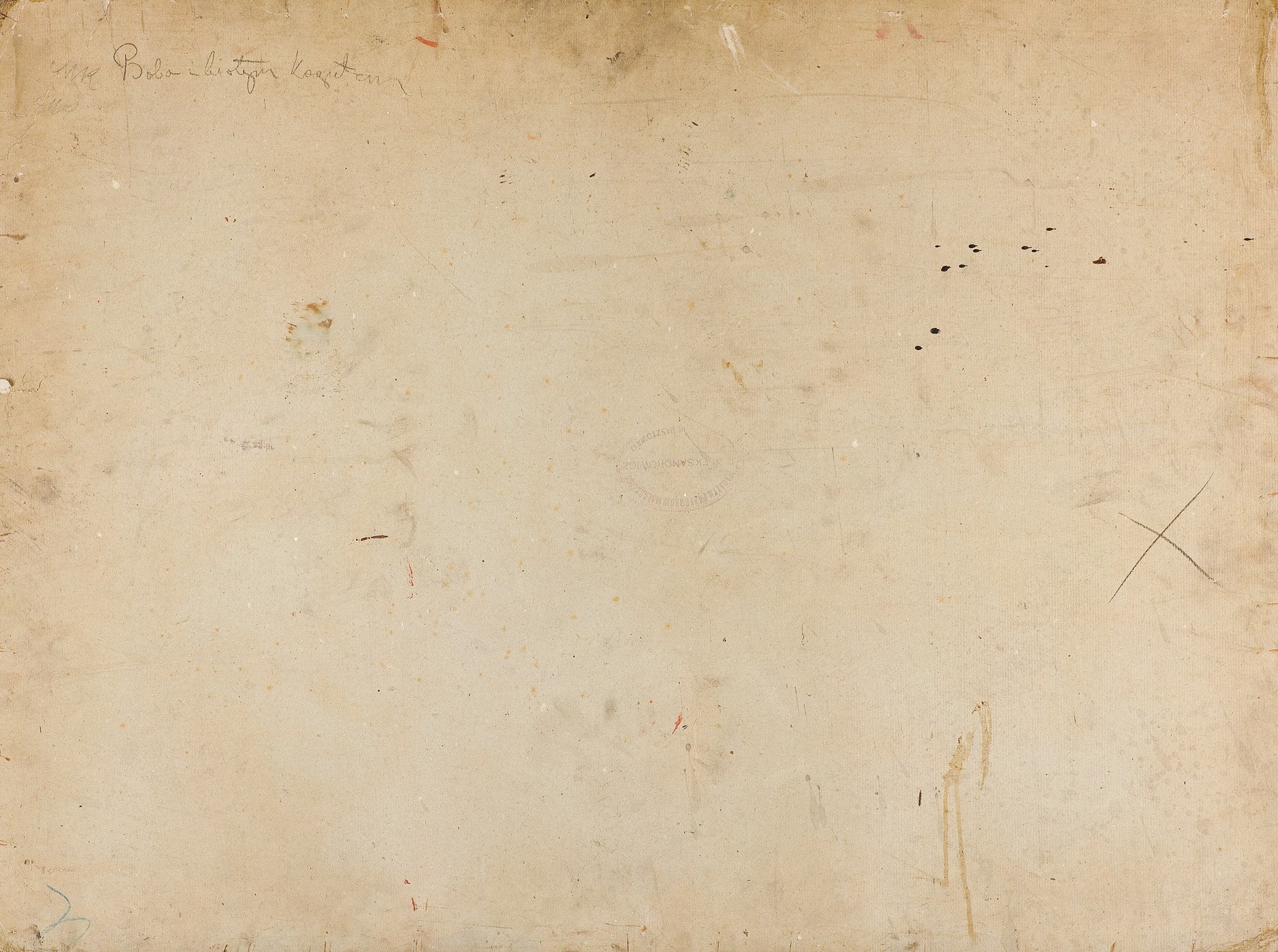 Na odwrocie l..g. (ołówek): Baba z białym kogutem, po lewej dwukrotnie monogram wiązany: MK; l.d. (kredka): a; centralnie (przeciwnie do kompozycji) owalny stempel krakowskiego zakładu Róży Aleksandrowicz: MAGAZYN PRZYBORÓW MALARSKICH | R. ALEKSANDROWICZ | [KRAKÓW,] ul. BASZTOWA 12