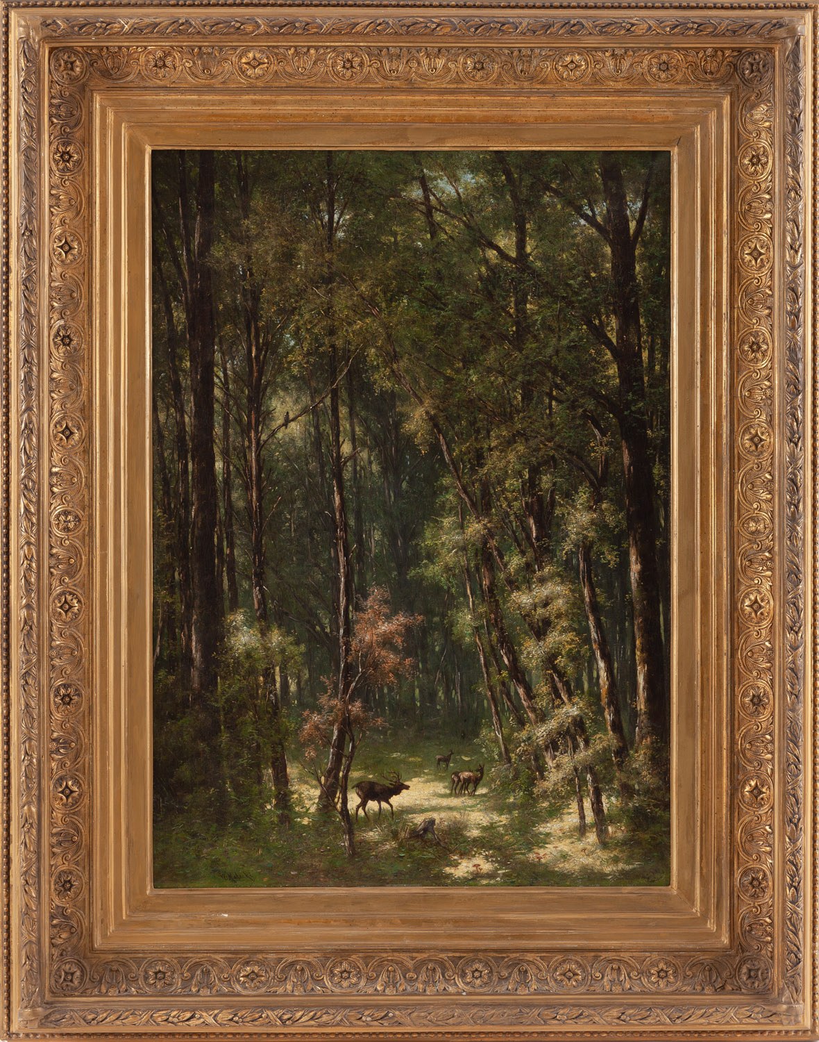opisany na krośnie malarskim: 'Malecki Wielki las nabyty w Londynie 1874 | (trudno czytelnie)' oraz na ramie: 'Malecki', 'London - 1874.' oraz trudno czytelnie