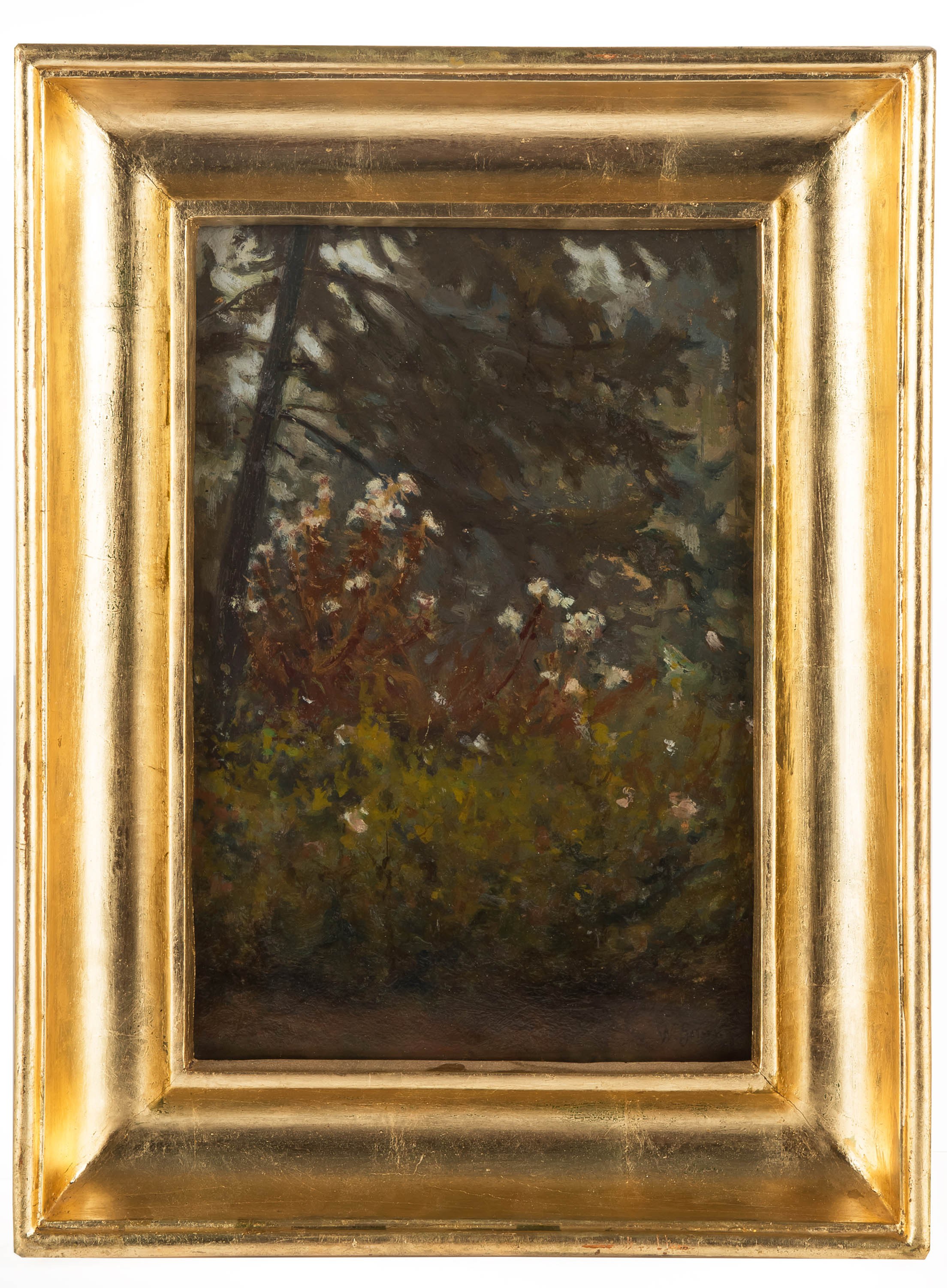 Na odwr. nieczytelny napis ołówkiem; obok numer (ołówkiem): 43 II; poniżej naklejona kartka z odręczną opinią dr. Kazimierza Buczkowskiego z lipca 1944 roku potwierdzającą autentyczność obrazu Wojciecha Gersona; ponadto na prawej listwie ramy dwujęzyczna nalepka (po polsku i po angielsku) zawierająca krótki opis obrazu; na dolnej listwie ramy nalepka inwentarzowa Muzeum Okręgowego w Rzeszowie (druk): Wojciech Gerson, Pejzaż leśny, olej, tektura, kolekcja prywatna, nr inw. | Dep. MRA 2050