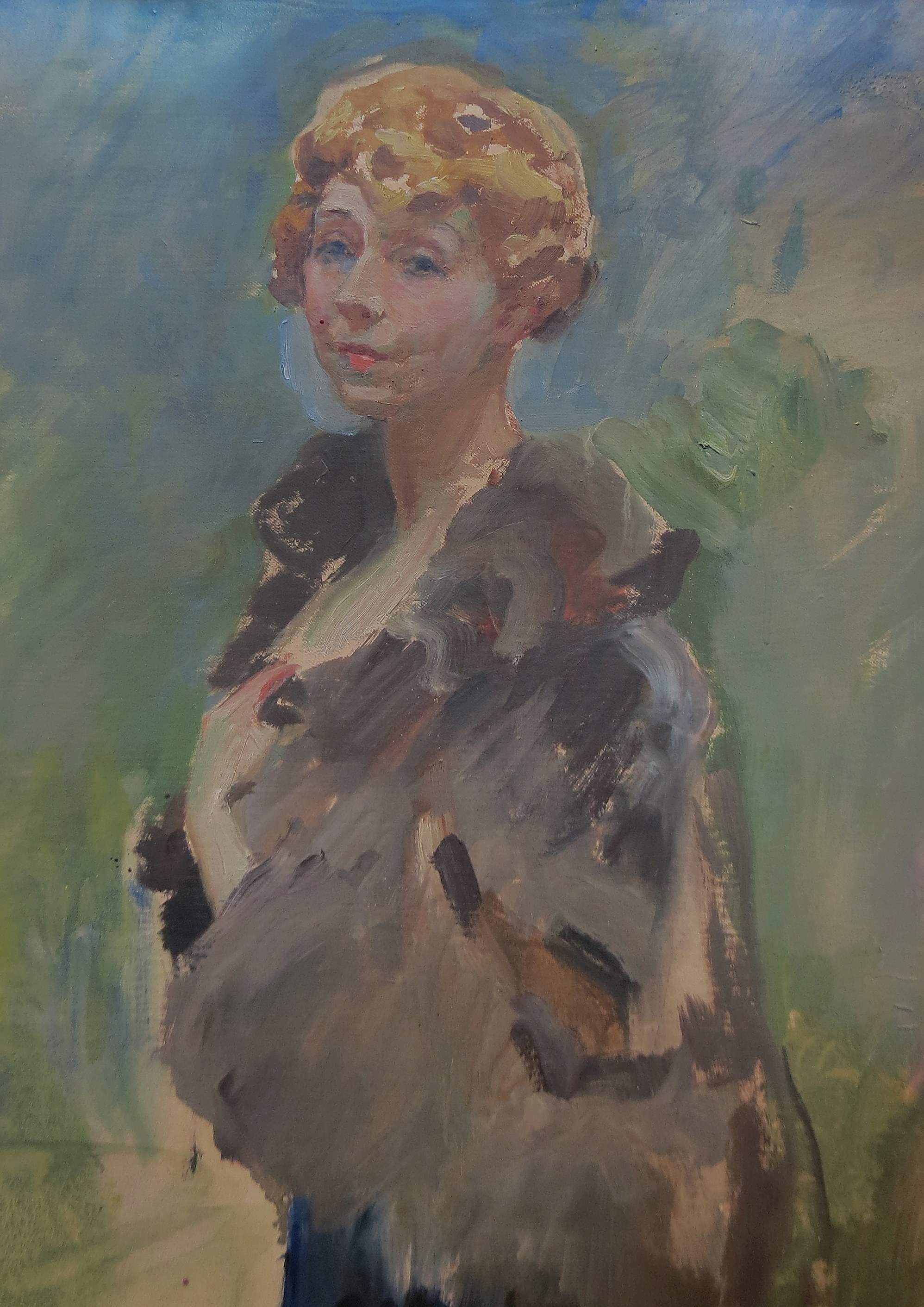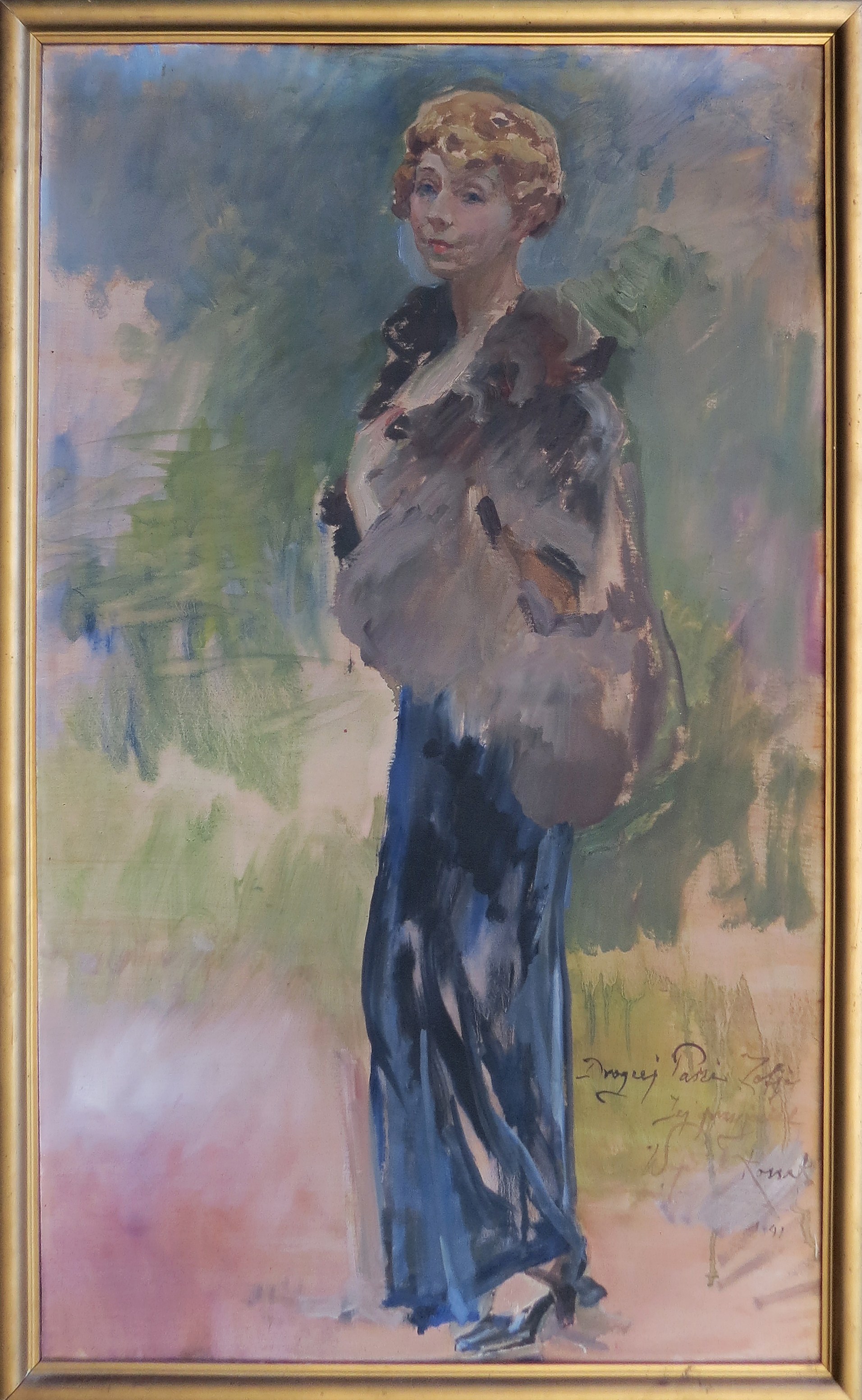 Zofia Jachimecka (1886-1973) - tłumaczka z literatury włoskiej i francuskiej, związana z krakowskim środowiskiem artystyczno-literackim. Wspólnie z mężem Zdzisławem Jachimeckim, profesorem historii i teorii muzyki na Uniwersytecie Jagiellońskim, prowadziła jeden z najsłynniejszych salonów skupiających życie artystyczno-towarzyskie Krakowa. Była wielokrotnie portretowana przez Teodora Axentowicza, Leona Chwistek, Józefa Czajkowskiego, Xawerego Dunikowskiegho, Wojciecha Kossaka, Konstantego Laszczkę Józefa Mehoffera, Józefa Pankiewicza, Ludwika Pugeta, Karola Tichego i Stanisława Ignacego Witkiewicza. Jej portrety uznawane są za jedne z najpiękniejszych kobiecych wizerunków. O prezentowanym portrecie Urszula Kozakowska-Zaucha pisze: "Wśród innych malarskich konterfektów Jachimeckiej wyróżniał się jej okazały portret w błękitnej sukni do ziemi i czarnej futrzanej pelerynce namalowany w 1941 roku przez Wojciecha Kossaka." (https://blog.mnk.pl/zofia-jachimecka-muza-krakowskich-artystow/). Na temat życia i twórczości Zofii Jachimeckiej powstało opracowanie autorstwa Marii Porębskiej, wydane nakładem Uniwersytetu Jagiellońskiego w Krakowie.
