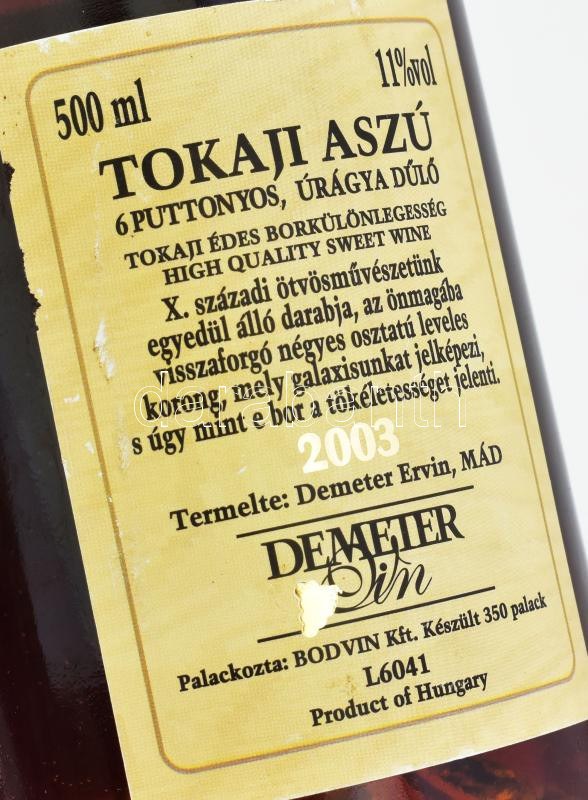 2003 Demetervin 6 puttonyos tokaji aszú, Úrágya-dűlő, csak 350 palackban készült, bontatlan palack édes fehér desszertbor, 11%, 0,5l.