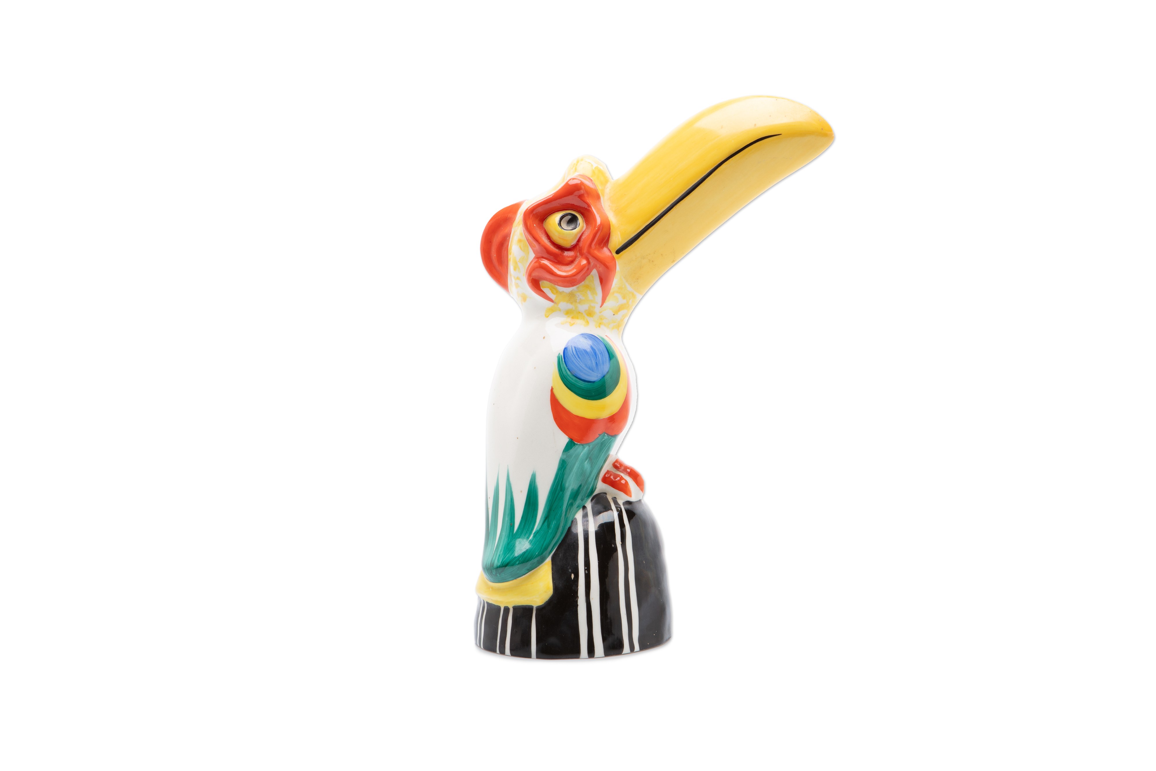 A decorative ceramic statuette in the shape of a stylized toucan, produced in the 1930s at the Ditmar Urbach factory in Czechoslovakia. The statuette is a typical example of the expressive design with the influence of art deco and stylized modernism, which was characteristic of the production of this manufactory in the interwar period. Lot information