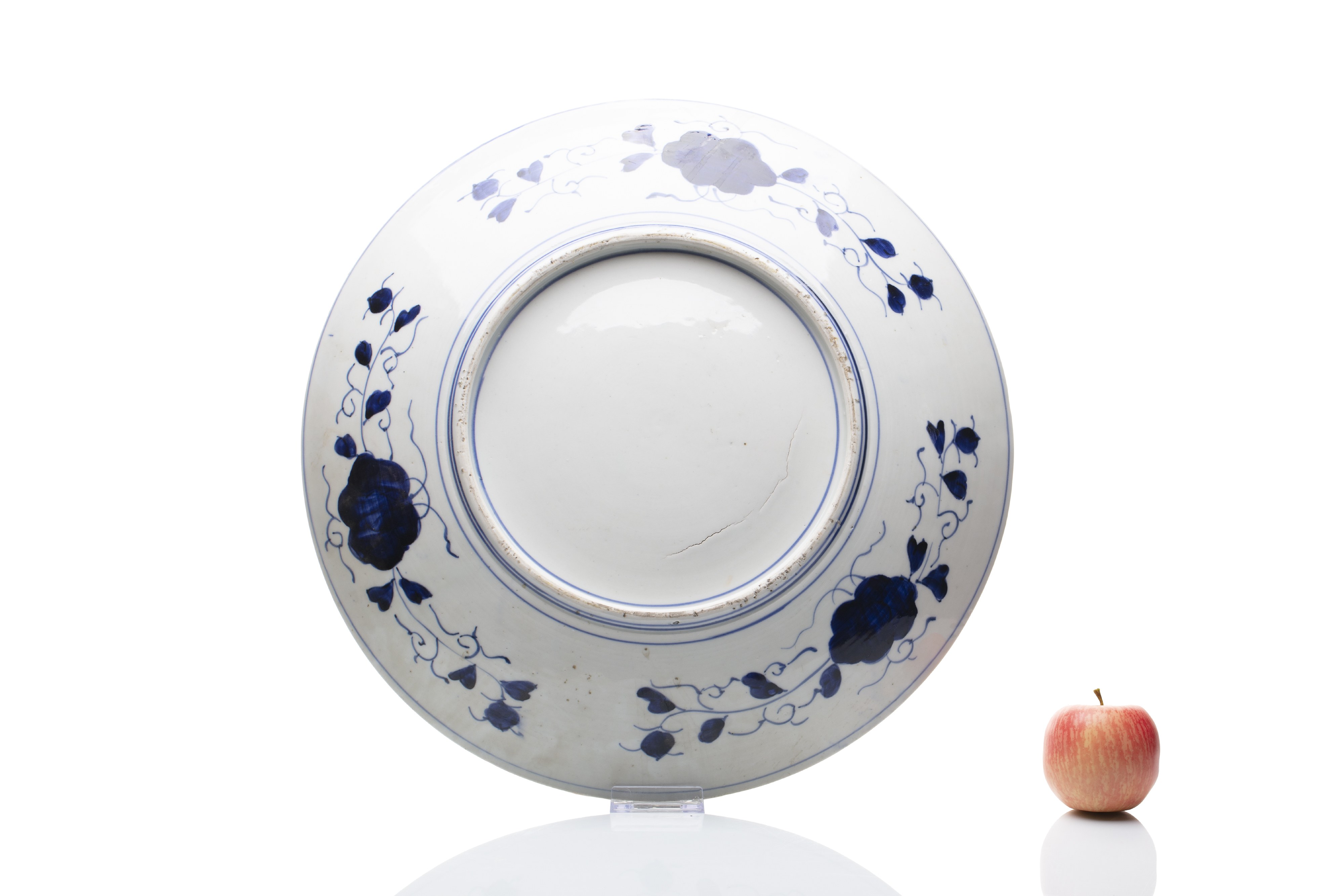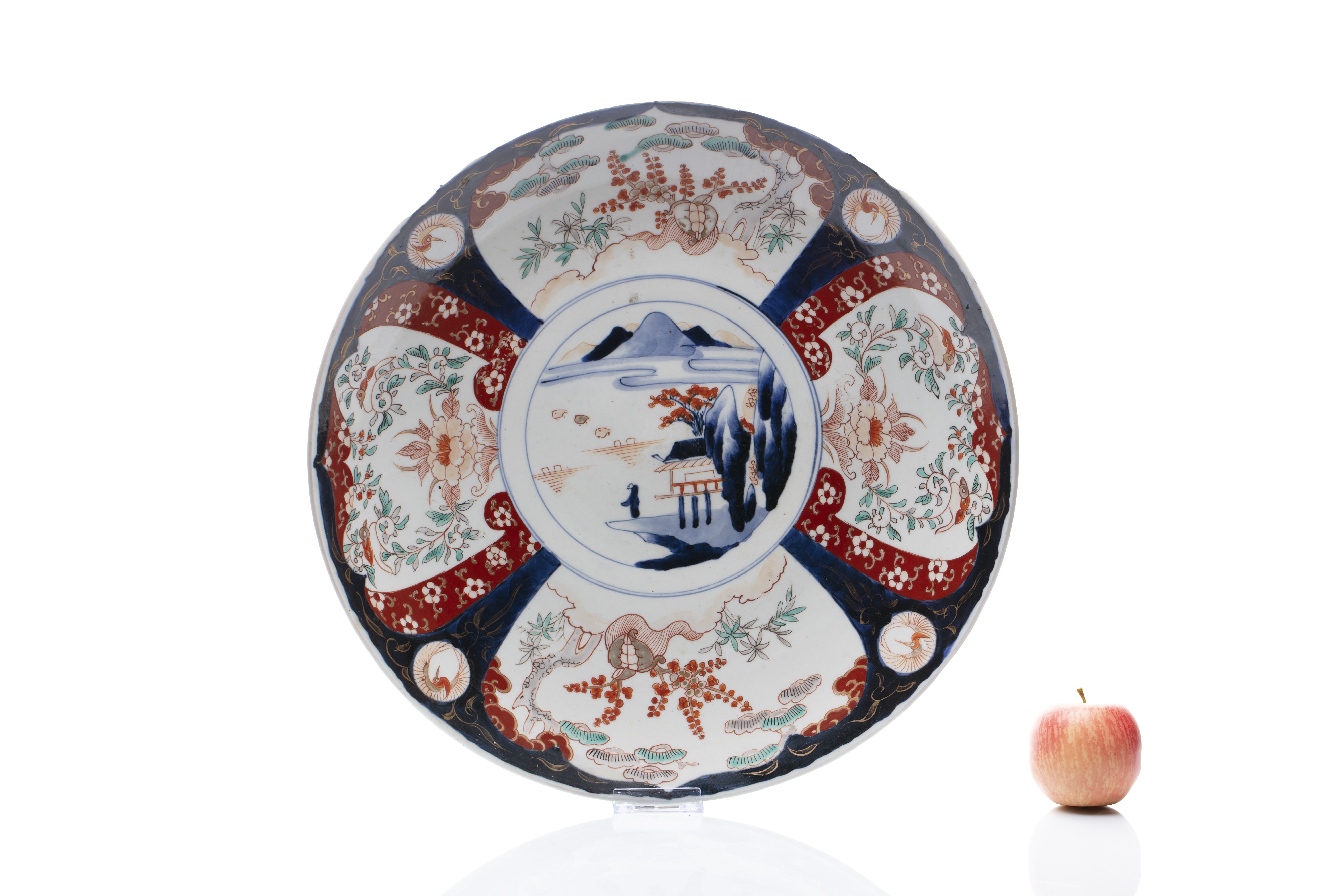 19th century | A larger diameter porcelain plate decorated in the characteristic Imari style. The central circular filling depicts a traditional Japanese landscape with a pavilion by a lake, mountains and a figure in a kimono. | diameter 46 cm