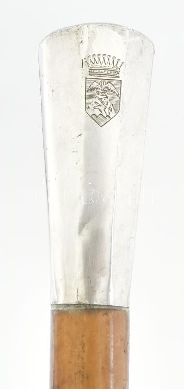 Lovagló pálca.Fa,, bőr csuklópánttal. Ezüst, nyolc oldalú botvég borító 7 cm hosszú ezüst zárórészén kisméretű erdélyi grófi címer ábrázolás látható 76 cm