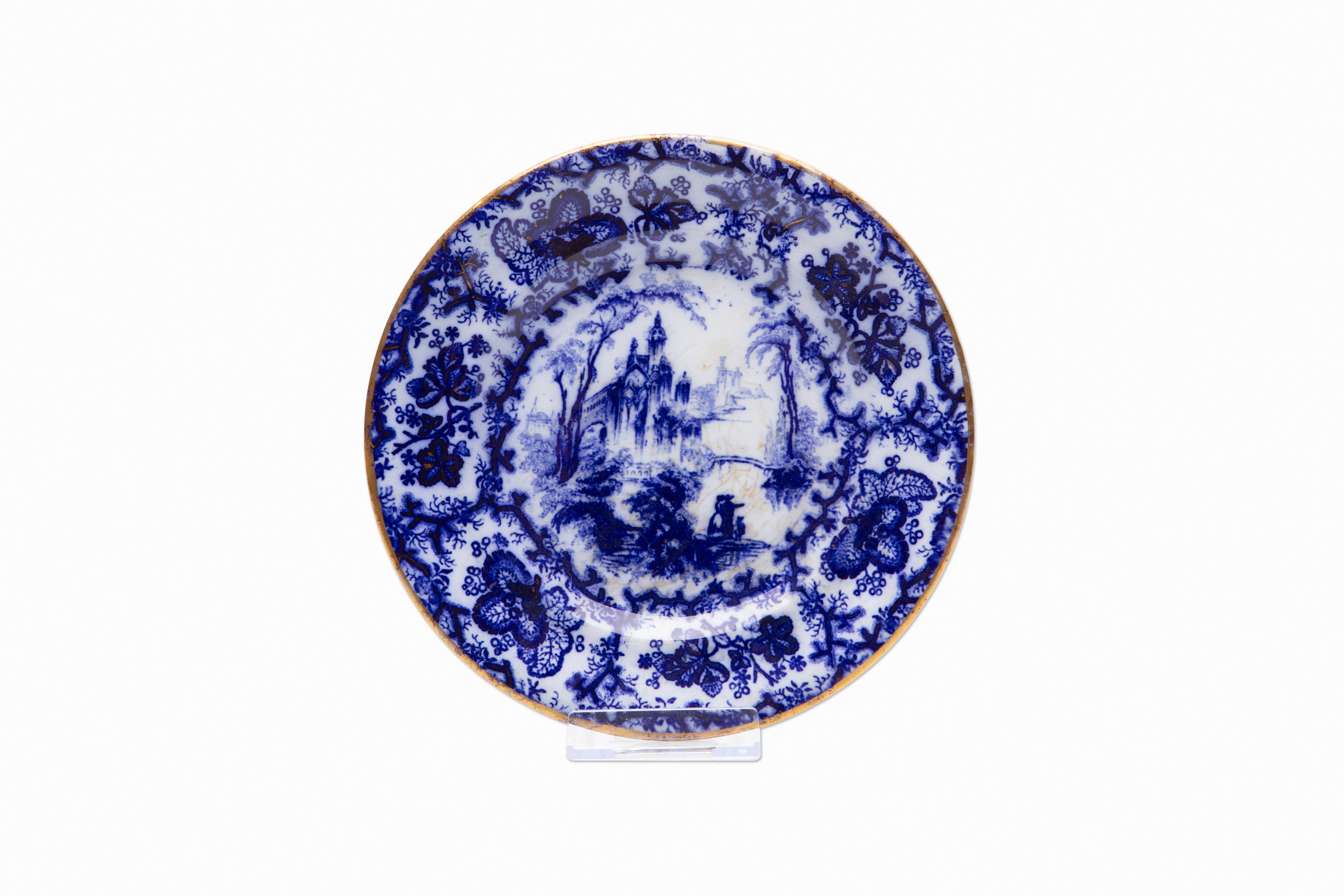 Plate with cobalt blue decor depicting a romantic landscape with architecture and figures, made by the Nowotny porcelain factory, Karlovy Vary (Carlsbad)more photos