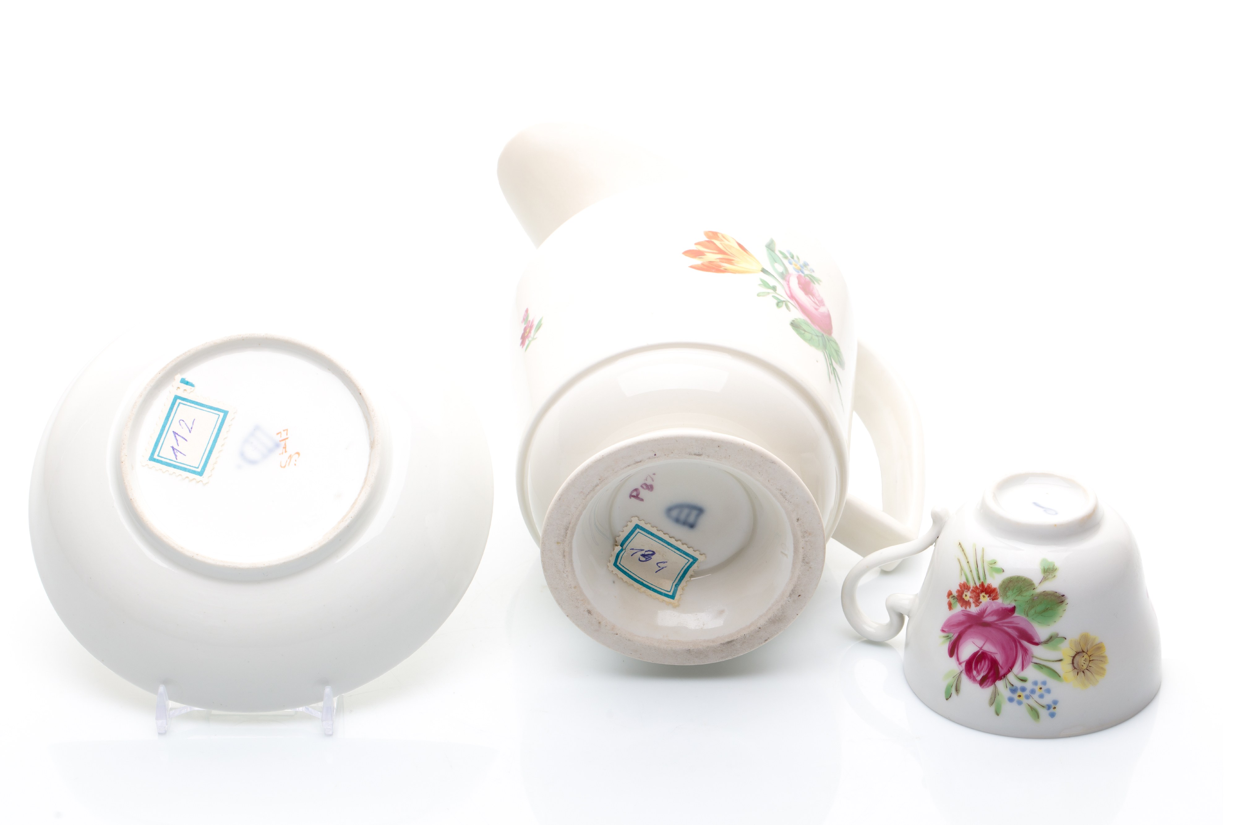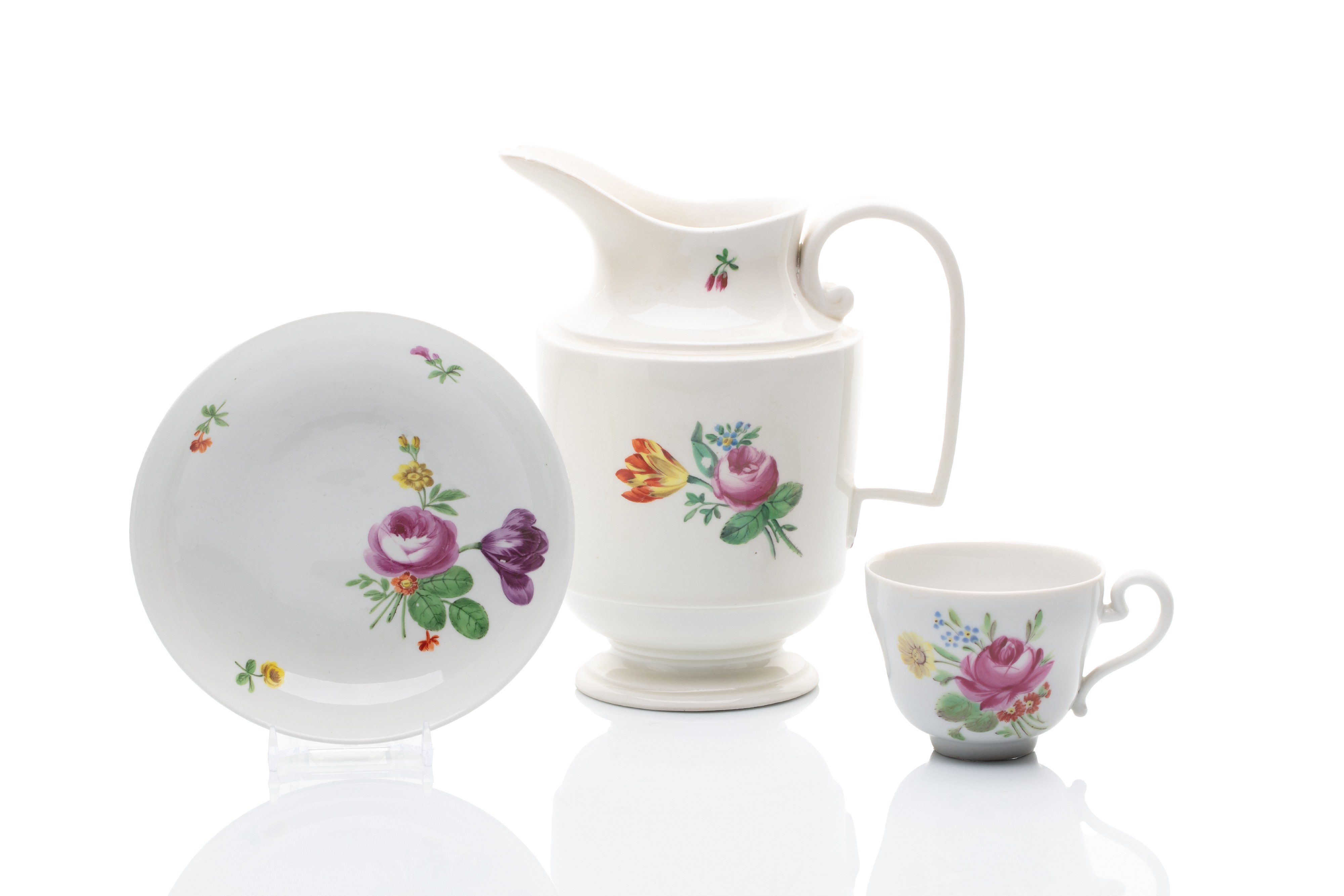 19th century | porcelain, glazed, painted | height of the kettle 17.5 cm, height of the cup 5.8 cm | marked: from below with an underglaze mark | provenance: from the Jungmann family estate | condition: Teapot restored, damaged edge. Cup and saucer in intact condition.