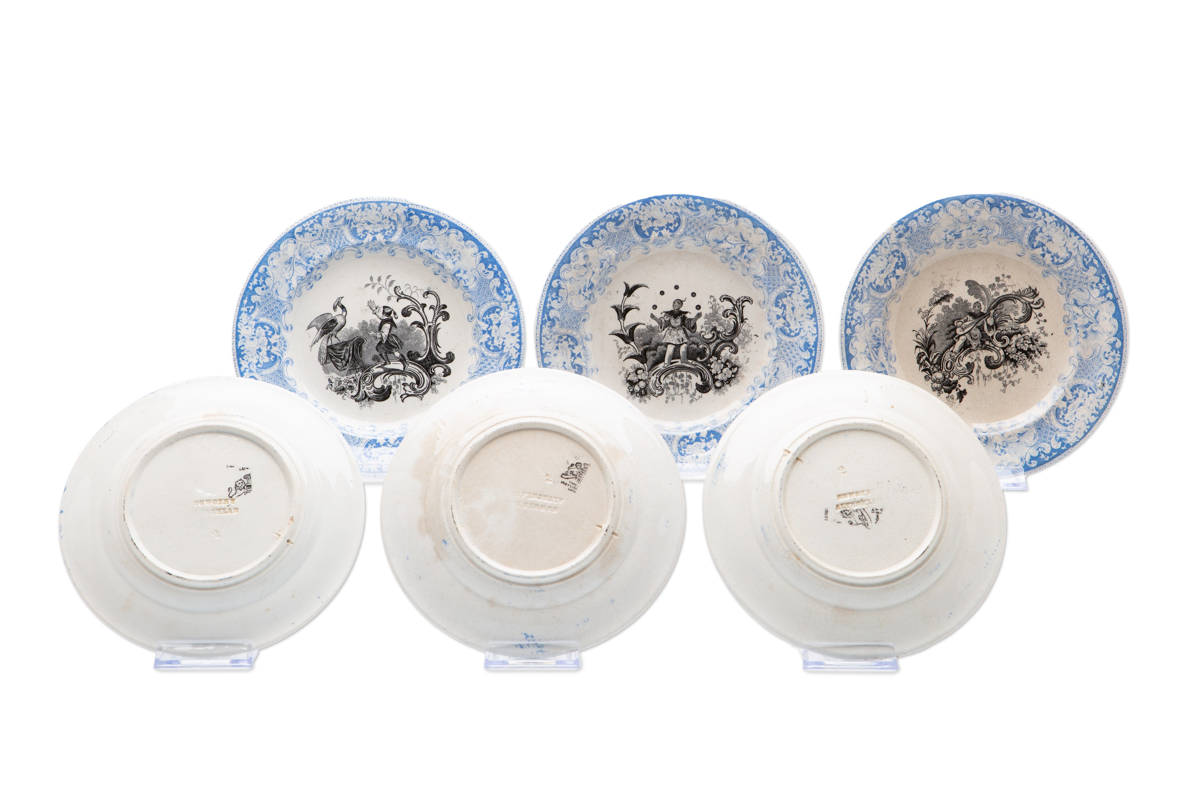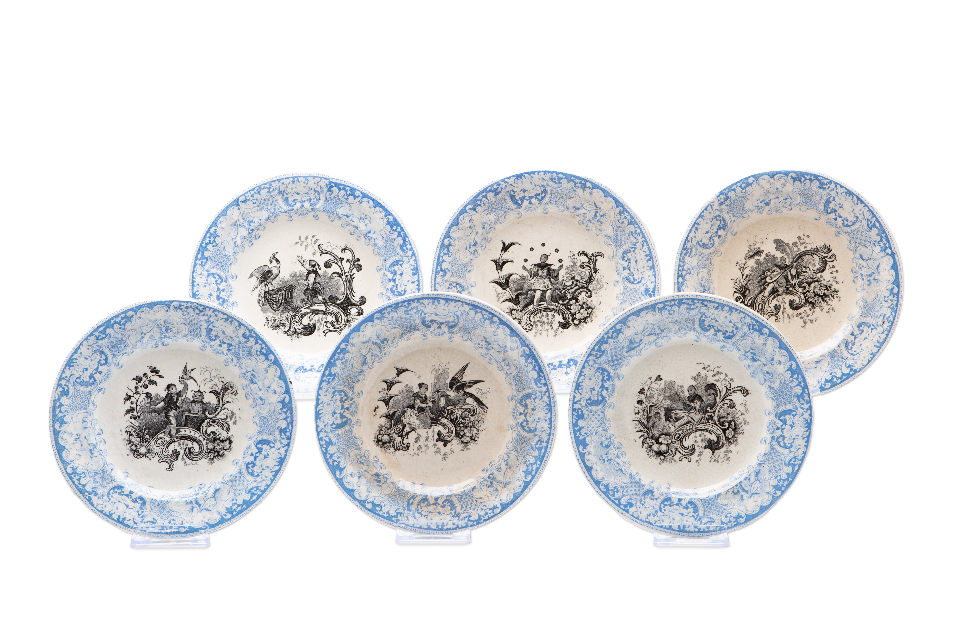 A set of six dessert plates made of fine faience, decorated with black transfer decor in the central cartouche, complemented by a rich blue floral border around the perimeter. Each plate bears a different romantic motif - allegorical figures, flowers, animals or scenes with an oriental touch.more photos