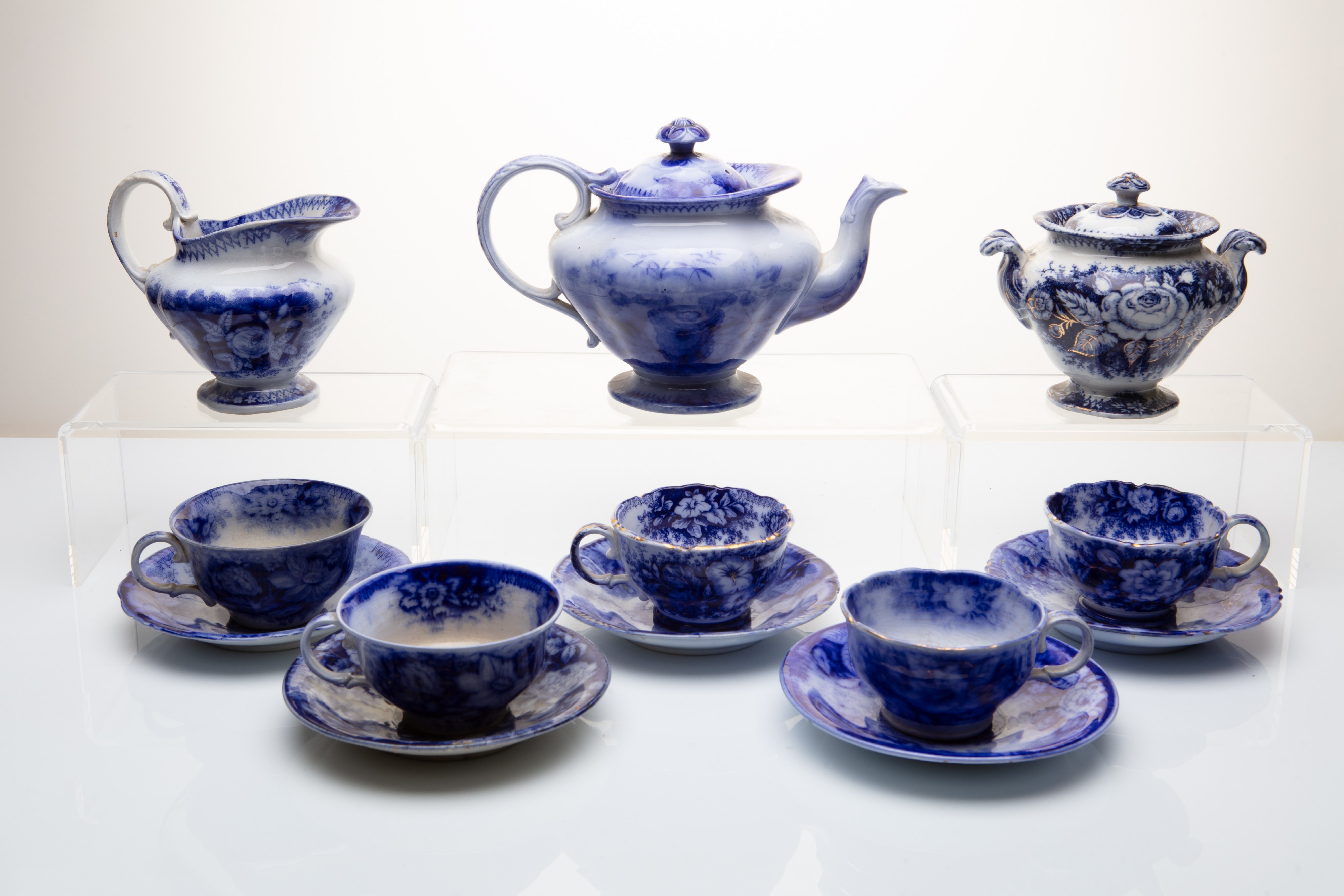 Stoneware tea service consisting of a teapot, sugar bowl, milk jug and four cups with saucers, decorated in blue and white with rich floral motifsmore photos