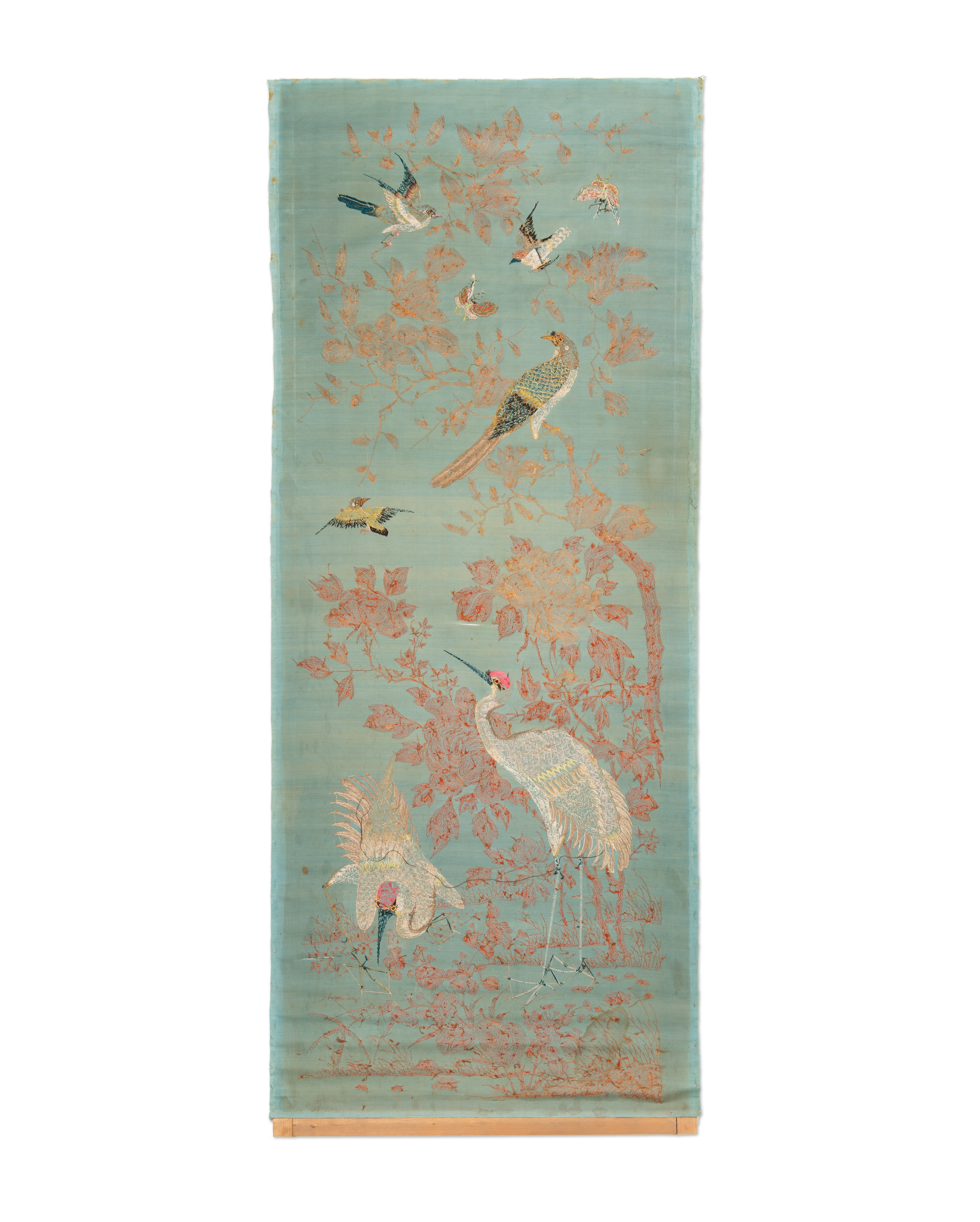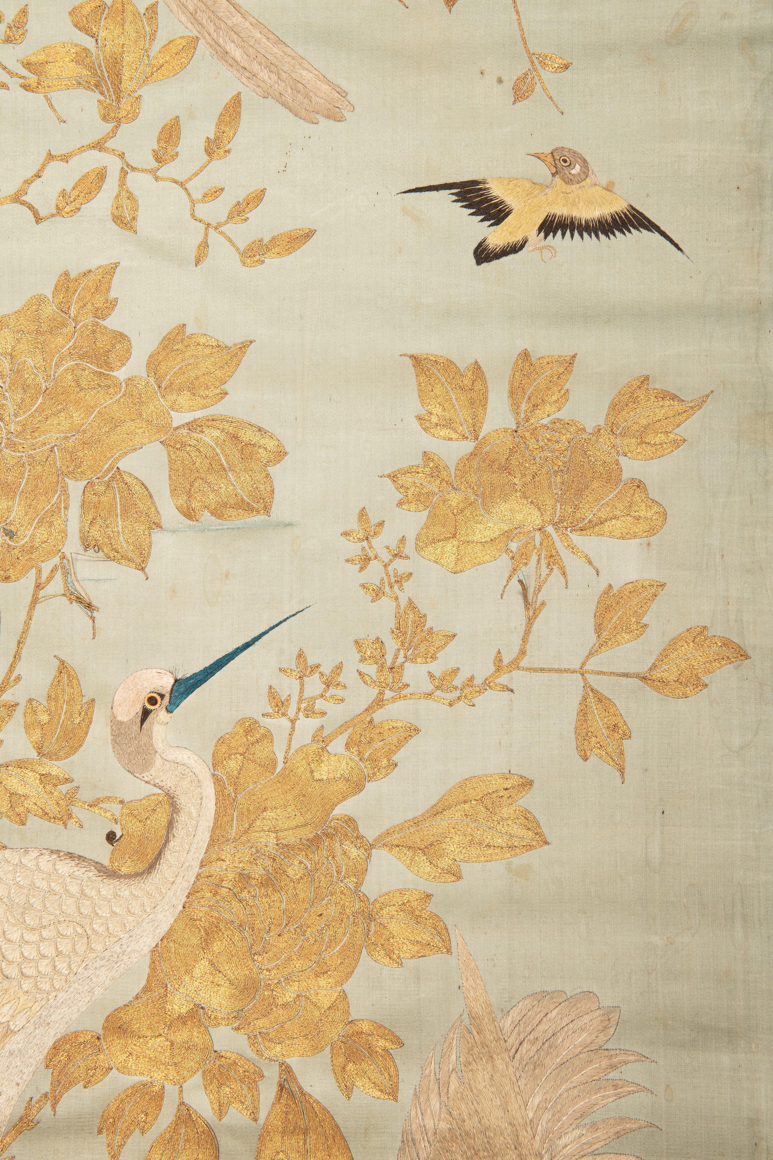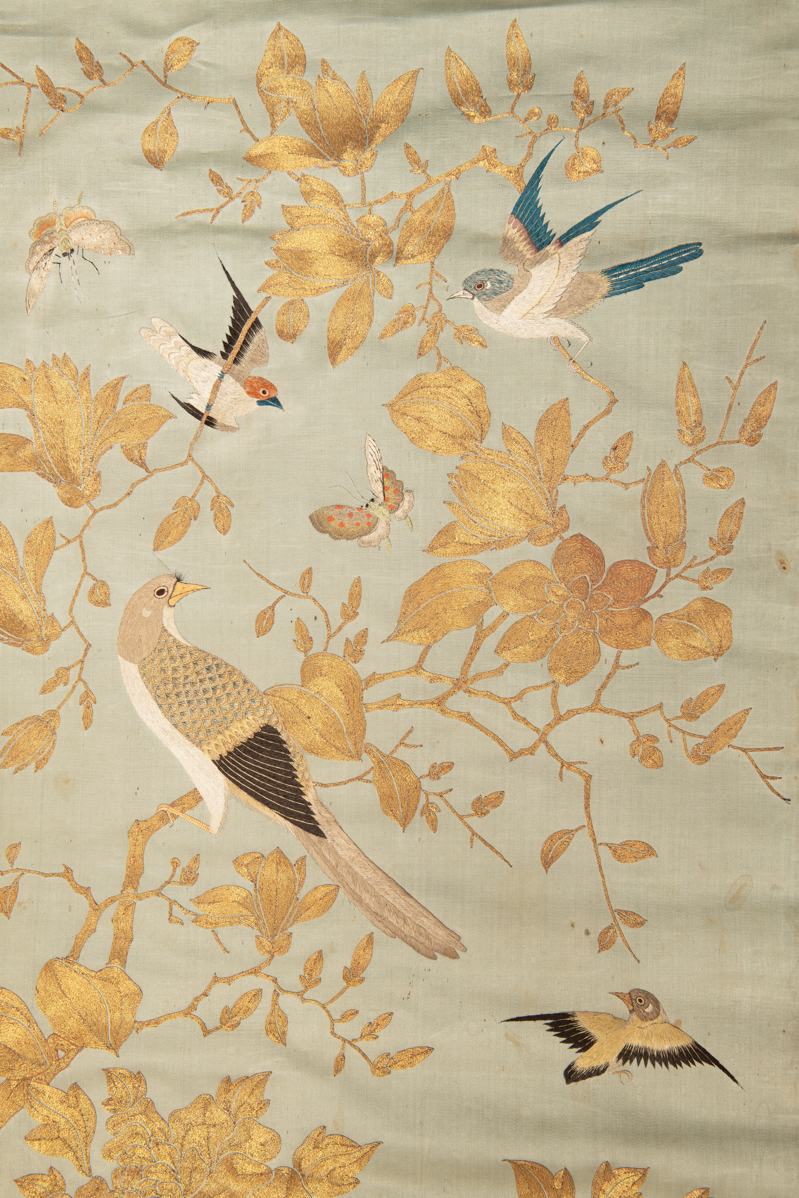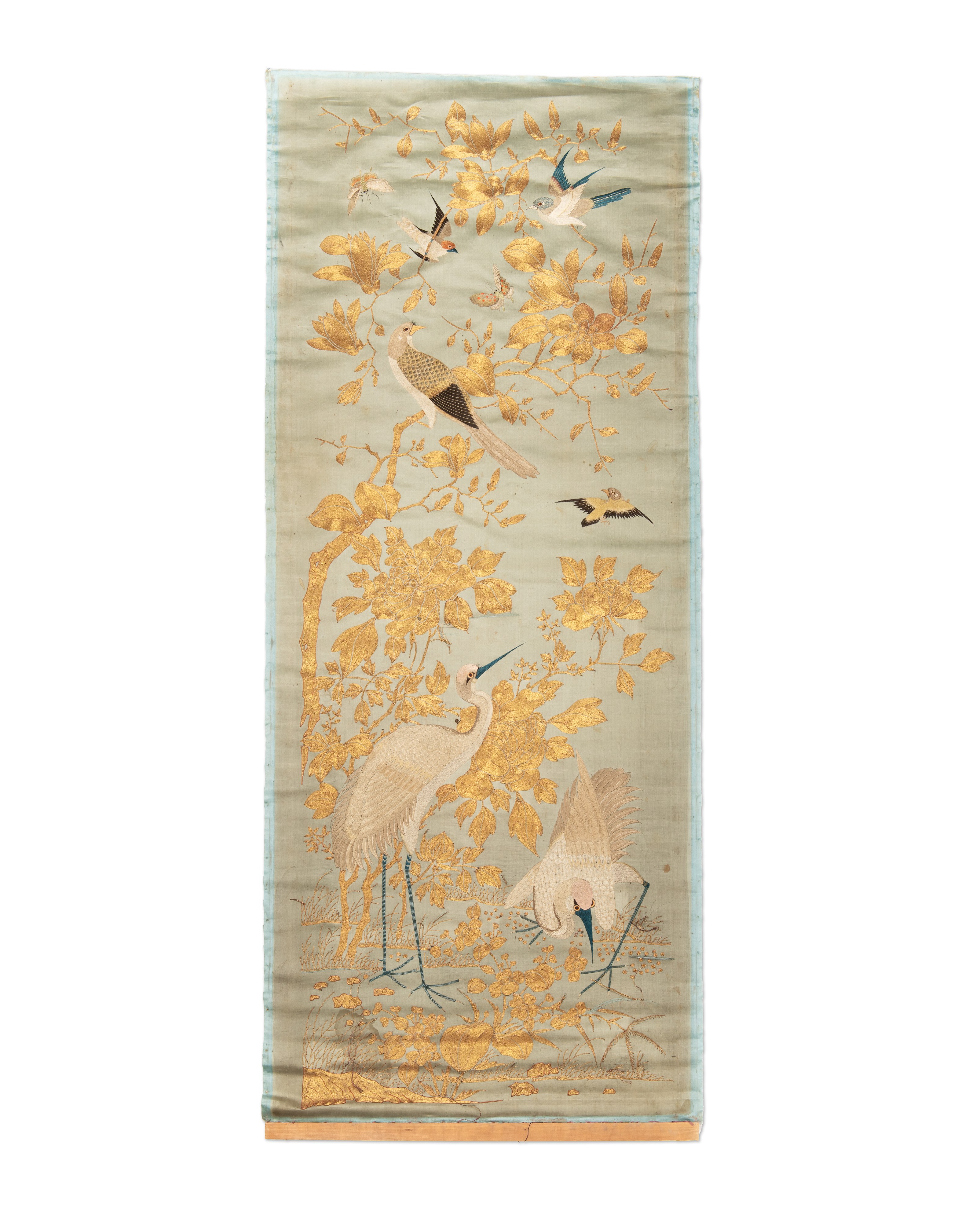 19th-20th century | A decorative textile panel made of fine silk, decorated with rich hand embroidery using gold and colored threads. | 132 x 53 cm | provenance: from the estate of the painter Viktor Stretti (1878-1957) | condition: crack 15 cm
