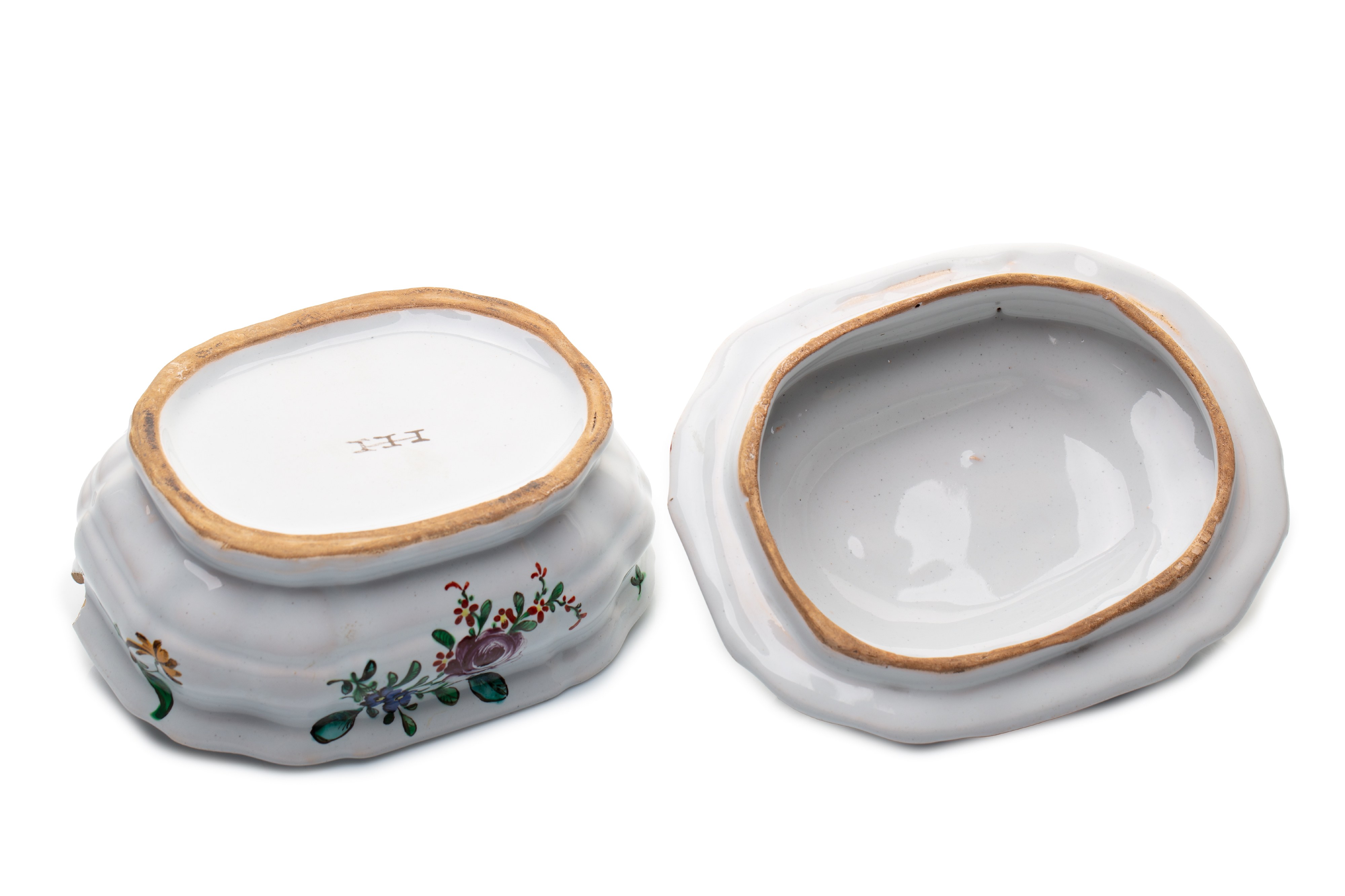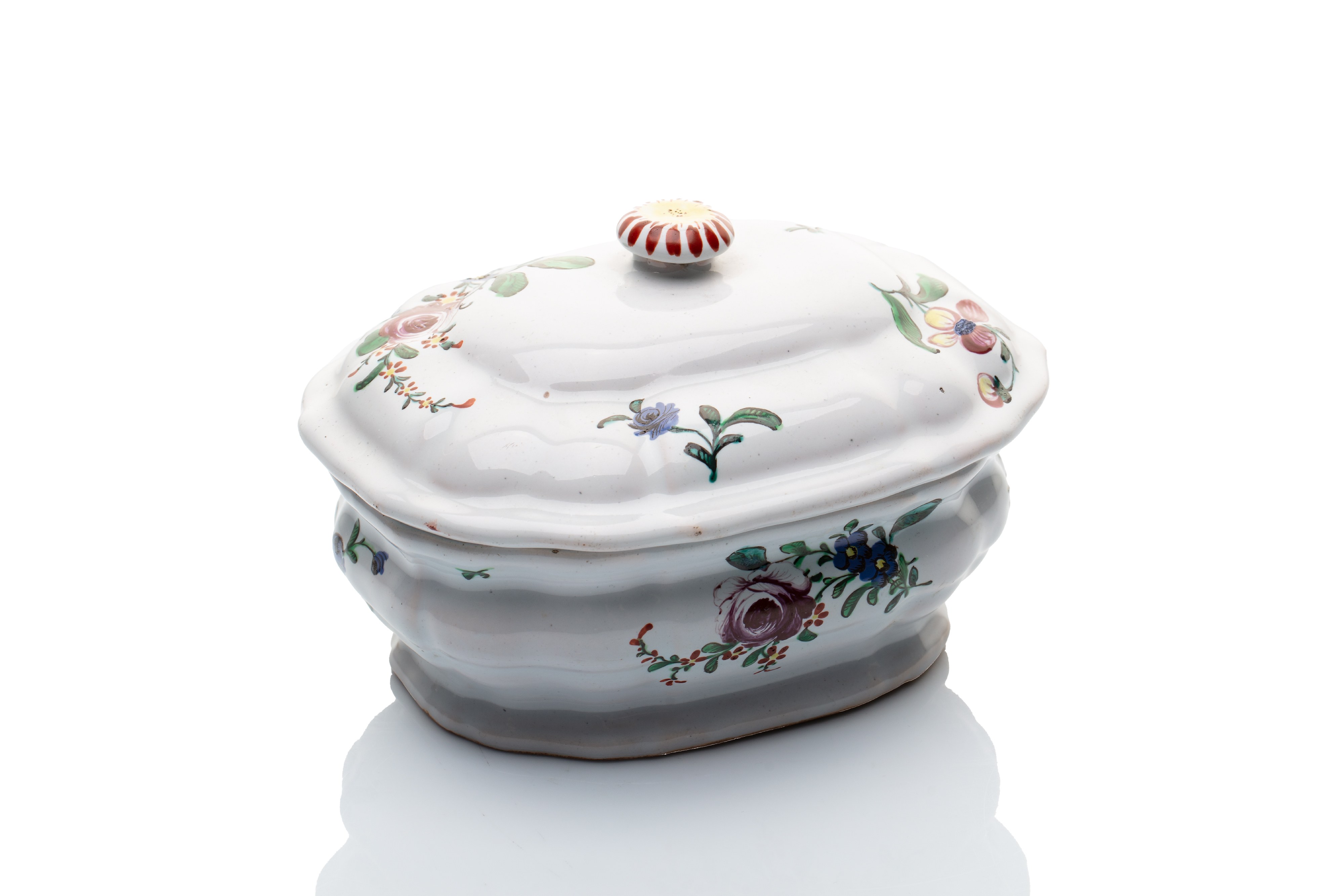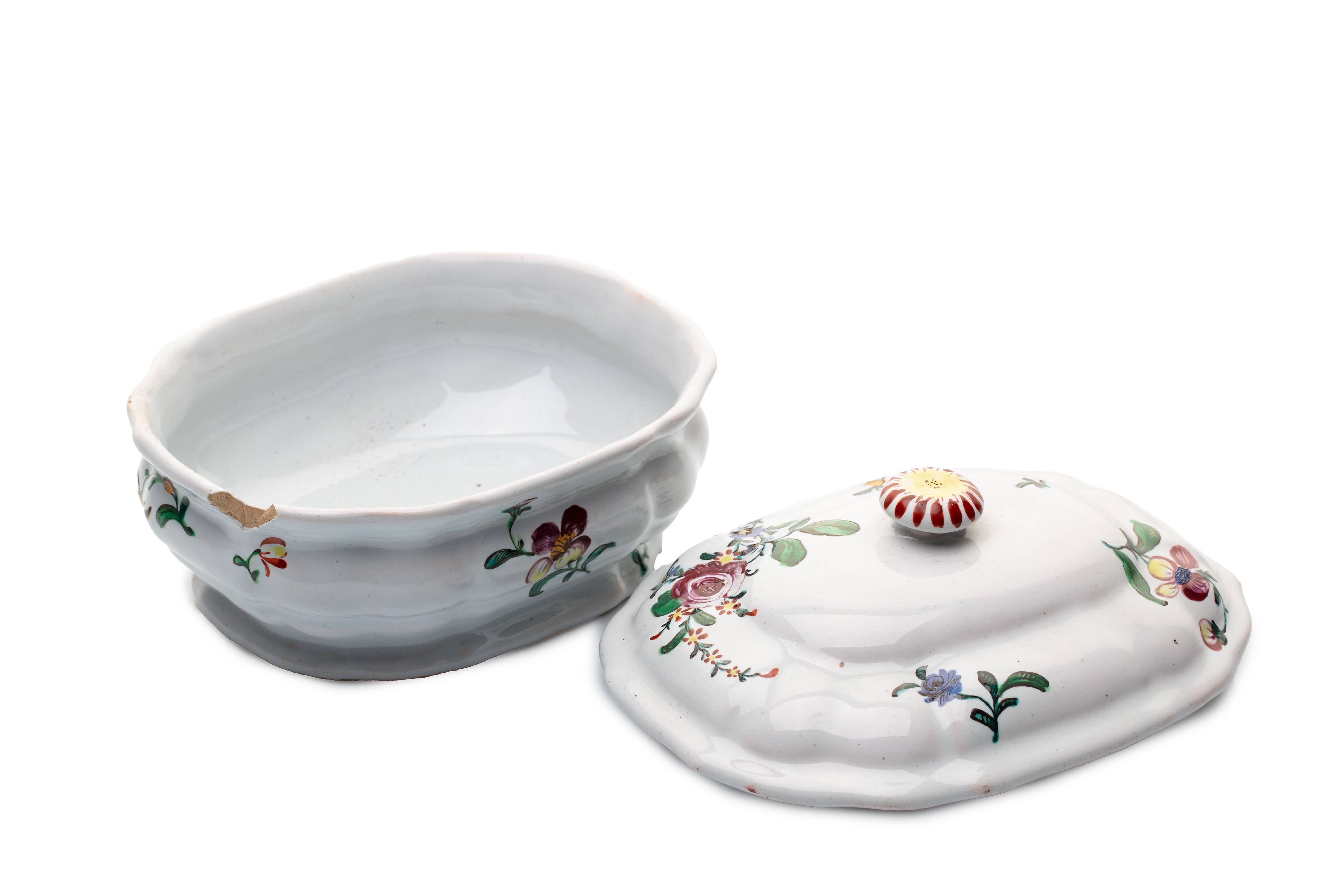 18th century | oval faience bowl with lid, richly sculpted | height 9.5 cm, length 16 cm | marked: from below with an underglaze mark | provenance: from the Jungmann family estate | condition: damaged edge