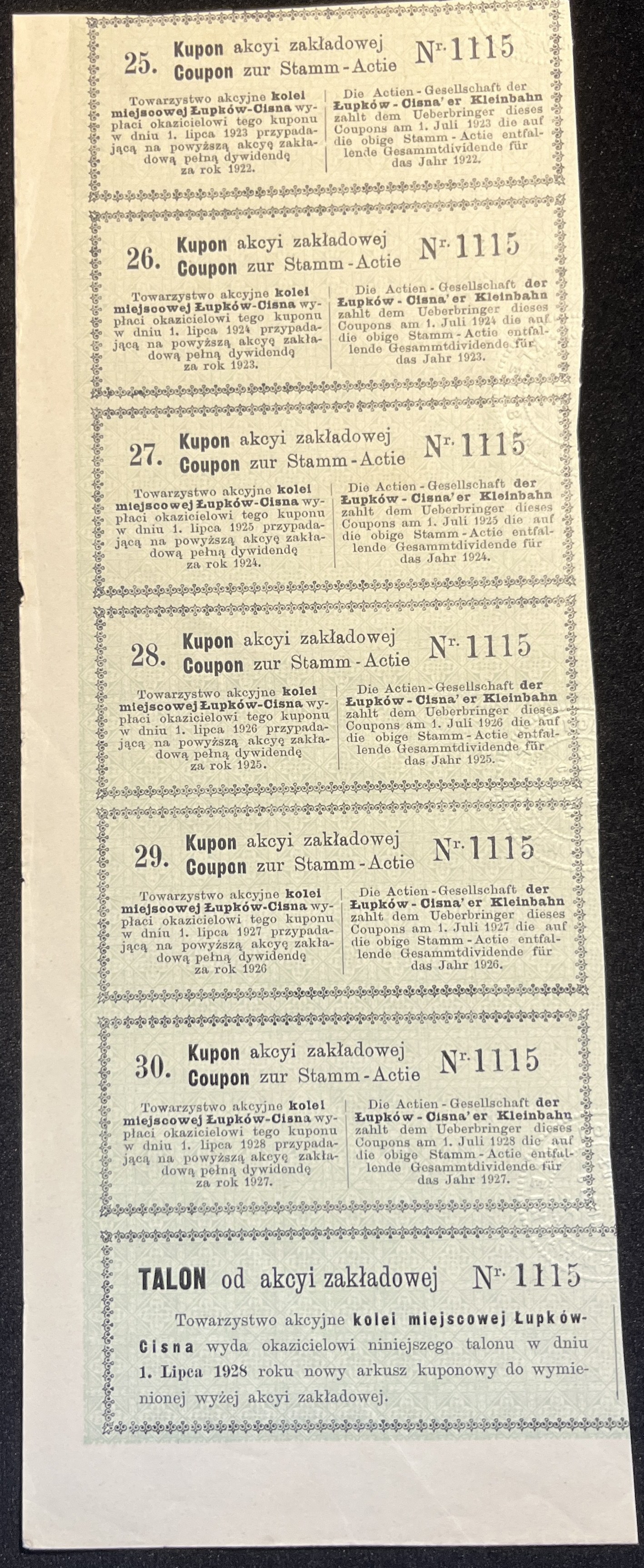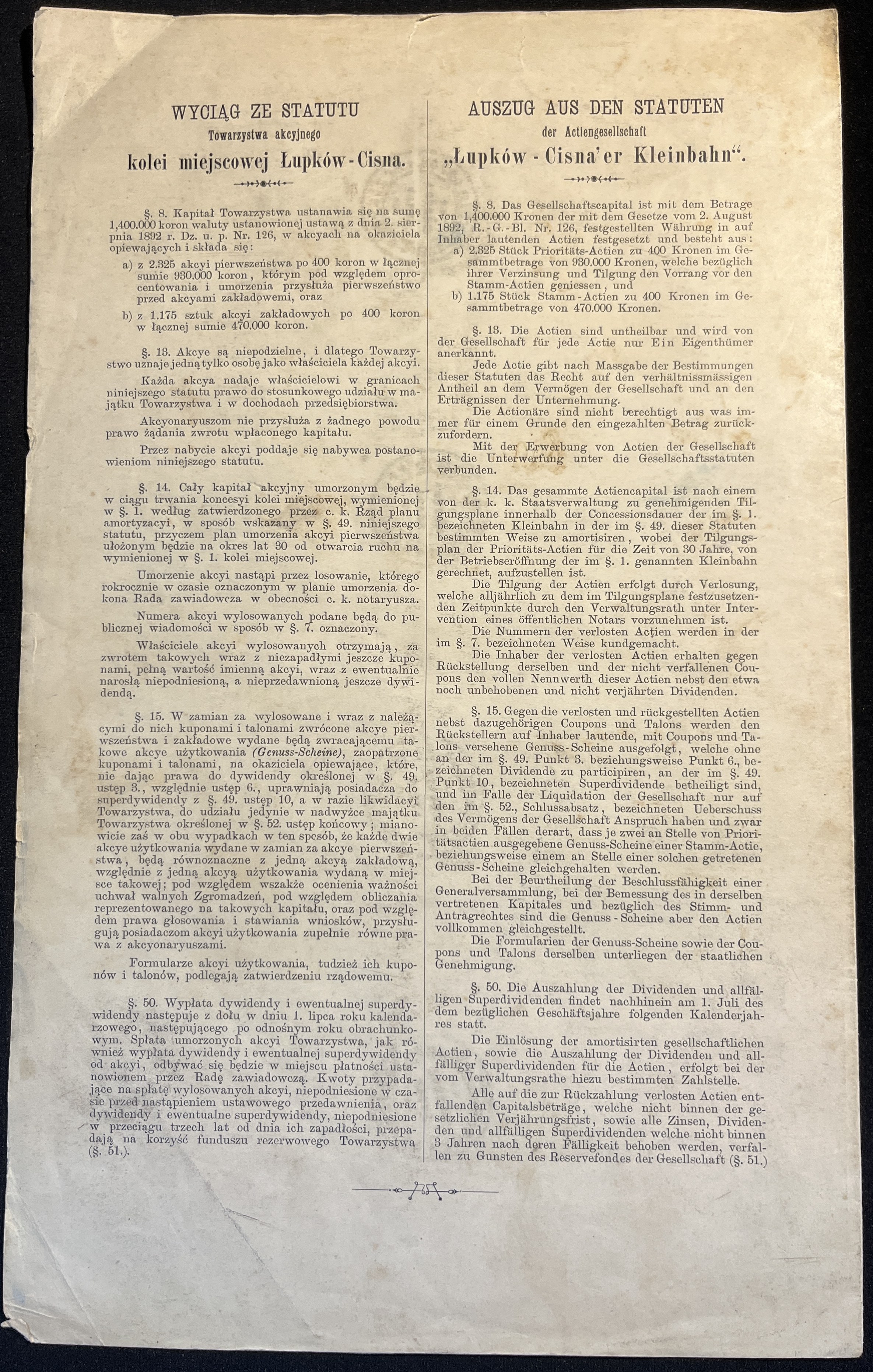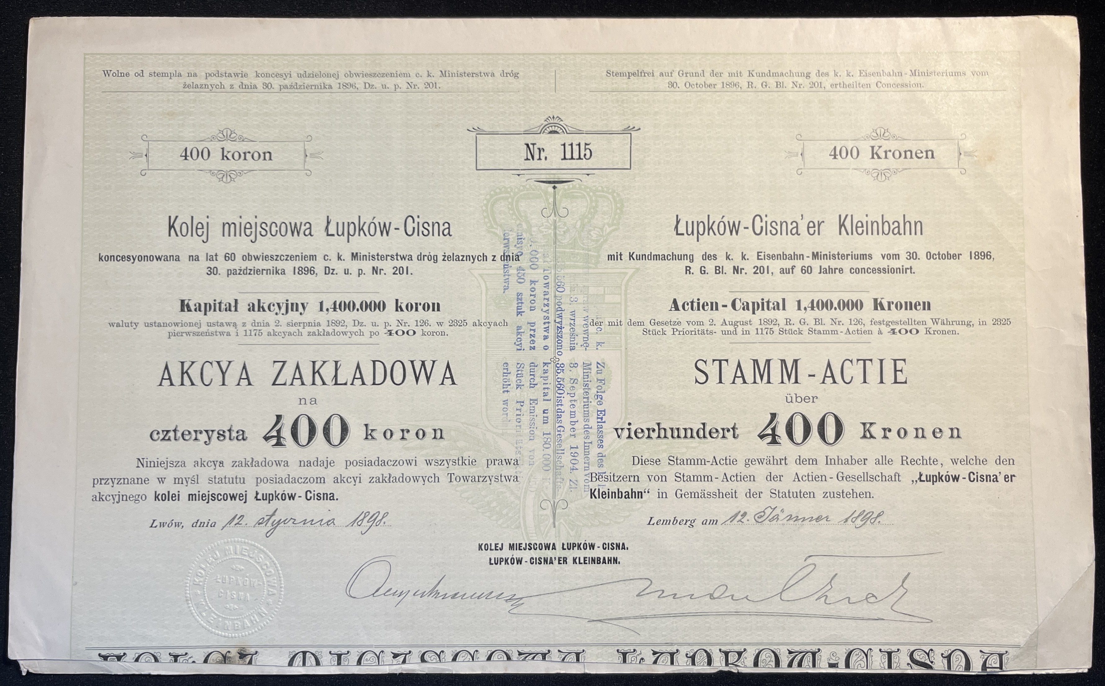 [1892] LWÓW. Kolej miejscowa Łupków-Cisna. Akcya zakładowa na czterysta koron