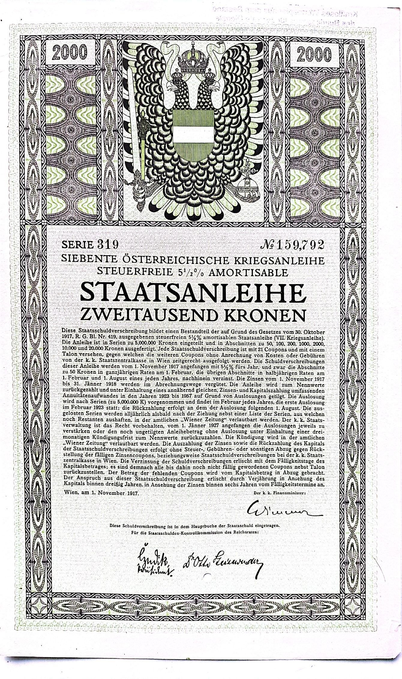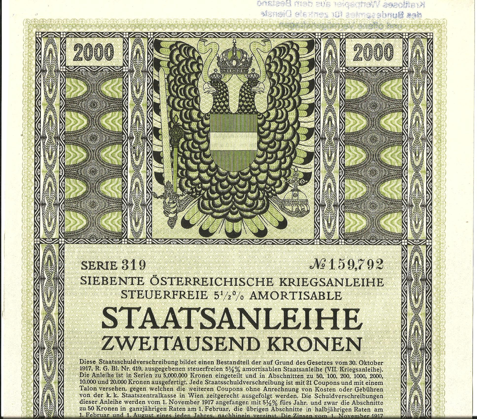 91. 1917. SIÓDMA 5,5% AUSTRYACKA POŻYCZKA WOJENNA. DWA TYSIĄCE KORON.