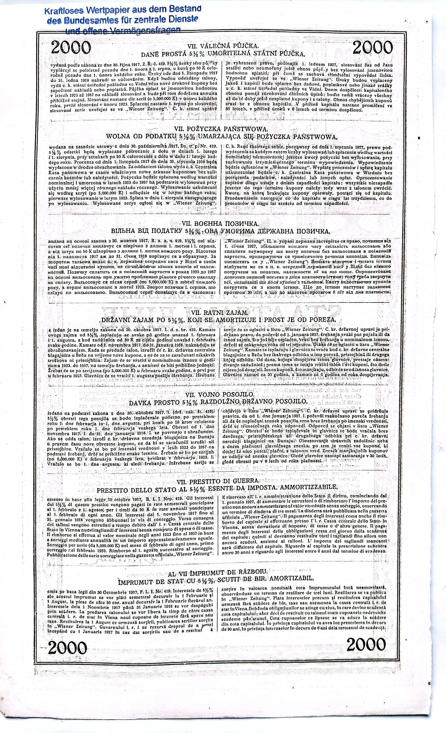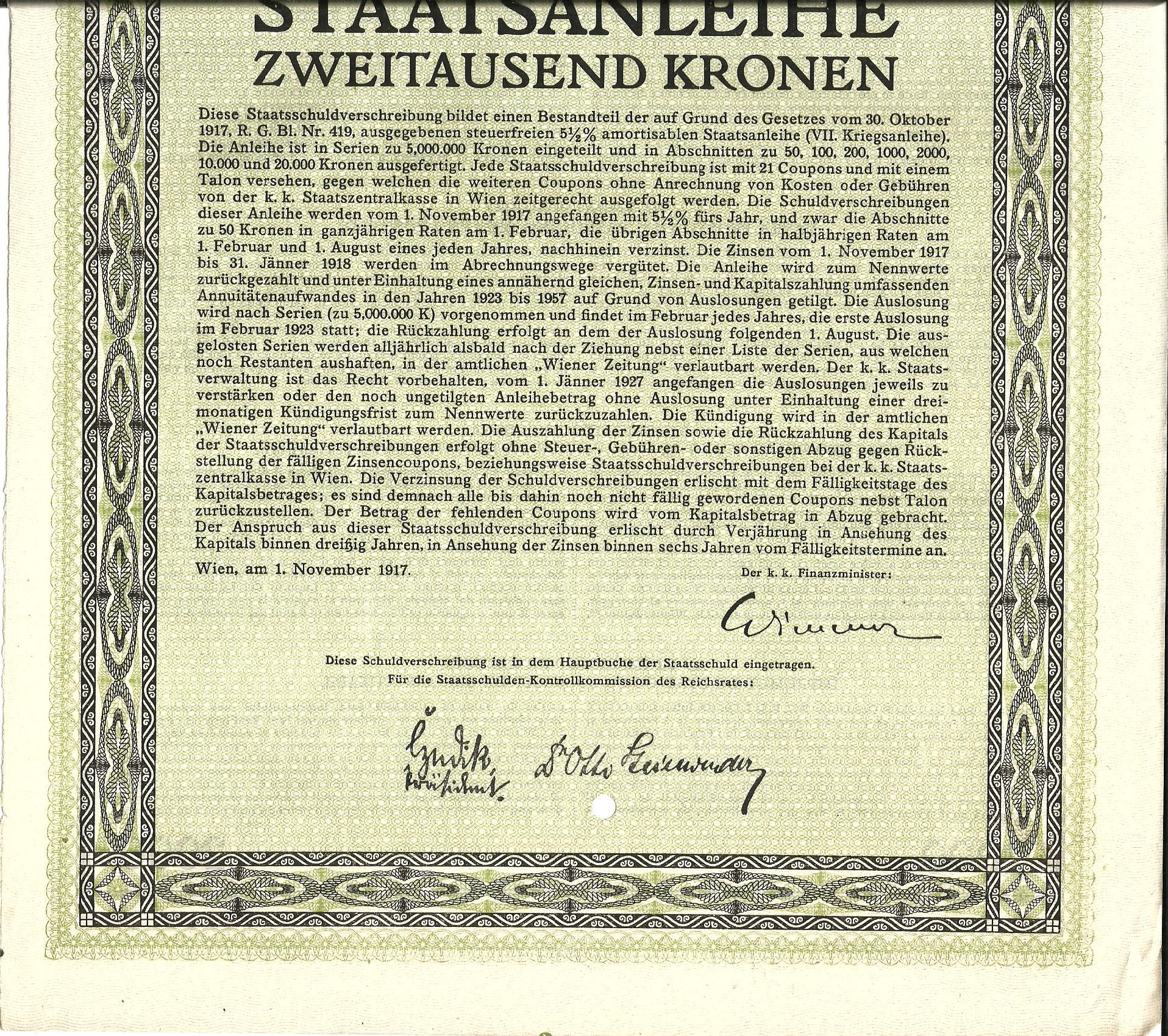 Opis: 5,5 % OBLIGACJA PAŃSTWOWA WOJENNA C. K. AUSTRII WYSTAWIONA W WIEDNIU. OBLIGACJA DWUSTRONNA W 8 JĘZYKACH. PIĘKNE MOTYWY DEKORACYJNE Z HERBEM AUSTRO-WĘGIER I MOTYWAMI SECESYJNYMI NA WYJĄTKOWEJ BORDIURZE. UWAGA! PAPIER W 8 JĘZYKACH, TAKŻE PO POLSKU UKAZUJĄCY WIELONARODOWĄ STRUKTURĘ DEMOGRAFICZNĄ C.K. AUSTRII. JEST TO CIEKAWY PRZYKŁAD OBLIGACJI Z CZASÓW PIERWSZEJ WOJNY ŚWIATOWEJ UPADAJĄCEJ JUŻ MONARCHII AUSTRO-WĘGIERSKIEJ.