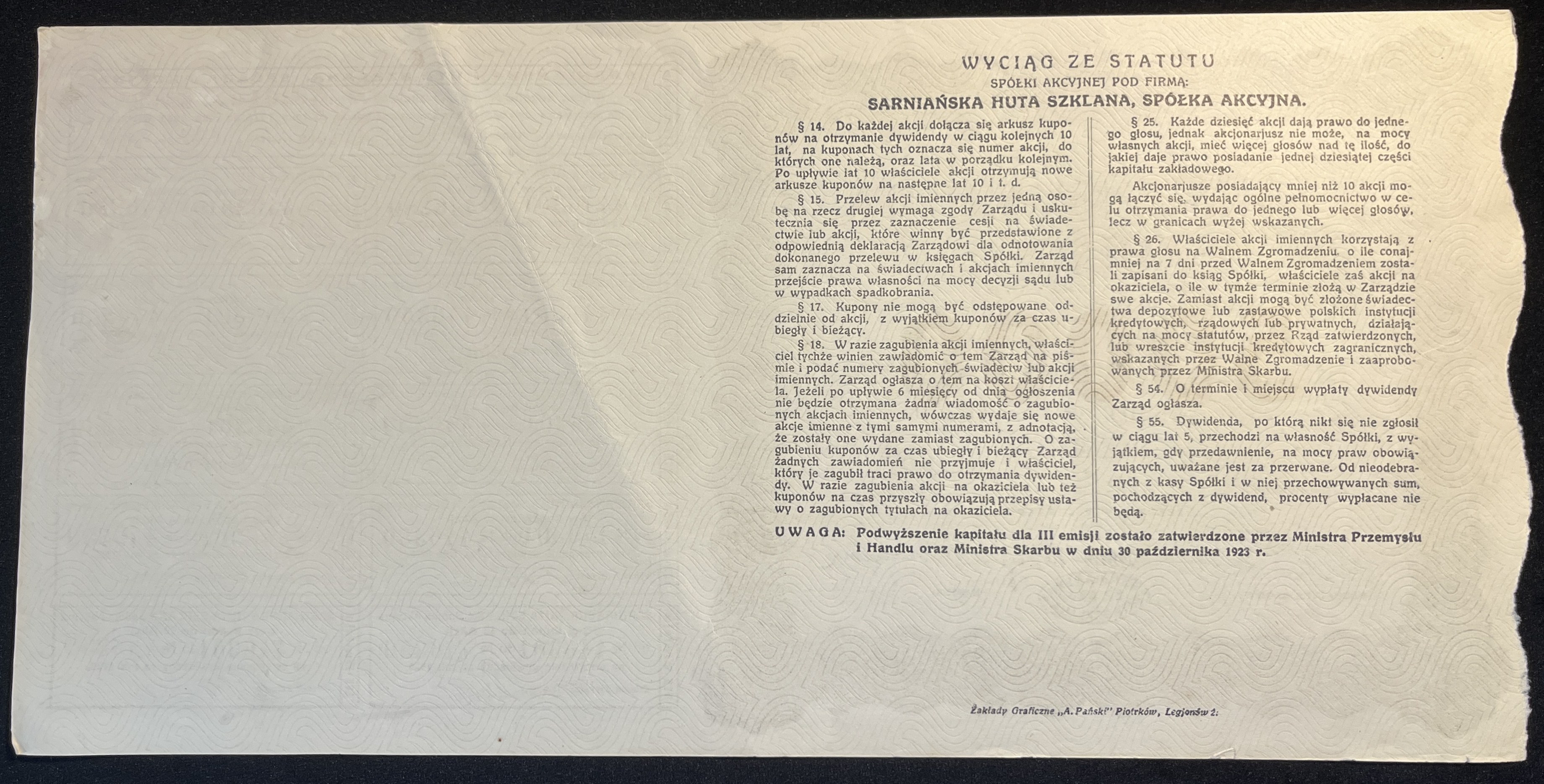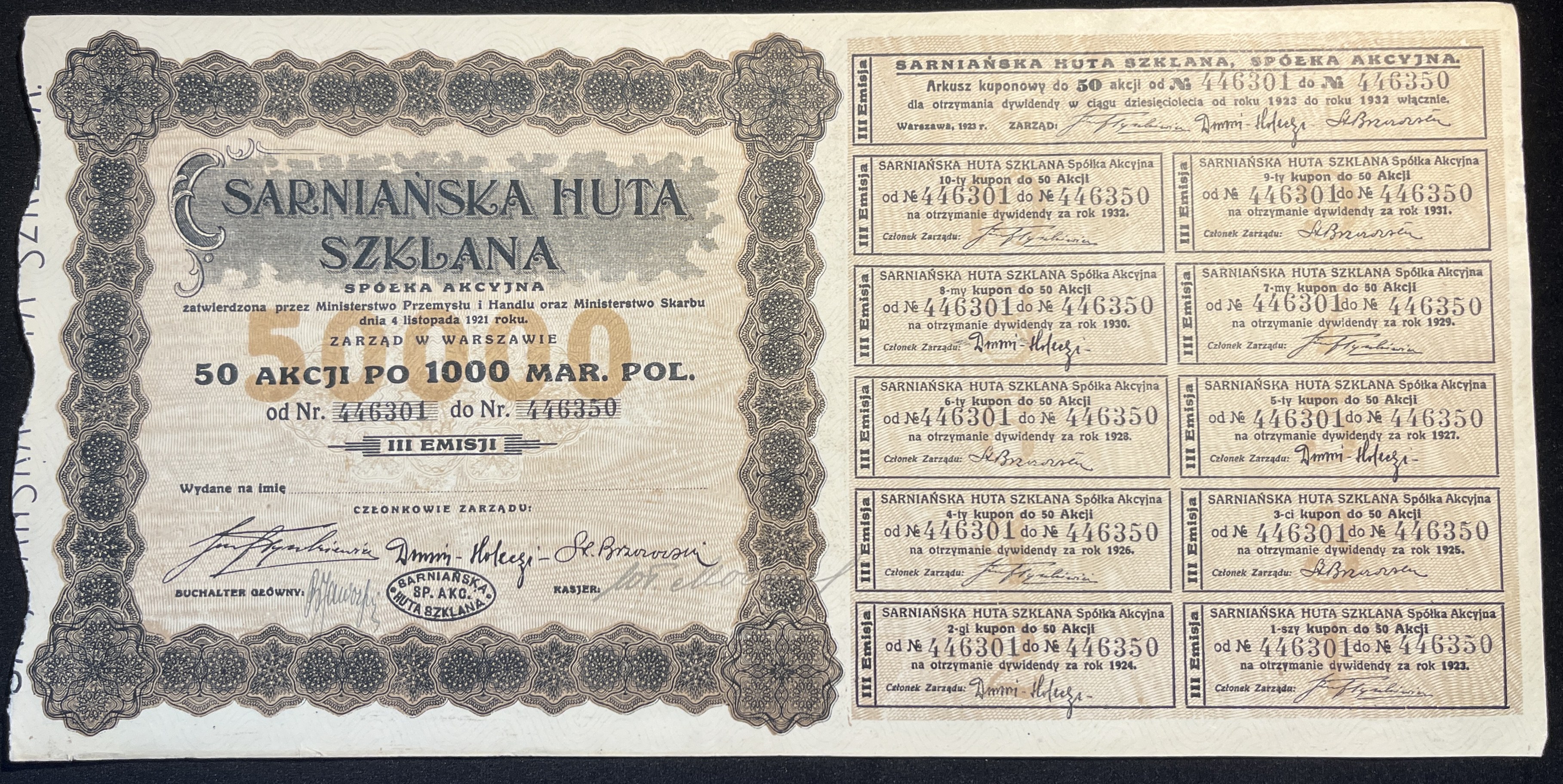 [1921] WARSZAWA. Sarniańska Huta Szklana. III emisji. 50 akcji po 1000 marek polskich.
