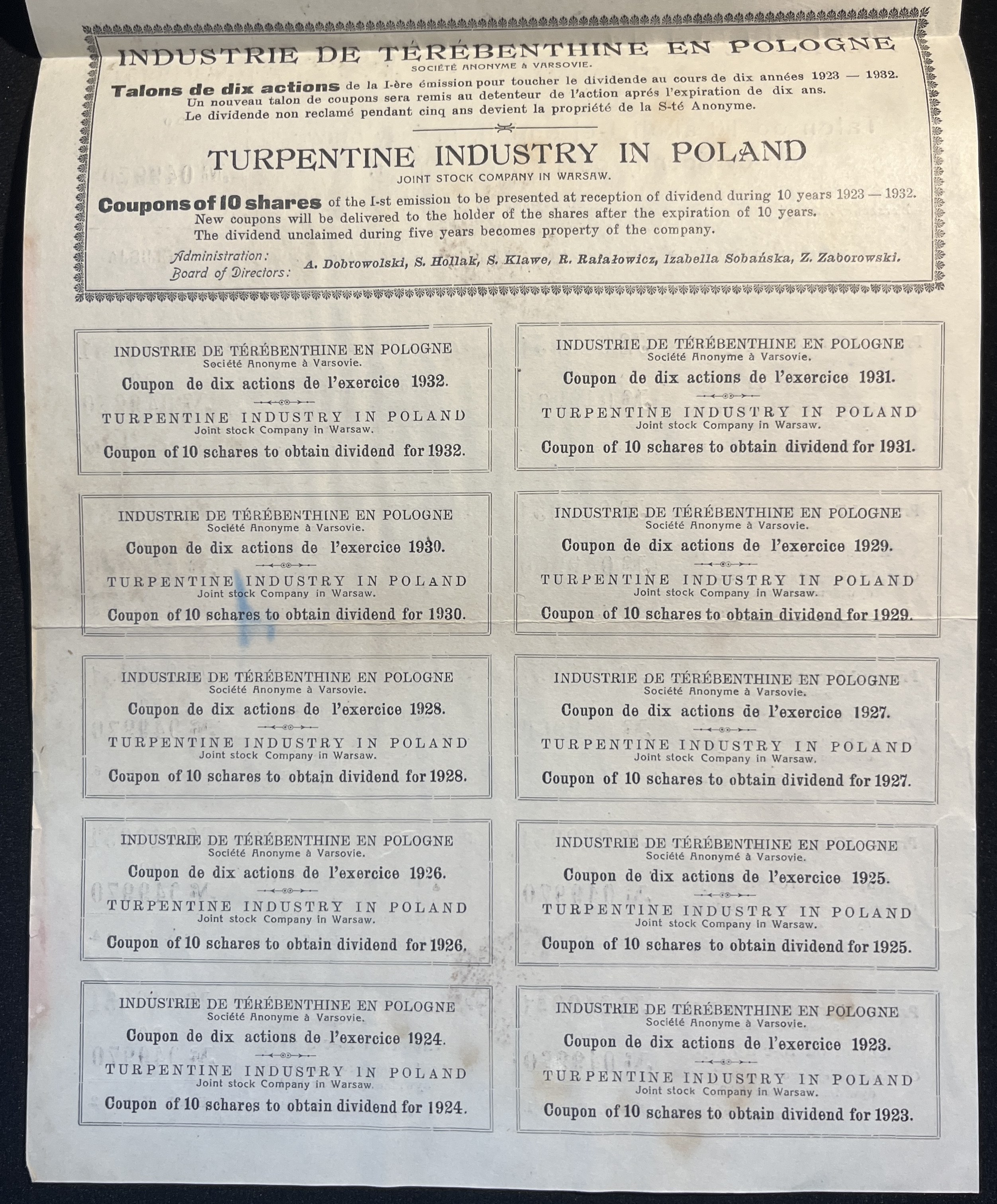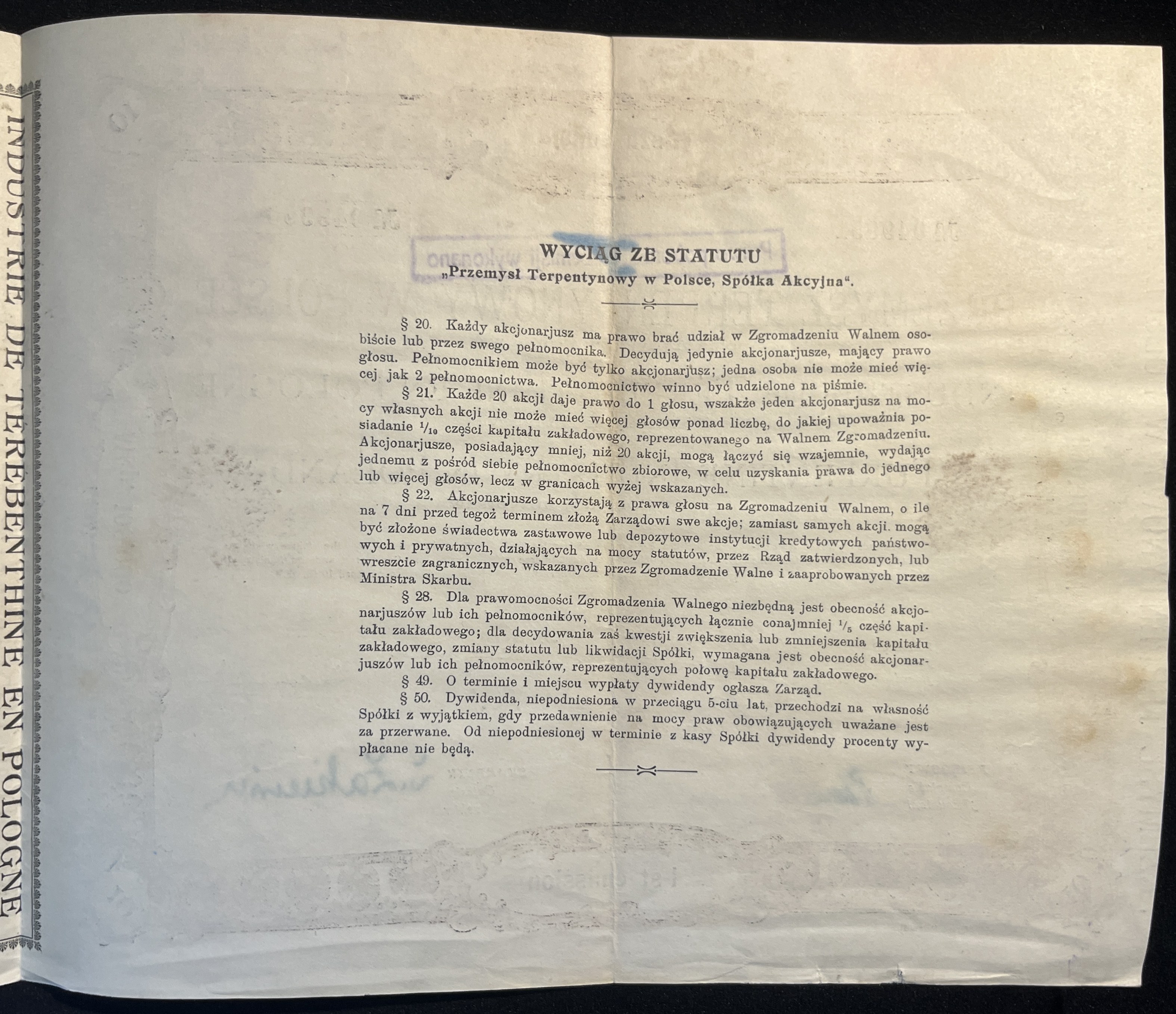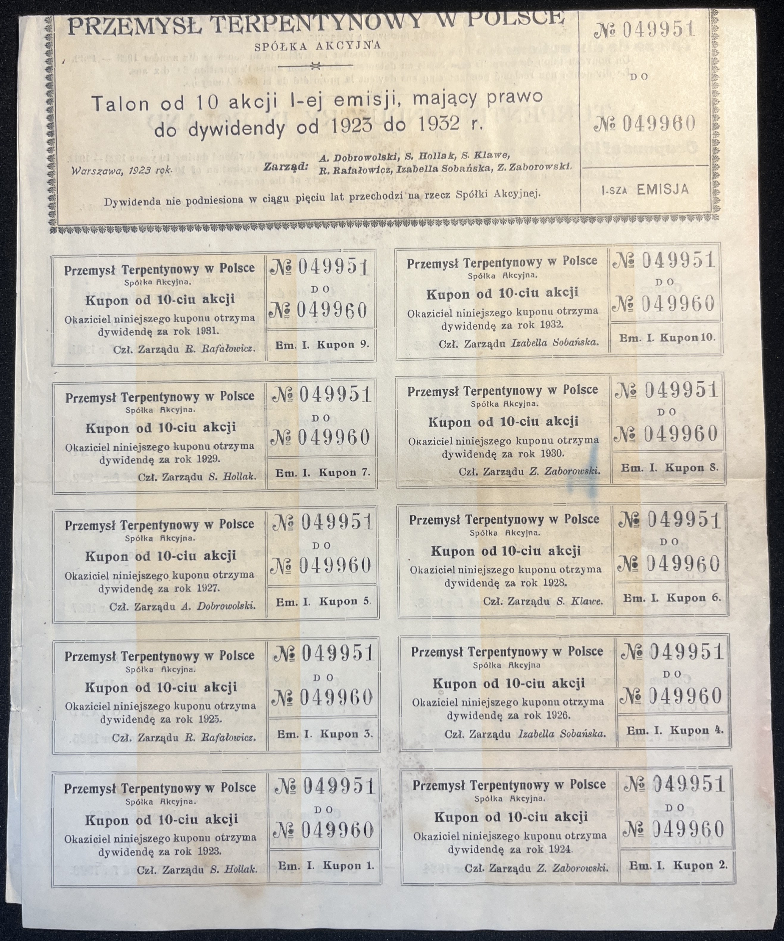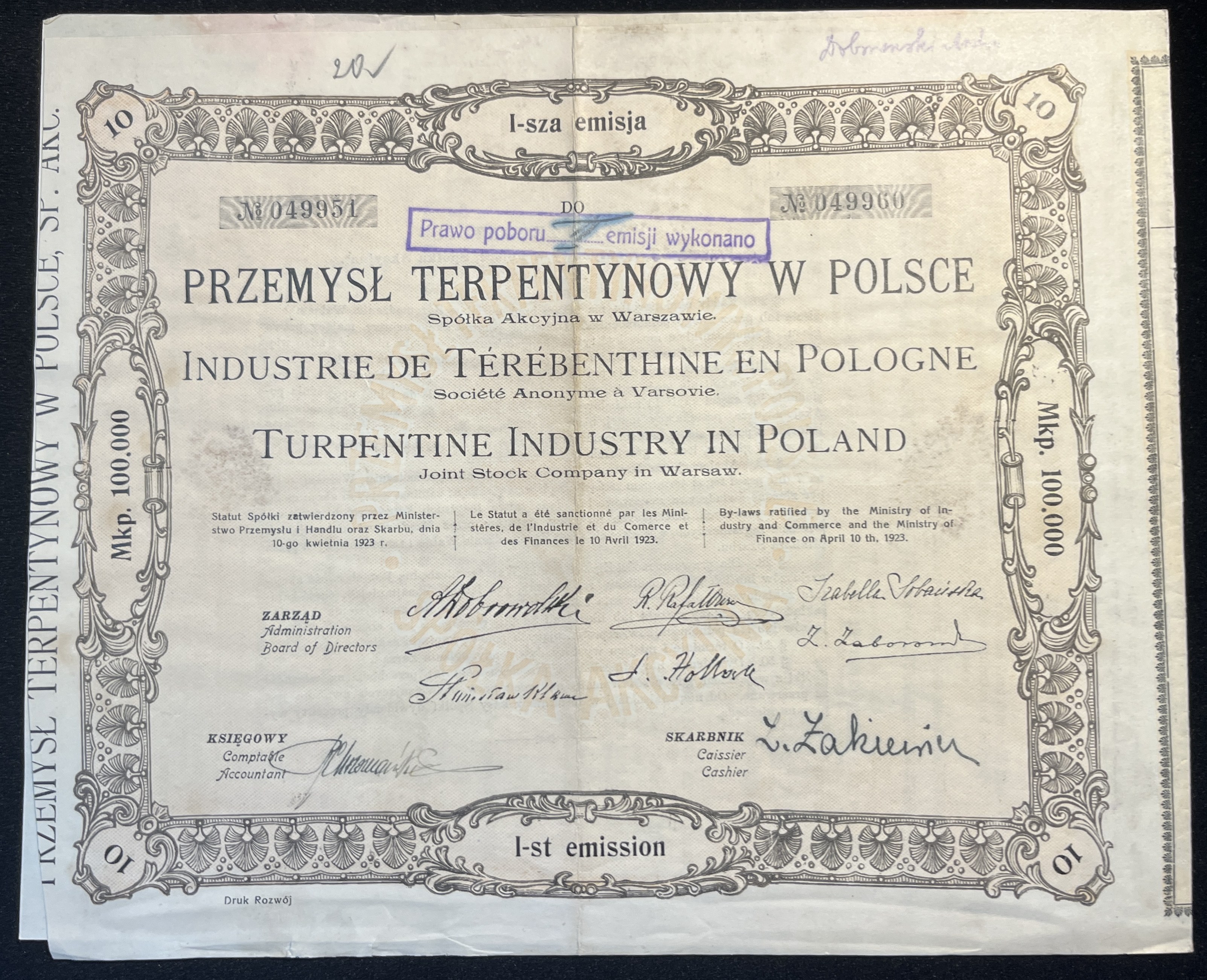 [1923] WARSZAWA. 1-sza emisja. Przemysł Terpentynowy w Polsce. 100.000 marek polskich.