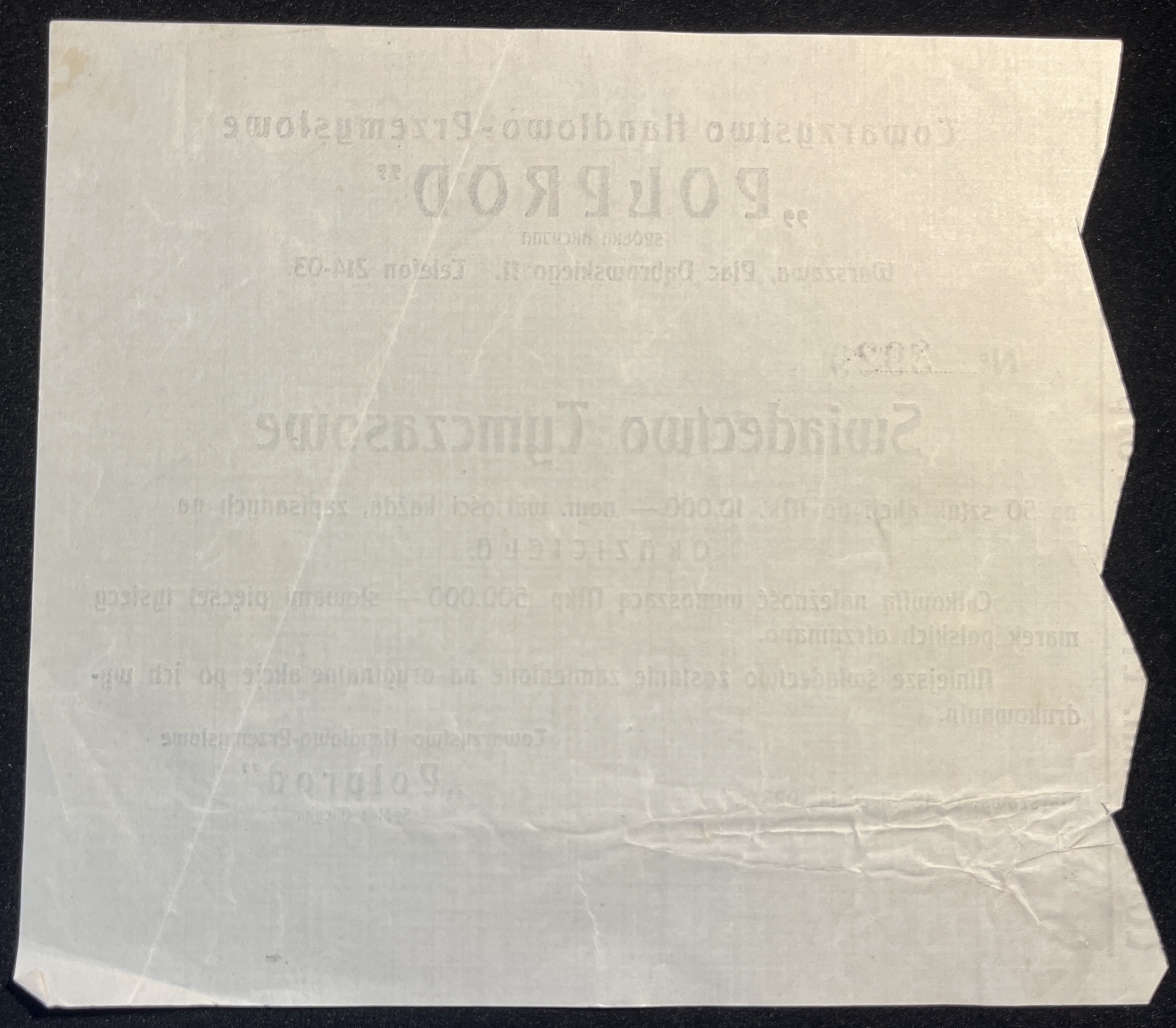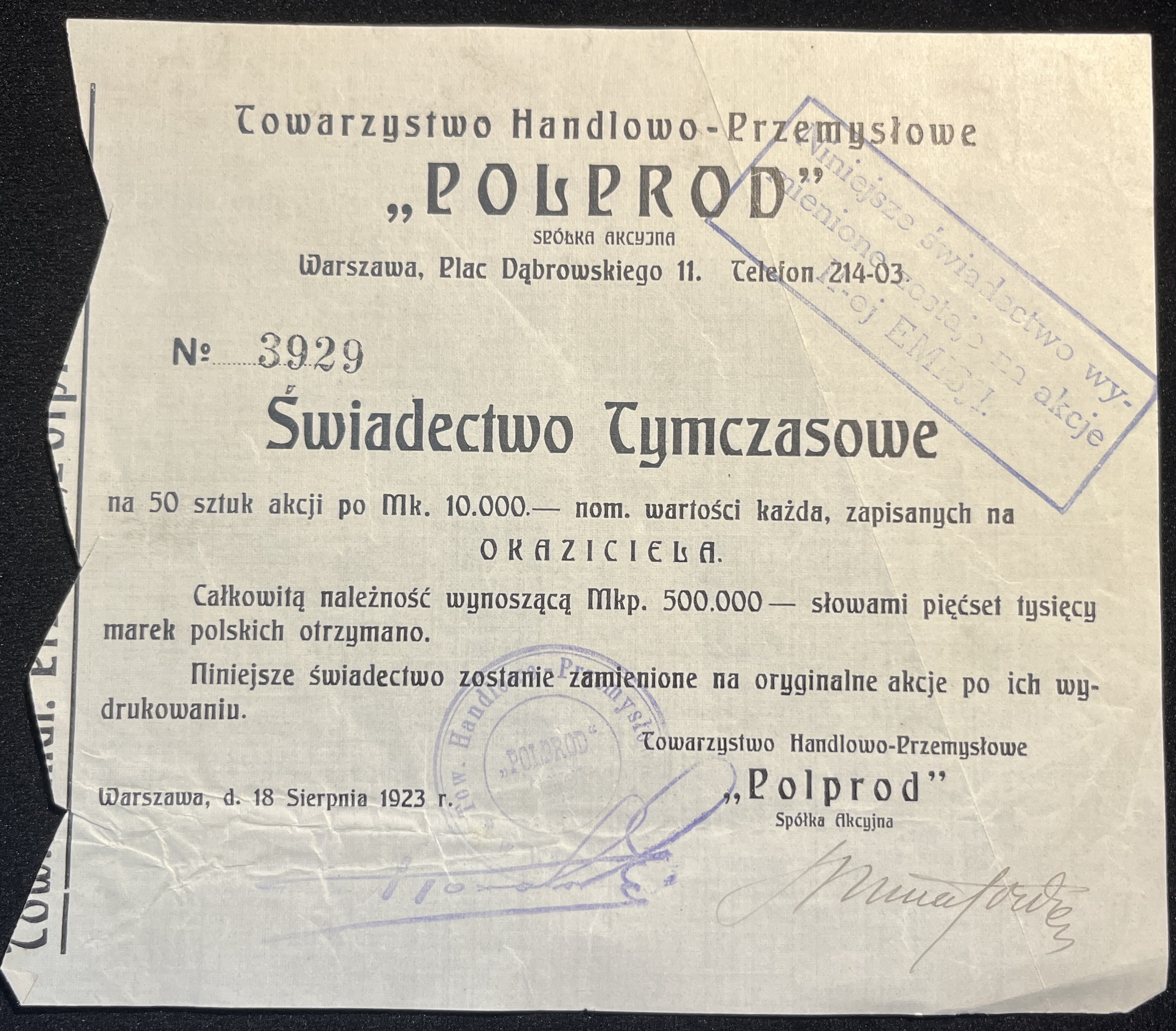 [1923] WARSZAWA. Towarzystwo Handlowo-Przemysłowe "Polprod". Świadectwo Tymczasowe na 50 sztuk akcji po Mk. 10.000.- nom. wartości każda, zapisanych na okaziciela.