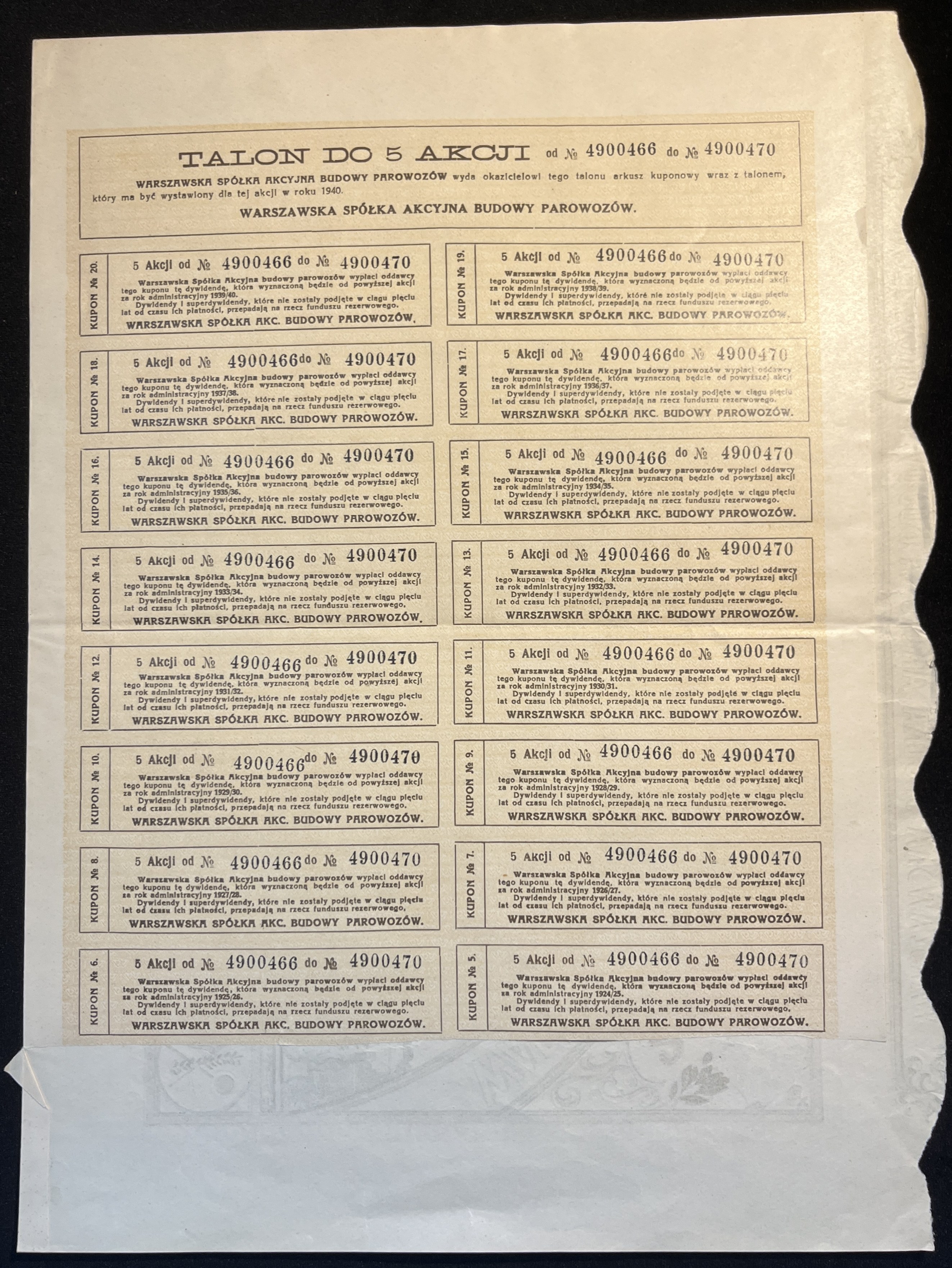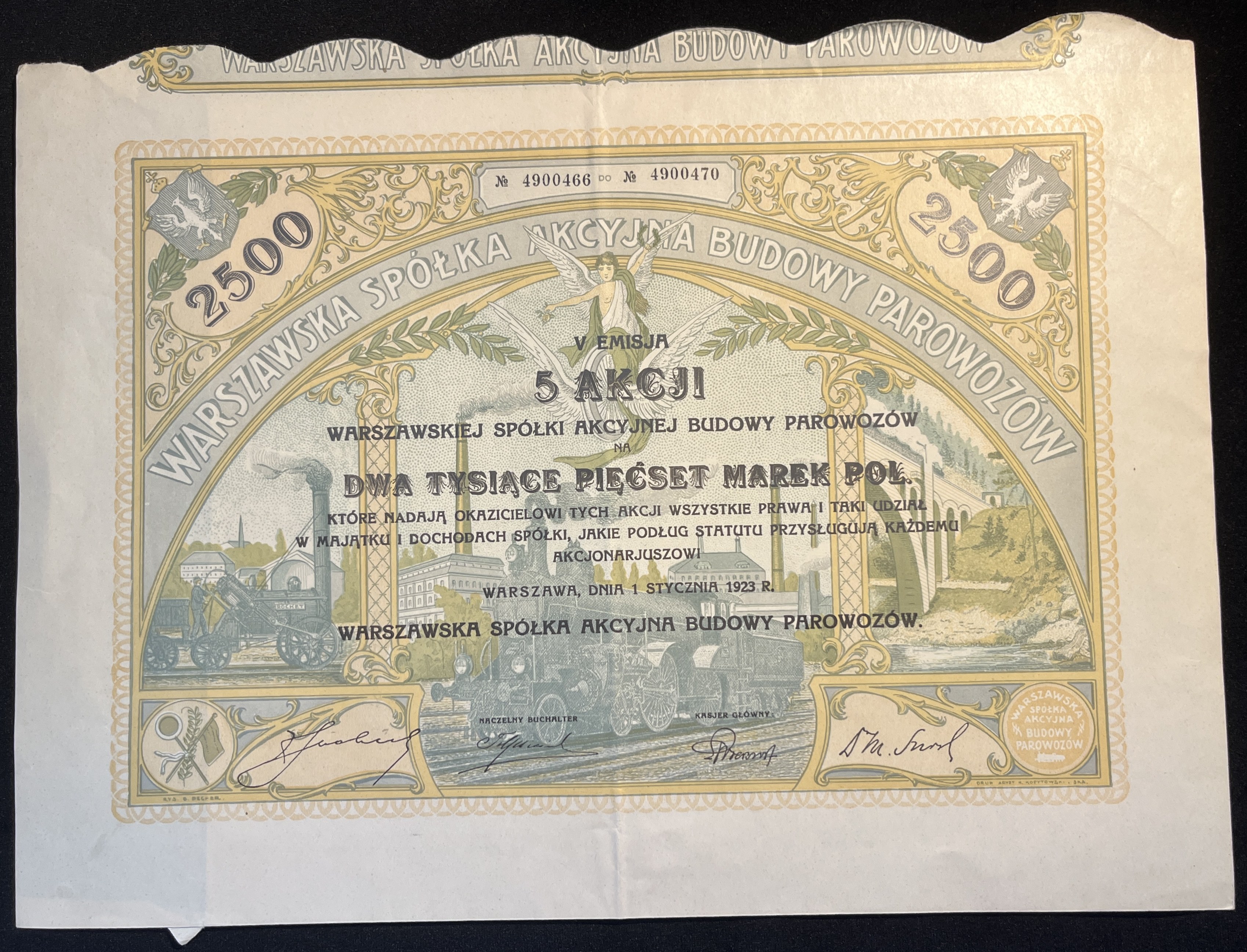 [1923] WARSZAWA. Warszawska Spółka Akcyjna Budowy Parowozów. V emisja. Na dwa tysiące pięćset marek polskich.