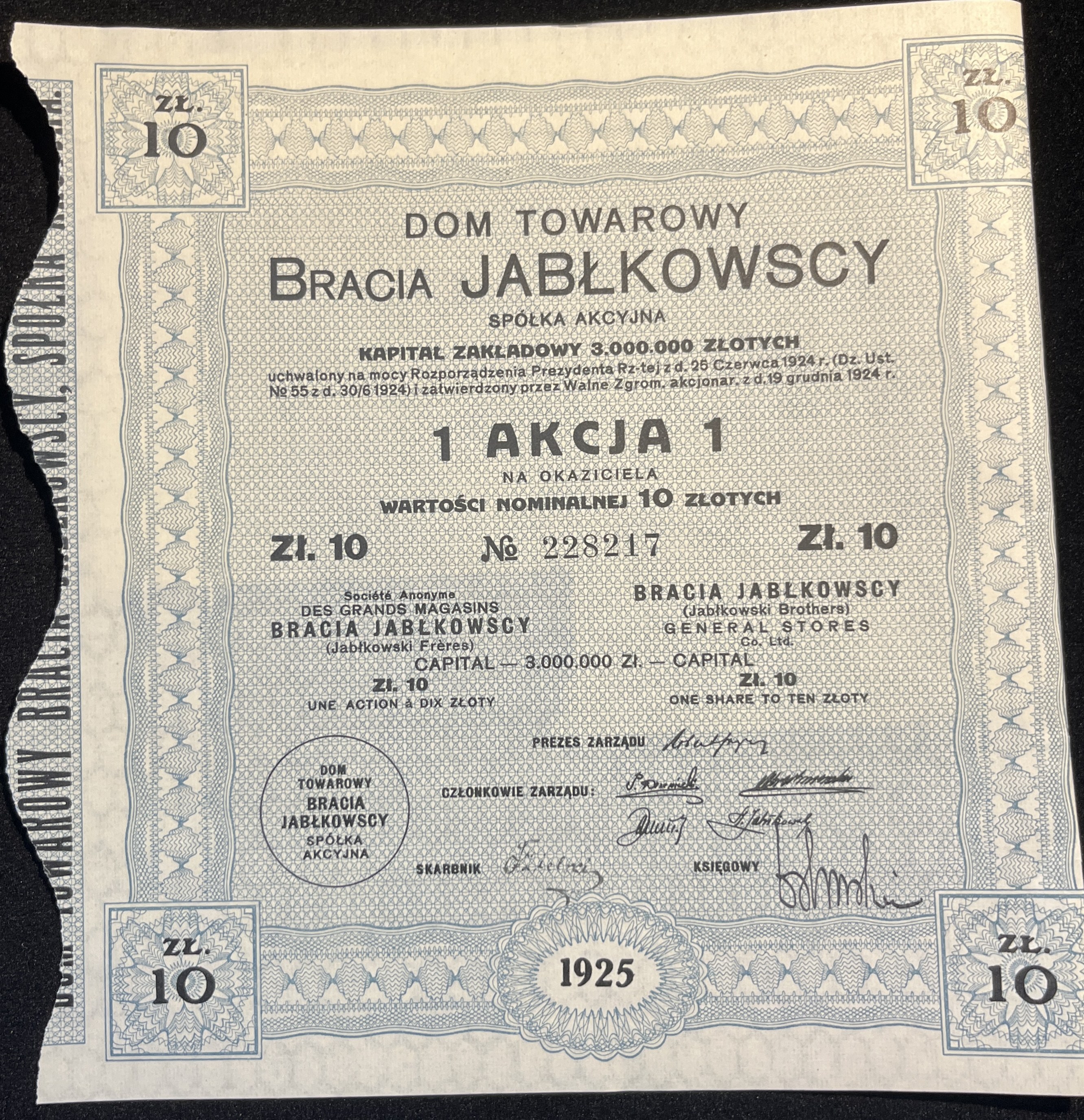 [1925] WARSZAWA. Dom Towarowy Bracia Jabłkowscy. 1 akcja na okaziciela wartości nominalnej 10 złotych.