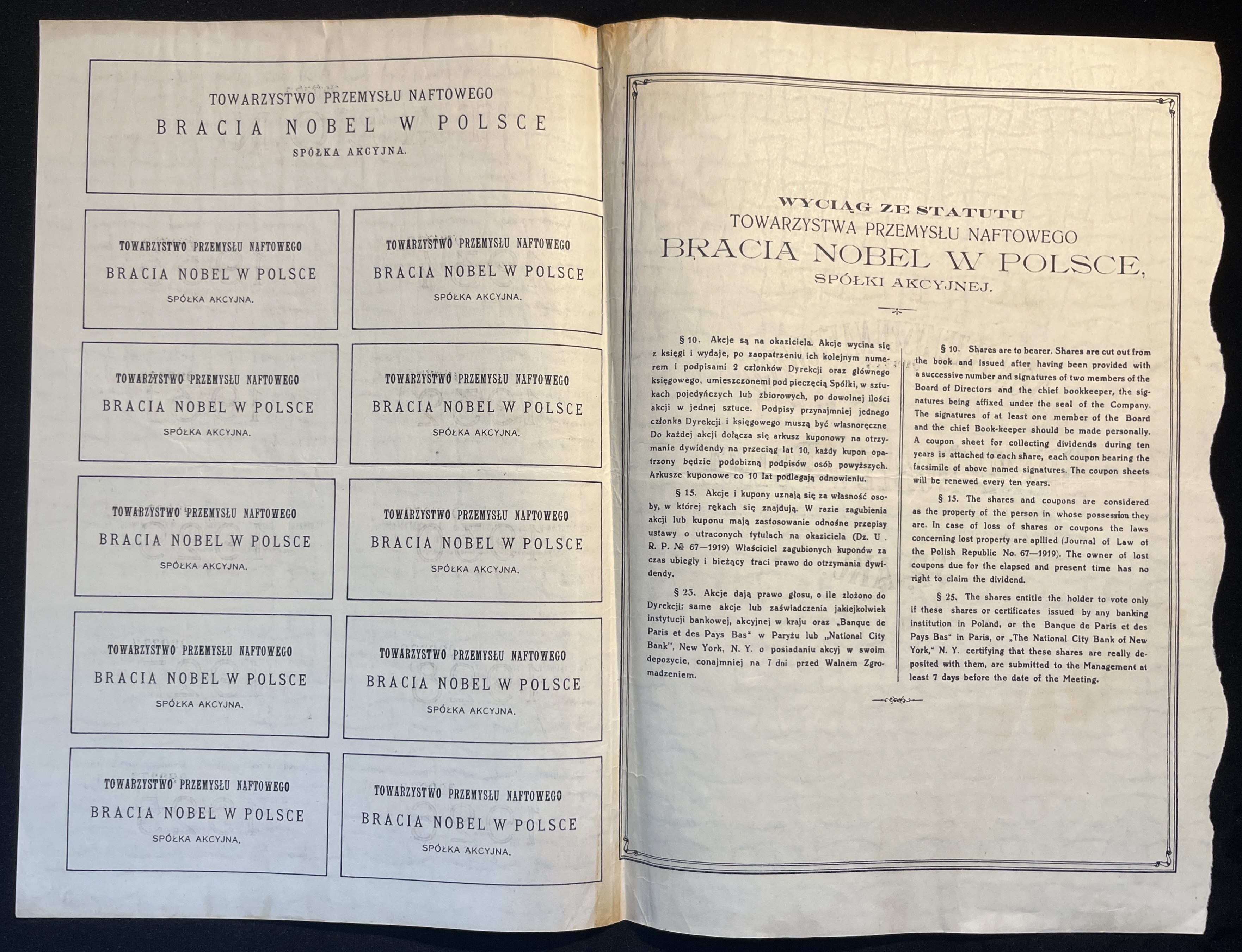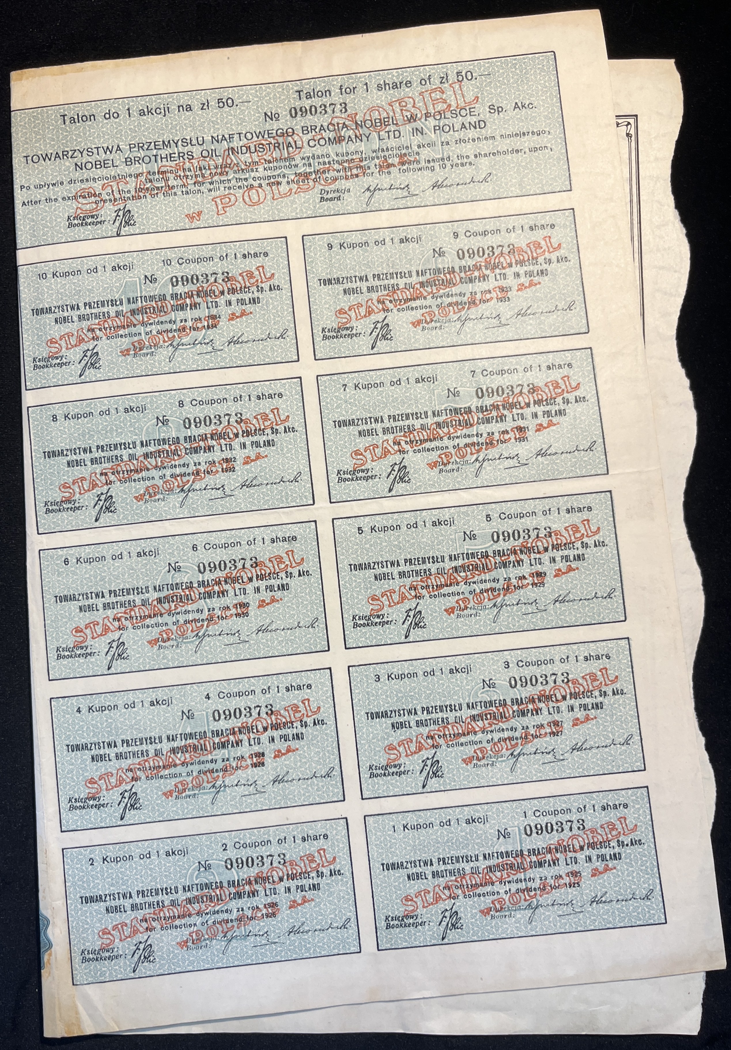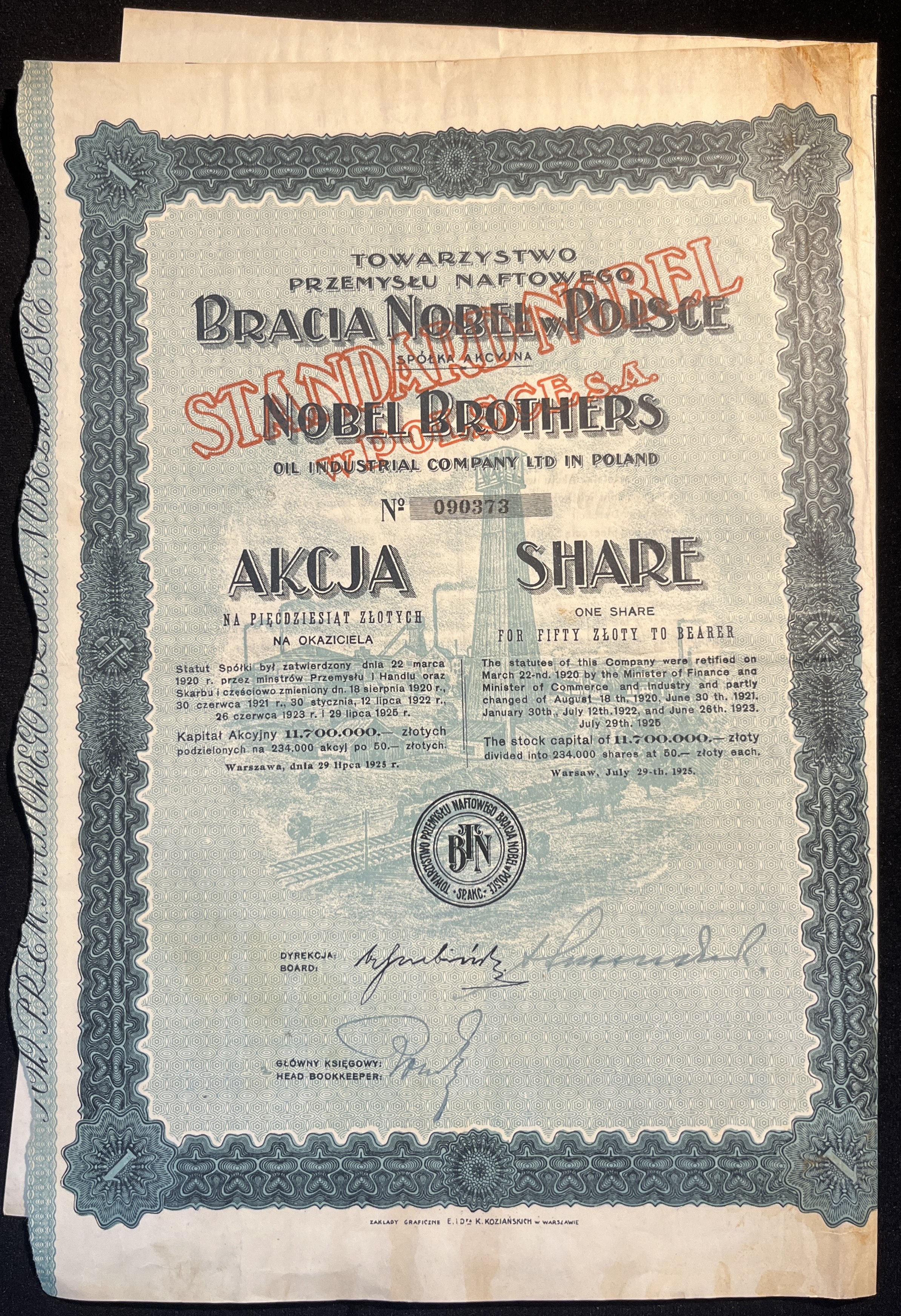 [1925] WARSZAWA. Towarzystwo Przemysłu Naftowego Bracia Nobel w Polsce. Akcja na pięćdziesiąt złotych na okaziciela.