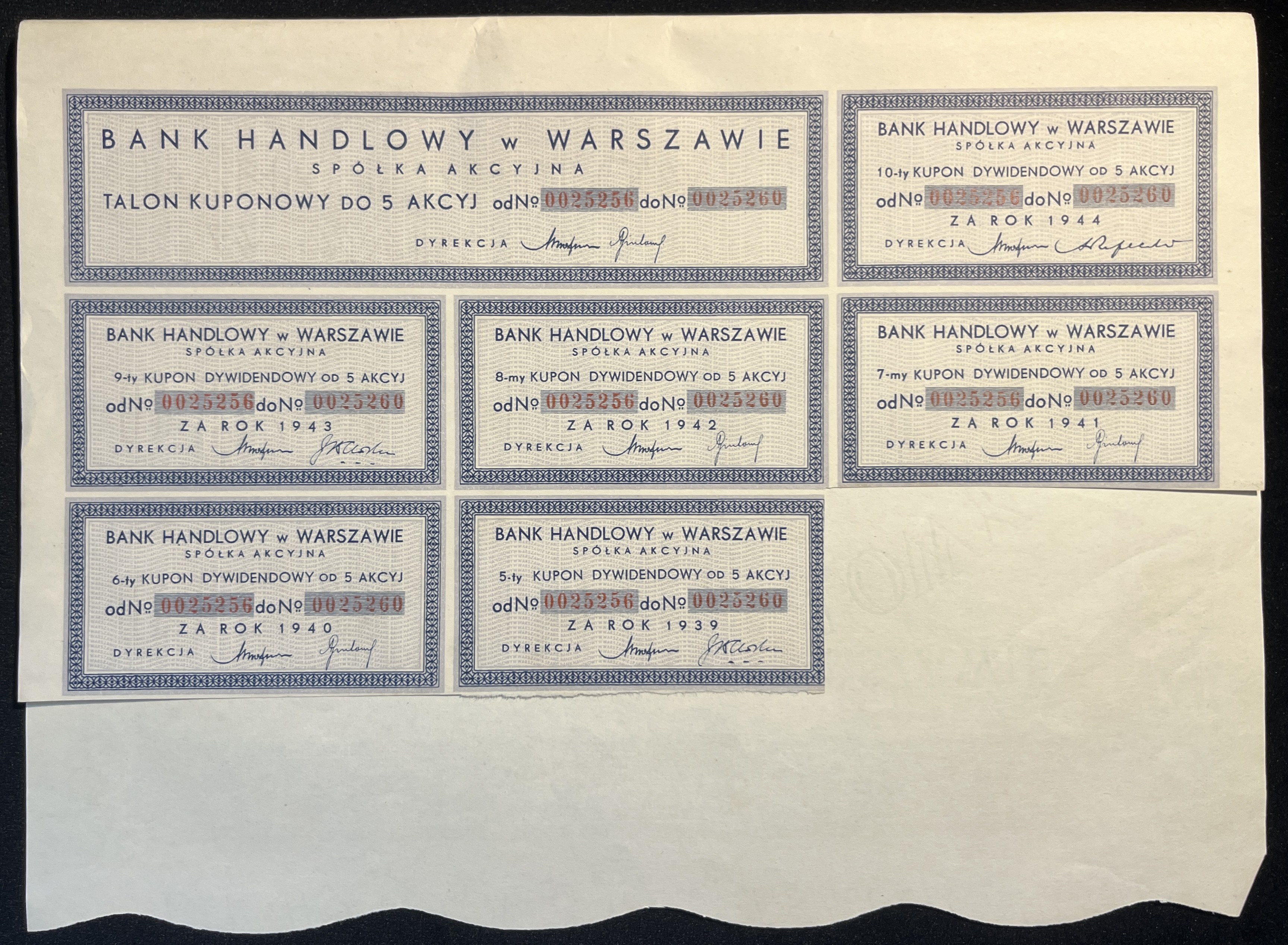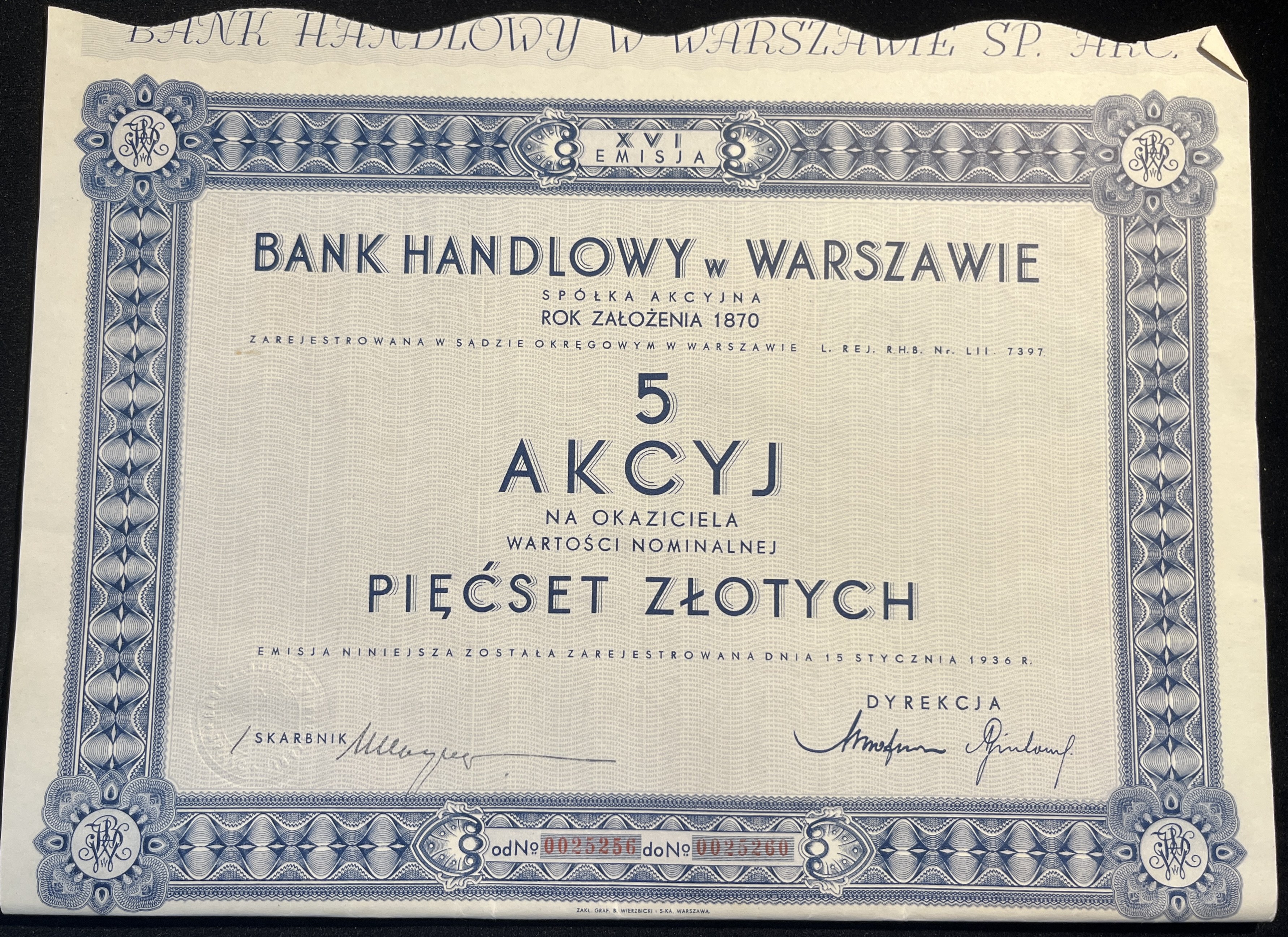 [1936] WARSZAWA. Bank Handlowy w Warszawie. 5 akcyj na okaziciela wartości nominalnej pięćset złotych.