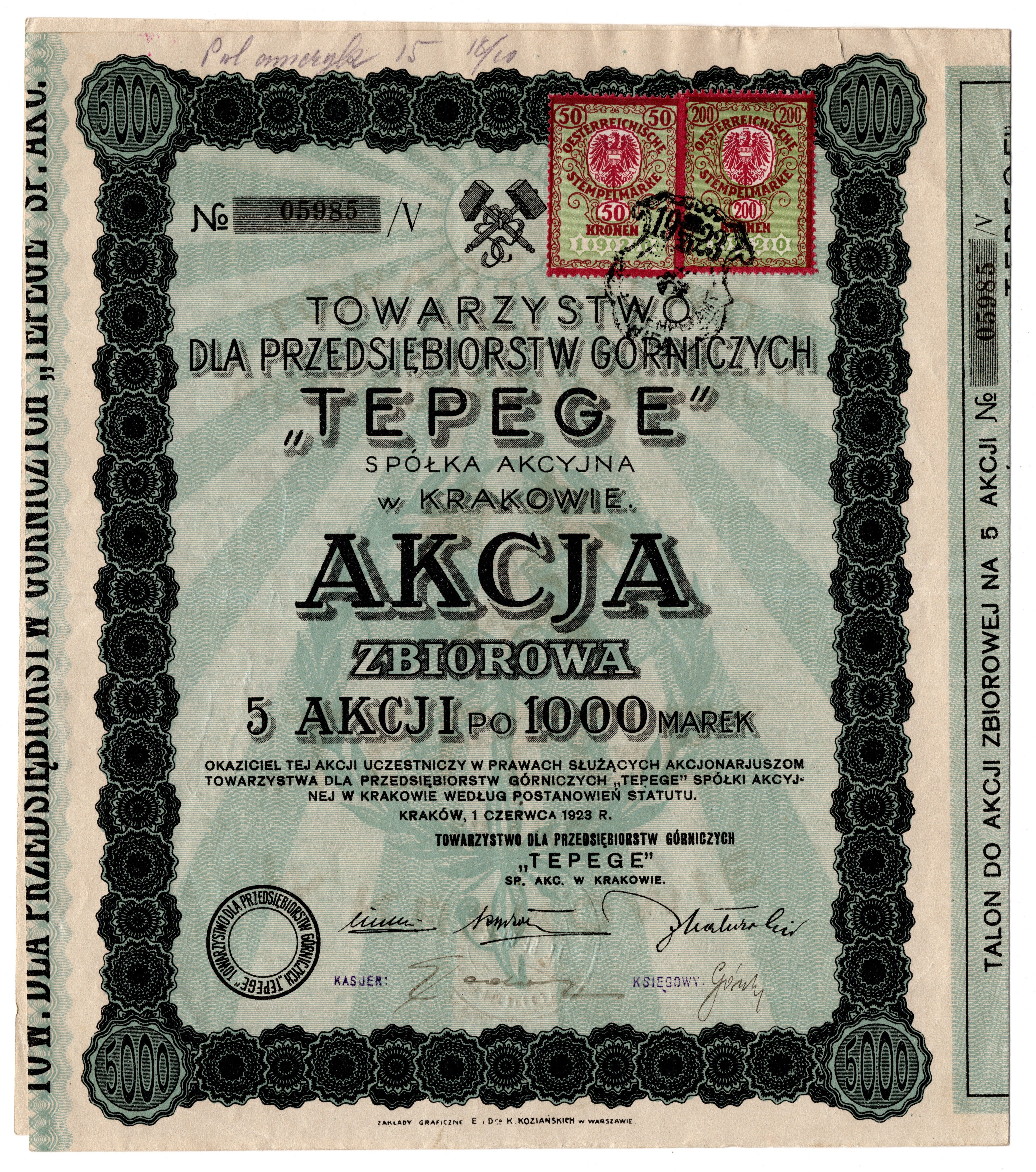 Akcja Towarzystwo dla Przedsiębiorstw Górniczych "TEPEGE" w Krakowie 5 akcji po 1000 marek polskich, 1923